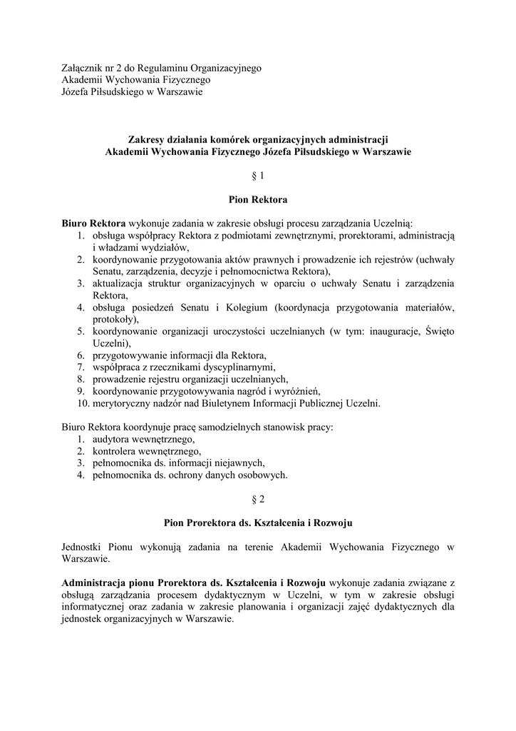 Załącznik nr 2 do Regulaminu Organizacyjnego Akademii Wychowania Fizycznego Józefa Piłsudskiego w Warszawie Zakresy działania komórek organizacyjnych administracji Akademii Wychowania Fizycznego Józefa Piłsudskiego w Warszawie §1 Pion Rektora Biuro Rektora wykonuje zadania w zakresie obsługi procesu zarządzania Uczelnią: 1. obsługa współpracy Rektora z podmiotami zewnętrznymi, prorektorami, administracją i władzami wydziałów, 2. koordynowanie przygotowania aktów prawnych i prowadzenie ich rejestrów (uchwały Senatu, zarządzenia, decyzje i pełnomocnictwa Rektora), 3. aktualizacja struktur organizacyjnych w oparciu o uchwały Senatu i zarządzenia Rektora, 4. obsługa posiedzeń Senatu i Kolegium (koordynacja przygotowania materiałów, protokoły), 5. koordynowanie organizacji uroczystości uczelnianych (w tym: inauguracje, Święto Uczelni), 6. przygotowywanie informacji dla Rektora, 7. współpraca z rzecznikami dyscyplinarnymi, 8. prowadzenie rejestru organizacji uczelnianych, 9. koordynowanie przygotowywania nagród i wyróżnień, 10. merytoryczny nadzór nad Biuletynem Informacji Publicznej Uczelni. Biuro Rektora koordynuje pracę samodzielnych stanowisk pracy: 1. audytora wewnętrznego, 2. kontrolera wewnętrznego, 3. pełnomocnika ds. informacji niejawnych, 4. pełnomocnika ds. ochrony danych osobowych. §2 Pion Prorektora ds. Kształcenia i Rozwoju Jednostki Pionu wykonują zadania na terenie Akademii Wychowania Fizycznego w Warszawie. Administracja pionu Prorektora ds. Kształcenia i Rozwoju wykonuje zadania związane z obsługą zarządzania procesem dydaktycznym w Uczelni, w tym w zakresie obsługi informatycznej oraz zadania w zakresie planowania i organizacji zajęć dydaktycznych dla jednostek organizacyjnych w Warszawie. Dział Planowania i Organizacji Studiów: 1. planowanie i organizowanie zajęć dydaktycznych w ramach uchwalonych przez rady wydziałów planów studiów w obiektach i salach dydaktycznych w Warszawie, 2. rozliczanie nauczycieli akademickich w ramach pensum i godzin ponadwymiarowych z wykonanych zajęć dydaktycznych oraz dostarczanie tych informacji do innych działów, 3. planowanie wykorzystanie obiektów i sal dydaktycznych na potrzeby procesu dydaktycznego i dostarczanie informacje o ich wykorzystaniu do innych działów, 4. opracowywanie zbiorowych sprawozdań z zadań dydaktycznych wykonywanych w ramach pensum i godzin ponadwymiarowych oraz dostarczanie tych informacje do innych działów. Centrum Informatyczne: 1. obsługa techniczna łączy i sieci wewnętrznych Uczelni, 2. programowanie i rozwój wewnętrznej sieci komputerowej, 3. administrowanie siecią komputerową Uczelni, 4. usuwanie drobnych usterek i awarii sprzętu komputerowego i oprogramowania, 5. gospodarowanie i zarządzanie sprzętem komputerowym, 6. opracowywanie i wdrażanie systemów komputerowych dla potrzeb Uczelni §3 Pion Prorektora ds. Studenckich Jednostki Pionu wykonują zadania na terenie Akademii Wychowania Fizycznego w Warszawie. Administracja pionu Prorektora ds. Studenckich wykonuje zadania związane z obsługą współpracy uczelni z samorządem studentów, samorządem doktorantów, organizacjami studenckimi i doktoranckimi za wyjątkiem studenckich kół naukowych, przyznawaniem świadczeń pomocy materialnej dla studentów i doktorantów oraz załatwianiem indywidualnych spraw studenckich związanych z tokiem studiów oraz sportem studenckim. Dział Nauczania i Spraw Studenckich: Zespół ds. Kształcenia i Spraw Studenckich: 1. opracowywanie projektów regulaminów i zarządzeń w zakresie dydaktyki, rekrutacji na studia oraz spraw studenckich, 2. wykonywanie zadań związanych z uczelnianym systemem zapewniania jakości kształcenia, 3. zarządzanie i obsługa elektronicznego programu antyplagiatowego, 4. prowadzenie jednolitego albumu studenta oraz księgi dyplomów, 5. opracowywanie sprawozdań z działalności dydaktycznej Uczelni i spraw studenckich, 6. obsługa procesu wydawania elektronicznej legitymacji studenckiej, 7. wykonywanie zadań w zakresie procesu przyznawania świadczeń stypendialnych, 8. współpraca ze środowiskiem studenckim i doktoranckim w zakresie działalności kulturalnej, rekreacyjnej i sportowej. Zespół ds. Rekrutacji, Promocji i Informacji: 1. wykonywanie zadań związanych z organizacją i realizacją procesu rekrutacji na studia, 2. planowanie oraz realizacja działań promocyjnych w zakresie oferty edukacyjnej Uczelni oraz procesu rekrutacji, 3. opracowywanie oraz udostępnianie informacji o ofercie edukacyjnej Uczelni i innych działaniach w Akademii, 4. administrowanie witryną internetową Uczelni, 5. planowanie kosztów oraz rozliczanie wydatków związanych z procesem rekrutacji na studia oraz promocją Uczelni. Biuro Karier: 1. współpracowanie z Wojewódzkim Urzędem Pracy oraz innymi podmiotami w zakresie pozyskiwania ofert pracy dla studentów i absolwentów Uczelni, 2. gromadzenie i udostępnianie ofert pracy i informacji o pracodawcach, 3. organizowanie i przeprowadzanie warsztatów związanych z problematyką zatrudnienia, 4. prowadzenie doradztwa zawodowego dla studentów i absolwentów Uczelni, 5. zbieranie i udostępnianie informacji o stażach krajowych i zagranicznych dla studentów i absolwentów, 6. realizowanie działań promocyjnych w zakresie własnej działalności. Zespół Tańca Ludowego: 1. wykonywanie zadań związanych z prowadzeniem ciągłej działalności szkoleniowej z zakresu tańca ludowego, 2. organizowanie koncertów, obozów szkoleniowych, wyjazdów artystycznych, 3. współpracowanie z urzędami państwowymi, samorządowymi, instytucjami kulturalnymi, środowiskiem zespołów folklorystycznych itp. w zakresie kultury studenckiej. §4 Pion Prorektora ds. Nauki i Współpracy Międzynarodowej Jednostki Pionu wykonują zadania na terenie Akademii Wychowania Fizycznego w Warszawie. Administracja pionu Prorektora ds. Nauki i Współpracy Międzynarodowej wykonuje zadania