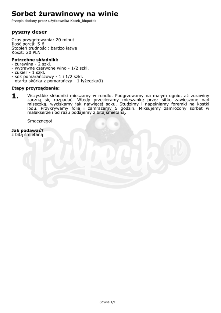 Sorbet żurawinowy na winie Przepis dodany przez użytkownika Kotek_kłopotek pyszny deser Czas przygotowania: 20 minut Ilość porcji: 5-6 Stopień trudności: bardzo łatwe Koszt: 20 PLN Potrzebne składniki: - żurawina - 2 szkl. - wytrawne czerwone wino - 1/2 szkl. - cukier - 1 szkl. - sok pomarańczowy - 1 i 1/2 szkl. - otarta skórka z pomarańczy - 1 łyżeczka(i) Etapy przyrządzania: 1. Wszystkie składniki mieszamy w rondlu. Podgrzewamy na małym ogniu, aż żurawiny zaczną się rozpadać. Wtedy przecieramy mieszankę przez sitko zawieszone nad miseczką, wyciskamy jak najwięcej soku. Studzimy i napełniamy foremki na kostki lodu. Przykrywamy folią i zamrażamy 5 godzin. Miksujemy zamrożony sorbet w malakserze i od razu podajemy z bitą śmietaną. Smacznego! Jak podawać? z bitą śmietaną Strona 1/1