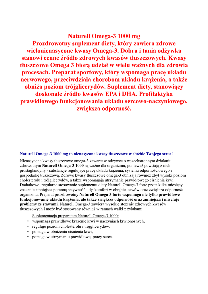 Naturell Omega-3 1000 mg Prozdrowotny suplement diety, który zawiera zdrowe wielonienasycone kwasy Omega-3. Dobra i tania odżywka stanowi cenne źródło zdrowych kwasów tłuszczowych. Kwasy tłuszczowe Omega 3 biorą udział w wielu ważnych dla zdrowia procesach. Preparat sportowy, który wspomaga pracę układu nerwowego, przeciwdziała chorobom układu krążenia, a także obniża poziom trójglicerydów. Suplement diety, stanowiący doskonałe źródło kwasów EPA i DHA. Profilaktyka prawidłowego funkcjonowania układu sercowo-naczyniowego, zwiększa odporność. Naturell Omega-3 1000 mg to nienasycone kwasy tłuszczowe w służbie Twojego serca! Nienasycone kwasy tłuszczowe omega-3 zawarte w odżywce o wszechstronnym działaniu zdrowotnym Naturell Omega-3 1000 są ważne dla organizmu, ponieważ powstają z nich prostaglandyny - substancje regulujące pracę układu krążenia, systemu odpornościowego i gospodarkę tłuszczową. Zdrowe kwasy tłuszczowe omega-3 obniżają również zbyt wysoki poziom cholesterolu i trójglicerydów, a także wspomagają utrzymanie prawidłowego ciśnienia krwi. Dodatkowo, regularne stosowanie suplementu diety Naturell Omega-3 forte przez kilka miesięcy znacznie zmniejsza poranną sztywność i dyskomfort w obrębie stawów oraz zwiększa odporność organizmu. Preparat prozdrowotny Naturell Omega-3 forte wspomaga nie tylko prawidłowe funkcjonowanie układu krążenia, ale także zwiększa odporność oraz zmniejsza i niweluje problemy ze stawami. Naturell Omega-3 zawiera wysokie stężenie zdrowych kwasów tłuszczowych i może być stosowany również w ramach walki z żylakami. • • • • Suplementacja preparatem Naturell Omega-3 1000: wspomaga prawidłowe krążenie krwi w naczyniach krwionośnych, reguluje poziom cholesterolu i trójglicerydów, pomaga w obniżeniu ciśnienia krwi, pomaga w utrzymaniu prawidłowej pracy serca. Działanie oraz zastosowanie kwasów tłuszczowych Omega-3 od Naturell to nie tylko profilaktyka chorób serca i układu krążenia. Badania wykazały, że główną przyczyną problemów z sercem i układem krążenia jest tzw. "stwardnienie tętnic", powstałe na skutek szkodliwych zmian w ściankach tętnic. Naczynia krwionośne stopniowo twardnieją, zwęża się ich światło, co zaburza naturalny przepływ krwi. Płytki krwi przyłączają się do tak zmienionych ścianek tętnic, zbijają się w skrzep i krew przestaje płynąć. Nienasycone kwasy tłuszczowe omega-3 zawarte w silnym i skutecznym suplemencie Naturell Omega-3 1000 obniżają agregację płytek krwi, czyli ich skłonność do budowy zakrzepów. Dla kogo dedykowany jest tran w kapsułkach Naturell Omega-3 forte? Osoby o podwyższonym ryzyku wystąpienia nieprawidłowej kondycji serca i układu krążenia obciążone genetycznie, palące tytoń, z nadwagą lub wysokim ciśnieniem krwi - powinny wspomagać profilaktykę poprzez zwiększone spożycie ryb morskich lub regularną suplementację olejem bogatym w kwasy tłuszczowe omega-3. Osobom, których dieta jest uboga w ryby morskie, zalecamy kapsułkowany olej z ryb o wysokiej zawartości kwasów omega-3. Każda kapsułka preparatu Omega-3 1000 zawiera aż 1000 mg oleju z ryb morskich, w tym 300 mg łącznej zawartości najważniejszych kwasów z rodziny omega-3: EPA i DHA. Według najnowszych europejskich zaleceń każdego dnia powinniśmy spożywać 250 mg łącznej ilości tych dwóch kwasów. Preparat Omega-3 1000 polecany jest dla osób dorosłych ceniących szybki i wygodny sposób przyjmowania. Dzięki wysokiej zawartości oleju w 1 kapsułce pozwala w prosty sposób dbać o regularne uzupełnianie dziennej porcji kwasów omega-3. Osoby szczególnie narażone na obniżoną kondycję serca i układu krążenia mogą przyjmować więcej niż 1 kapsułkę dziennie za zgodą lekarza i według jego zaleceń. Dawkowanie oraz sposób użycia odżywki Naturell: Zaleca się stosować suplement 1 raz dziennie (1 kapsułka). Preparat najlepiej stosować podczas posiłku lub bezpośrednio przed nim. Osobom dorosłym mającym trudności z połykaniem zawartość kapsułki można wycisnąć i podawać z posiłkiem. Nie należy przekraczać zalecanej dawki. Opis i charakterystyka odżywki z Omega3: • 1 porcja = 1 kapsułka oleju z ryb • Ilość porcji w opakowaniu: 120 • Zawartość opakowania: 120 kapsułek zdrowych kwasów tłuszczowych omega 3 Skład produktu Naturell Omega-3 1000 w kapsułkach: Zawartość opakowania suplementu diety: w jednej porcji (1 kapsułka) Olej rybi (o zawartości minimum 35%kwasów omega-3) 1000 mg EPA - kwas eikozapentaenowy (18%) 180 mg DHA - kwas dokozaheksaenowy (12%) 120 mg inne kwasy omega-3 (5%) 50 mg Inne składniki Naturell Omega-3 1000: • żelatyna i glicerol (sub. do stosowania na powierzchnię), • mieszanina tokoferoli (przeciwutleniacz), • aromat cytrynowy. Zobacz pozostałe suplementy żywności i odżywki sportowe marki Naturell, znanego i cenionego wytwórcy najwyższej jakości produktów nie tylko dla sportowców. Producent doskonałego preparatu wzmacniającego odporność i wspomagającego prawidłowe działanie serca i układu krążenia - Omega 3 1000: Naturell Zobacz wszystkie suplementy diety z kategorii - nienasycone kwasy tłuszczowe omega 3, które znakomicie uzupełniają dietę ubogą w te cenne substancje. Tanie odżywki z omega 3 możesz kupić w niskiej cenie w sklepie z odżywkami sportowymi Kulturystyka.sklep.pl. Zobacz pełną ofertą sklepu na suplementy specjalne z kwasami tłuszczowymi w kapsułkach lub tabletkach. www.kulturystyka.sklep.pl