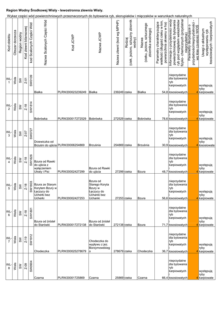 Region Wodny Środkowej Wisły - lewostronna zlewnia Wisły. PLRW200017272529 Bobrówka SW1826 SW1803 Brzuśnia Bzura od Rawki do ujścia z wyłączeniem Utraty i Pisi PLRW20002427299 Bzura od Rawki do ujścia Bzura ze Starym Korytem Bzury w Łęczycy do Ucherki bez PLRW20002427253 Ucherki Bzura od Starego Koryta Bzury w Łęczycy do Uchanki bez Uchanki SW1912 SW Z-19 Wisła Bzura od źródeł Bzura od źródeł PLRW200017272138 do Starówki do Starówki WL7 272529 rzeka 254869 rzeka 27299 rzeka 27253 rzeka Chodeczka do wypływu z jez. Borzymowskieg PLRW200025278679 o 272138 rzeka 278679 rzeka Czarna PLRW20001725869 Czarna 25869 rzeka Uwagi o aktualnym występowaniu ryb łososiowatych i karpiowatych Parametry charakteryzujące wielkość (długość cieku w km, powierzchnia akwenu w ha) Informacja o przydatności wody powierzchniowej do bytowania ryb pod względem wskaźników fizyko- chemicznych (przydatna/ nieprzydatna) Parametry decydujące o przydatności/nieprzydatności wg klas czystości WIOŚ Rodzaj (ciek, jezioro, sztuczny zbiornik wodny) Nazwa zlewni (kod wg MPHP) Nazwa (cieku, jeziora, sztucznego zbiornika wodnego) Bobrówka nieprzydatne dla bytowania ryb karpiowatych i 78,6 łososiowatych występują ryby 4 karpiowate Brzuśnia nieprzydatne dla bytowania ryb karpiowatych i 30,9 łososiowatych występują ryby 4 łososiowate Bzura nieprzydatne dla bytowania ryb karpiowatych i 48,7 łososiowatych występują ryby 4 karpiowate Bzura nieprzydatne dla bytowania ryb karpiowatych i 56,6 łososiowatych występują ryby 4 karpiowate Bzura nieprzydatne dla bytowania ryb karpiowatych i 71,7 łososiowatych występują ryby 4 karpiowate Chodeczka nieprzydatne dla bytowania ryb karpiowatych i 36,7 łososiowatych występują ryby 4 karpiowate Czarna nieprzydatne dla bytowania ryb karpiowatych i 66,4 łososiowatych występują ryby 4 karpiowate SW0904 SW Z-09 Wisła Chodeczka WL8 239249 rzeka SW1801 SW Z-18 Z-18 Wisła SW SW Z-18 WL6 Wisła WL5 Wisła Drzewiczka od Brzuśni do ujścia PLRW20006254869 WL4 Nazwa JCWP Nazwa Scalonych Części Wód Kod zlewni bilansowej kod Scalonych Części Wód Kod JCWP PLRW200023239249 Białka SW0727 SW Z-07 Wisła Bobrówka WL3 występują ryby 4 karpiowate SW1814 SW Z-18 Wisła Białka WL2 Białka nieprzydatne dla bytowania ryb karpiowatych i 54,8 łososiowatych SW0109 Obszar dorzecza Region wodny SW Z-01 WL1 Wisła Kod obiektu Wykaz części wód powierzchniowych przeznaczonych do bytowania ryb, skorupiaków i mięczaków w warunkach naturalnych Region Wodny Środkowej Wisły - lewostronna zlewnia Wisły. Kamienna od Świśliny do Przepaści Wisła od Kamiennej do Wieprza Rawka od Korabiewki (włącznie) do ujścia SW0721 SW Z-07 Wisła Pilica od Wolbórki do Drzewiczki Jeziorka od Kraski do Rowu Jeziorki Kamienna od Świśliny do PLRW200010234939 Przepaści PLRW20001723949 Klikawka PLRW200017272694 Korabiewka PLRW20001727887 Lubieńka do Rakutówki bez Rakutówki z jez. Lubieńskim PLRW200017254769 Lubocza 25549 rzeka 254729 rzeka 25879 rzeka 234939 rzeka 23949 rzeka 272694 rzeka 27887 rzeka 254769 rzeka Uwagi o aktualnym występowaniu ryb łososiowatych i karpiowatych Parametry charakteryzujące wielkość (długość cieku w km, powierzchnia akwenu w ha) Informacja o przydatności wody powierzchniowej do bytowania ryb pod względem wskaźników fizyko- chemicznych (przydatna/ nieprzydatna) Parametry decydujące o przydatności/nieprzydatności wg klas czystości WIOŚ Nazwa (cieku, jeziora, sztucznego zbiornika wodnego) Rodzaj (ciek, jezioro, sztuczny zbiornik wodny) Nazwa zlewni (kod wg MPHP) Nazwa JCWP Czarna-Cedron PLRW200017254729 Gać Jeziorka od Kraski do Rowu Jeziorki (włącznie) PLRW20001925879 Lubieńka bez Rakutówki WL16 Kod JCWP Nazwa Scalonych Części Wód Kod zlewni bilansowej kod Scalonych Części Wód SW0721 SW0902 SW0207 SW2202 SW1825 Pilica od Wolbórki do Drzewiczki PLRW20001725549 SW1915 Z-07 SW SW Z-09 Z-02 Wisła Wisła SW SW Z-22 Z-18 SW SW WL15 Z-19 WL14 Wisła WL13 Wisła WL12 Wisła WL11 Wisła Wisła od Pilicy do Narwi WL10 CzarnaCedron nieprzydatne dla bytowania ryb karpiowatych i 20,5 łososiowatych występują ryby 4 karpiowate Gać nieprzydatne dla bytowania ryb karpiowatych i 21,4 łososiowatych występują ryby 4 karpiowate Jeziorka nieprzydatne dla bytowania ryb karpiowatych i 32,6 łososiowatych występują ryby 4 karpiowate Kamienna nieprzydatne dla bytowania ryb karpiowatych i 23,1 łososiowatych występują ryby 4 karpiowate Klikawka nieprzydatne dla bytowania ryb karpiowatych i 33,7 łososiowatych występują ryby 4 karpiowate nieprzydatne dla bytowania ryb karpiowatych i 34 łososiowatych występują ryby 4 karpiowate Lubieńka nieprzydatne dla bytowania ryb karpiowatych i 39,4 łososiowatych występują ryby 4 karpiowate Lubocza nieprzydatne dla bytowania ryb karpiowatych i 37,9 łososiowatych występują ryby 4 karpiowate SW2204 Obszar dorzecza Region wodny SW Z-22 WL9 Wisła Kod obiektu Wykaz części wód powierzchniowych przeznaczonych do bytowania ryb, skorupiaków i mięczaków w warunkach naturalnych Korabiewka Region Wodny Środkowej Wisły - lewostronna zlewnia Wisły. 2721849 rzeka SW0728 SW1807 SW1809 SW1809 Pilica od Drzewiczki do ujścia z wyłączeniem Kanału Trzebieńskiego PLRW20001725269 Mleczna bez Pacynki PLRW200017254929 Mogielanka Moszczenica od źródeł do Dopł. z Basiekierza (włącznie) PLRW200017272249 Moszczenica od źródeł do dopływu z Besiekierza Mroga od źródeł Mroga od źródeł do MroŜycy do MroŜycy bez PLRW200017272345 MroŜycy (włącznie) Mroga od źródeł do MroŜycy PLRW2000172723469 MroŜyca (włącznie) 25269 rzeka 254929 rzeka 272249 rzeka 272345 rzeka 2723469 rzeka SW1804 SW Z-18 Wisła Ochnia od Ochnia od Miłonki do ujścia PLRW2000242721899 Miłonki do ujścia 2721899 rzeka WL24 Ochnia od Ochnia od źródeł źródeł do do Miłonki bez Miłonki bez PLRW2000232721839 Miłonki Miłonki 2721839 rzeka Uwagi o aktualnym występowaniu ryb łososiowatych i karp