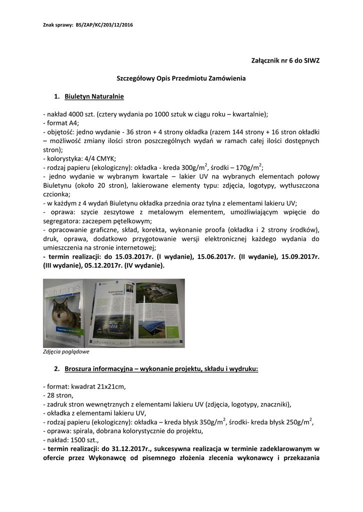 Znak sprawy: BS/ZAP/KC/203/12/2016 Załącznik nr 6 do SIWZ Szczegółowy Opis Przedmiotu Zamówienia 1. Biuletyn Naturalnie - nakład 4000 szt. (cztery wydania po 1000 sztuk w ciągu roku – kwartalnie); - format A4; - objętość: jedno wydanie - 36 stron + 4 strony okładka (razem 144 strony + 16 stron okładki – możliwość zmiany ilości stron poszczególnych wydań w ramach całej ilości dostępnych stron); - kolorystyka: 4/4 CMYK; - rodzaj papieru (ekologiczny): okładka - kreda 300g/m2, środki – 170g/m2; - jedno wydanie w wybranym kwartale – lakier UV na wybranych elementach połowy Biuletynu (około 20 stron), lakierowane elementy typu: zdjęcia, logotypy, wytłuszczona czcionka; - w każdym z 4 wydań Biuletynu okładka przednia oraz tylna z elementami lakieru UV; - oprawa: szycie zeszytowe z metalowym elementem, umożliwiającym wpięcie do segregatora: zaczepem pętelkowym; - opracowanie graficzne, skład, korekta, wykonanie proofa (okładka i 2 strony środków), druk, oprawa, dodatkowo przygotowanie wersji elektronicznej każdego wydania do umieszczenia na stronie internetowej; - termin realizacji: do 15.03.2017r. (I wydanie), 15.06.2017r. (II wydanie), 15.09.2017r. (III wydanie), 05.12.2017r. (IV wydanie). Zdjęcia poglądowe 2. Broszura informacyjna – wykonanie projektu, składu i wydruku: - format: kwadrat 21x21cm, - 28 stron, - zadruk stron wewnętrznych z elementami lakieru UV (zdjęcia, logotypy, znaczniki), - okładka z elementami lakieru UV, - rodzaj papieru (ekologiczny): okładka – kreda błysk 350g/m2, środki- kreda błysk 250g/m2, - oprawa: spirala, dobrana kolorystycznie do projektu, - nakład: 1500 szt., - termin realizacji: do 31.12.2017r., sukcesywna realizacja w terminie zadeklarowanym w ofercie przez Wykonawcę od pisemnego złożenia zlecenia wykonawcy i przekazania Znak sprawy: BS/ZAP/KC/203/12/2016 materiałów. Zdjęcie poglądowe 3. Broszura informacyjna – wykonanie projektu, składu i wydruku (trzy wzory w trakcie trwania umowy): - format: kwadrat 21x21cm, - nakład: 3000 szt./po 1000 szt. w ramach jednego wzoru, - 3 wzory, - 8 stron, - zadruk z dwóch stron w kolorze, - papier kreda błysk 130g/m2, - okładka z elementami lakieru UV 170g/m2, - termin realizacji: do 31.12.2017, sukcesywna realizacja w terminie zadeklarowanym w ofercie przez Wykonawcę od pisemnego złożenia zlecenia wykonawcy i przekazania materiałów. Zdjęcie poglądowe 4. Broszura informacyjna – wykonanie projektu, składu i wydruku (cztery wzory w trakcie trwania umowy) - format: 2xDL łamany do DL, - nakład: 4500 szt./po 1500 szt. w ramach jednego wzoru, - 3 wzory, - papier: kreda błysk z elementami lakieru UV 130g/m2, - termin realizacji: do 31.12.2017, sukcesywna realizacja w terminie zadeklarowanym w ofercie przez Wykonawcę od pisemnego złożenia zlecenia wykonawcy i przekazania materiałów. Znak sprawy: BS/ZAP/KC/203/12/2016 Zdjęcia poglądowe 5. Wizytówki firmowe - ilość: 30 x 150 sztuk, dwustronne, - kolor: 4/0, - materiał: kreda błysk co najmniej 250g/m2, karton lub inny o zbliżonej gramaturze do akceptacji Zamawiającego, - format: 90x50 mm (szerokość x wysokość) lub inny dostosowany do formatu wizytówek, - wykończenie: powlekanie folią, ewentualnie delikatnie karbowany papier, elementy lakieru UV na obu stronach (po uzgodnieniu z Zamawiającym), - opracowanie graficzne: skład, korekta, druk, - termin realizacji: do 31.12.2017, sukcesywna realizacja w terminie zadeklarowanym w ofercie przez Wykonawcę od pisemnego złożenia zlecenia wykonawcy i przekazania materiałów. Zdjęcie poglądowe 6. Kalendarze książkowe na 2018 rok – format zbliżony do A4 - nakład: 500 sztuk, - narożniki kalendarium proste, - kalendarium tygodniowe, - wielkość bloku minimum 200x285mm (szerokość x wysokość), zaś maksimum 210x297mm (szerokość x wysokość), przy czym stosunek długości krótszej krawędzi do dłuższej musi wynosić między 0,69 a 0,72 po zaokrągleniu matematycznym, - perfor narożników kalendarium, - papier biały, - minimalna gramatura papieru 80g/m2, - nadruk – 2 kolory, - notes adresowy, - standardowa część informacyjna i mapy, w tym mapy Polski, - wykończenie: blok szyty, Znak sprawy: BS/ZAP/KC/203/12/2016 - pierwsze 4 kartki kalendarza w formie tzw. doklejki – papier kredowy co najmniej 100g/m2, druk kolorowy z przejściami tonalnymi, treść dostarczona Wykonawcy przez Zamawiającego, OKŁADKA: - okleina skóropodobna, miękka, matowa, o strukturze gładkiej i właściwościach termoprzebarwialnych, - kolor tworzywa: zielony jasny, błękit lub granatowy (2 warianty kolorystyczne - do akceptacji Zamawiającego), - okładka piankowa, - narożniki okładki zaokrąglone, - tłoczenie na okładce: rok 2018 oraz logotyp Zamawiającego (Zamawiający zaakceptuje propozycję wzoru tłoczenia dla roku), WSTĄŻKA - tkana z nazwą WFOŚiGW w Szczecinie – nadruk kolorowy, - szerokość 10mm, - kolor zielony, - termin realizacji: do 31.09.2017. Zdjęcie poglądowe 7. Kalendarz biurkowy tygodniowy stojący na 2018 rok - ilość sztuk: 500, - podstawa: 210x194mm; tektura lita 1,75mm, oklejona papierem typu kraft Eco lub równoważnym, - nadruk CMYK 4+0 (zadrukowany tylko tył kalendarza), - kalendarz: 205x100mm/12 kartek; nadruk 4+0, papier 80g/m2, - notesy: 100x75mm/50 kartek oraz 50x75/50 kartek; nadruk: 4+0 bez spadów, papier samoprzylepny ekologiczny offset 80g/m2 bez nadruku, - termin realizacji: do 31.09.2017. Zdjęcie poglądowe 8. Kalendarz ścienny jednodzielny na 2018 rok Znak sprawy: BS/ZAP/KC/203/12/2016 - ilość sztuk: 100, - druk: 4+4 (CMYK), - format kalendarza: około 310x420mm (szerokość x wysokość), - główka oraz plecy stanowiące jednorodną całość z linią bigowania powyżej kalendarium, dzięki czemu łatwo złożyć go na pół; główka z otworem umożliwiającym powieszenie kalendarza, drukowana z elementami lakieru UV na kartonie o gramaturze co najmniej 250g/m2, dodatkowo foliowan