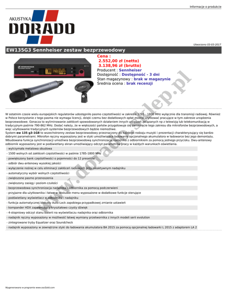 Informacje o produkcie Utworzono 03-03-2017 EW135G3 Sennheiser zestaw bezprzewodowy Cena : 2.552,00 zł (netto) 3.138,96 zł (brutto) le p. p l Producent : Sennheiser Dostępność : Dostępność - 3 dni Stan magazynowy : brak w magazynie Średnia ocena : brak recenzji - wytrzymała metalowa obudowa .d or ad o. sk W ostatnim czasie wielu europejskich regulatorów udostępniło pasmo częstotliwości w zakresie 1785 - 1800 MHz wyłącznie dla transmisji radiowej. Również w Polsce korzystanie z tego pasma nie wymaga licencji, dzięki czemu bez dodatkowych opłat można użytkować pracujące w tym zakresie urządzenia bezprzewodowe. Oznacza to wyliminowanie zakłóceń spowodowanych działaniem innych urządzeń związanych np z telewizją lub telekomunikacją w tradycyjnym paśmie 790-862 MHz. Dodać należy, że w większości państw przygotowuje się zamknięcie tego zakresu dla mikrofonów bezprzewodowych, a więc użytkowanie tradycyjnych systemów bezprzewodowych będzie niemożliwe. System ew 135 g3-1G8 to wszechstronny zestaw bezprzewodowy przeznaczony do każdego rodzaju muzyki i prezentacji charakteryzujący się bardzo dobrymi parametrami. Mikrofon ręczny wyposażony jest w styki umożliwiające ładowanie opcjonalnego akumulatora w ładowarce bez jego demontażu. Wbudowana funkcja synchronizacji umożliwia bezprzewodową synchronizację nadajnika z odbiornikiem za pomocą jednego przycisku. Dwu-antenowy odbiornik wyposażony jest w podświetlany ekran umożliwiający odczyt parametrów pracy w każdych warunkach oświetlania. - 1500 wolnych od zakłóceń częstotliwości w paśmie 1785-1800 MHz - powiększony bank częstotliwości o pojemności do 12 presetów - odbiór dwu-antenowy wysokiej jakości - wyłączenie nośnej w celu eliminacji zakłóceń radiowych przy nieaktywnym nadajniku - automatyczny wybór wolnych częstotliwości - zwiększone pasmo przenoszenia Kup mikrofon ew 135 g3-1G8 na www.sennheiser.com.pl w - zwiększony zasięg i poziom czułości - bezprzewodowa synchronizacja nadajnika i odbiornika za pomocą podczerwieni w - przyjazne dla użytkownika i łatwe w obsłudze menu wyposażone w dodatkowe funkcje sterujące - podświetlany wyświetlacz w odbiorniku i nadajniku Kup mikrofon ew 135 g3-1G8 na www.sennheiser.com.pl w - funkcja automatycznej blokady Auto-Lock zapobiega przypadkowej zmianie ustawień - kompander HDX zapewniający kryształowo czysty dźwięk - 4-stopniowy odczyt stanu baterii na wyświetlaczu nadajnika oraz odbiornika - nadajnik ręczny wyposażony w możliwość łatwej wymiany przetwornika z innych modeli serii evolution - zintegrowane tryby Equalizer oraz Soundcheck - nadajnik wyposażony w zewnętrzne styki do ładowania akumulatora BA 2015 za pomocą opcjonalnej ładowarki L 2015 z adaptorem LA 2 Wygenerowano w programie www.oscGold.com
