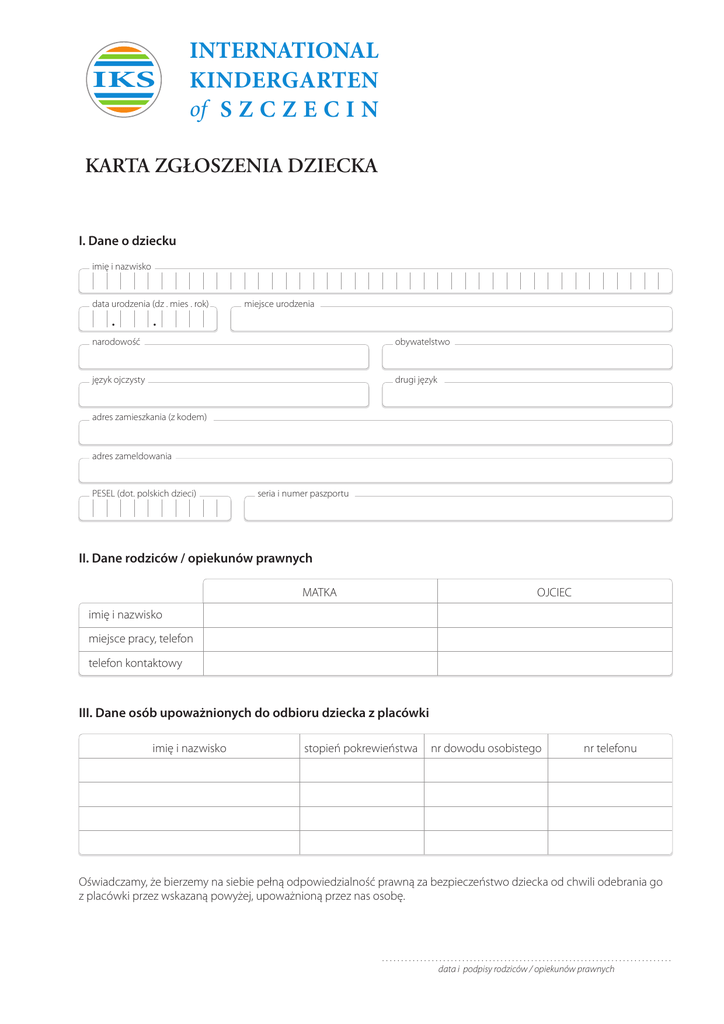formularz zgłoszenia dziecka - International Kindergarten of Szczecin
