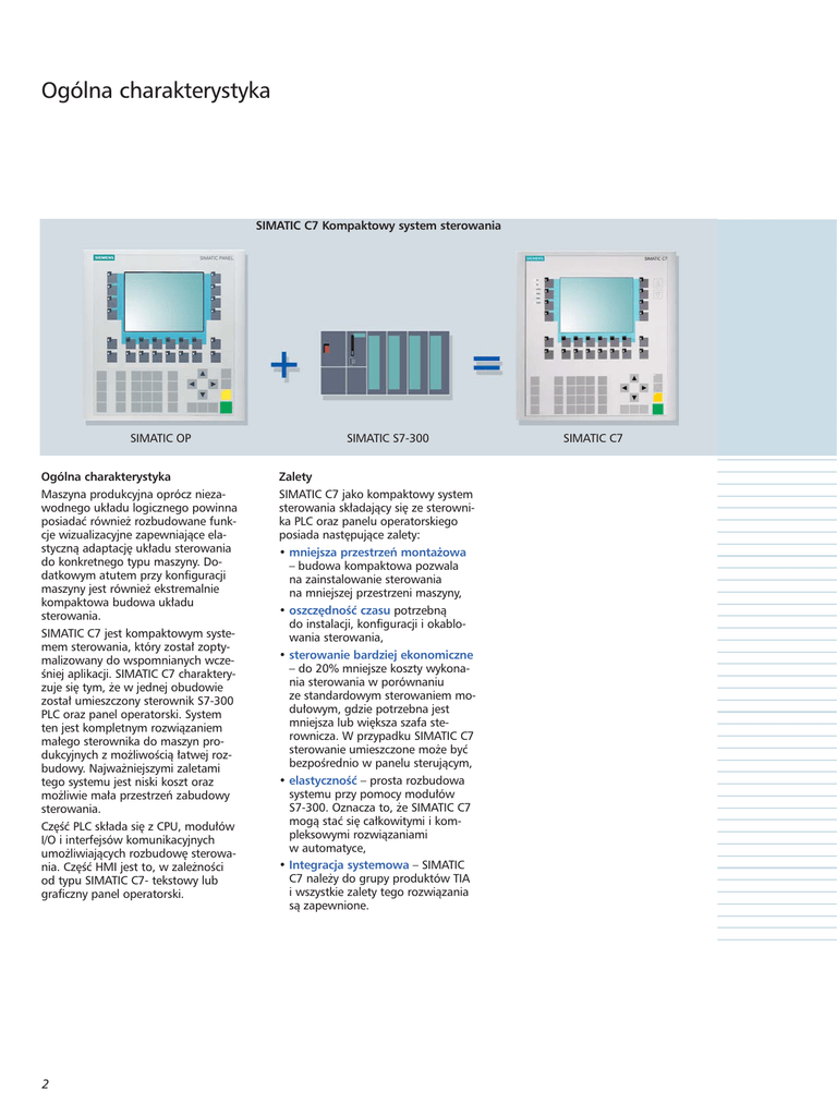 Ogólna charakterystyka SIMATIC C7 Kompaktowy system sterowania SIMATIC OP Ogólna charakterystyka Maszyna produkcyjna oprócz niezawodnego uk∏adu logicznego powinna posiadaç równie˝ rozbudowane funkcje wizualizacyjne zapewniajàce elastycznà adaptacj´ uk∏adu sterowania do konkretnego typu maszyny. Dodatkowym atutem przy konfiguracji maszyny jest równie˝ ekstremalnie kompaktowa budowa uk∏adu sterowania. SIMATIC C7 jest kompaktowym systemem sterowania, który zosta∏ zoptymalizowany do wspomnianych wczeÊniej aplikacji. SIMATIC C7 charakteryzuje si´ tym, ˝e w jednej obudowie zosta∏ umieszczony sterownik S7-300 PLC oraz panel operatorski. System ten jest kompletnym rozwiàzaniem ma∏ego sterownika do maszyn produkcyjnych z mo˝liwoÊcià ∏atwej rozbudowy. Najwa˝niejszymi zaletami tego systemu jest niski koszt oraz mo˝liwie ma∏a przestrzeƒ zabudowy sterowania. Cz´Êç PLC sk∏ada si´ z CPU, modu∏ów I/O i interfejsów komunikacyjnych umo˝liwiajàcych rozbudow´ sterowania. Cz´Êç HMI jest to, w zale˝noÊci od typu SIMATIC C7- tekstowy lub graficzny panel operatorski. 2 SIMATIC S7-300 Zalety SIMATIC C7 jako kompaktowy system sterowania sk∏adajàcy si´ ze sterownika PLC oraz panelu operatorskiego posiada nast´pujàce zalety: • mniejsza przestrzeƒ monta˝owa – budowa kompaktowa pozwala na zainstalowanie sterowania na mniejszej przestrzeni maszyny, • oszcz´dnoÊç czasu potrzebnà do instalacji, konfiguracji i okablowania sterowania, • sterowanie bardziej ekonomiczne – do 20% mniejsze koszty wykonania sterowania w porównaniu ze standardowym sterowaniem modu∏owym, gdzie potrzebna jest mniejsza lub wi´ksza szafa sterownicza. W przypadku SIMATIC C7 sterowanie umieszczone mo˝e byç bezpoÊrednio w panelu sterujàcym, • elastycznoÊç – prosta rozbudowa systemu przy pomocy modu∏ów S7-300. Oznacza to, ˝e SIMATIC C7 mogà staç si´ ca∏kowitymi i kompleksowymi rozwiàzaniami w automatyce, • Integracja systemowa – SIMATIC C7 nale˝y do grupy produktów TIA i wszystkie zalety tego rozwiàzania sà zapewnione. SIMATIC C7 Aplikacje Kompaktowy system sterowania SIMATIC C7 znajduje zastosowanie w wielu sektorach przemys∏u. Sterownik ten idealnie si´ nadaje do nast´pujàcych aplikacji: • ogólny in˝yniering maszynowy (szczególnie w konstrukcji maszyn seryjnych), • maszyny specjalne, • maszyny dla przemys∏u przetwórstwa tworzyw sztucznych i tekstylnego, • maszyny dla przemys∏u drzewnego i w wielu innych aplikacjach. Sterowanie procesem tanków za pomocà SIMATIC C7 Sterowniki SIMATIC C7 sà wykorzystywane w trudnych warunkach przemys∏owych i charakteryzujà si´: • wysokà kompatybilnoÊcià elektromagnetycznà, • du˝à wytrzyma∏oÊcià na wstrzàsy i wibracje, • pracà do 50°C bez wentylatora, • spe∏niajà wszystkie standardy mi´dzynarodowe zgodne z DIN, UL, CSA, FM, ISO 9001 i morskie. Sterowanie produkcjà kremu za pomocà C7 Mi´dzynarodowe fonty w SIMATIC C7 zwi´kszajà szans´ eksportu maszyny 3 Dedykowane wykonanie Kompaktowe systemy SIMATIC C7 sà równie˝ dost´pne w wykonaniu typu OEM. Wykonanie to umo˝liwia dostosowanie sterownika pod wzgl´dem wyglàdu i konstrukcji do maszyny w której b´dzie on zainstalowany. Dost´pne sà nast´pujàce zmiany wyglàdu sterownika SIMATIC C7: • umieszczenie logo firmy na cz´Êci czo∏owej sterownika, • zmiana kolorystyki p∏yty czo∏owej, przycisków i logo firmy wed∏ug palety kolorów RAL lub Panteon, • zmiana opisów na przyciskach. C7 kompaktowy system sterowania z dedykowanymi wykonaniami 4 Przeglàd w∏aÊciwoÊci urzàdzeƒ C7 Zintegrowane komponenty C7-613 C7-635 Touch CPU CPU 313C CPU 314C-2 DP CPU 315C-2 DP CPU pami´ç robocza 32 KB 64 KB 128 KB Programowanie cz´Êci PLC STEP 7 Wbudowane wejÊcia /wyjÊcia 24 DI/16 DO 4 AI + 1PT100 2 AO 24 DI / 16 DO 4 AI + 1 PT 100 2 AO 4 liczniki 4 wyjÊcia impulsowe Interfejs komunikacyjny MPI MPI DP (master lub slave) Panel operatorski – TP 170B (6”) WyÊwietlacz 4 x 20 znaków STEP 7 RozdzielczoÊç Konfiguracja HMI C7-635 Key OP 170B (6”) C7-636 Touch C7-636 Key TP 270 (10”) OP 270 (6”) Grafika wektorowa monochromatyczna 320 x 240 pikseli Grafika wektorowa (kolorowa) 640 x 480 pikseli Grafika wektorowa (kolorowa) 320 x 240 pikseli ProTool/Lite lub lepszy, WinCC flexible Compact lub lepszy WinCC flexible Compact lub lepszy 5 Budowa sterownika Urzàdzenia z rodziny SIMATIC C7 posiadajà szereg specyficznych rozwiàzaƒ konstrukcyjnych wyró˝niajàcych spoÊród sterowników SIMATIC. C7-636 Touch z interfejsem PROFIBUS Obudowa i monta˝ • wytrzyma∏a, kompaktowa obudowa metalowo- plastikowa zapewniajàca wysoki stopieƒ ochrony (IP65 – od strony czo∏owej), • mo˝liwoÊç instalacji bezpoÊrednio na pulpitach i szafach sterowniczych, • bezproblemowa wymiana C7 dzi´ki zastosowaniu wyjmowanych listew zaciskowych s∏u˝àcych do okablowania sygna∏ów wejÊciowo-wyjÊciowych. Panel czo∏owy • wytrzyma∏a klawiatura membranowa, • czytelny, podÊwietlany panel graficzny LCD (blue mode), • diody statusu cz´Êci sterownikowej panelu. Interfejsy • interfejs MPI – mo˝liwoÊç komunikacji z innymi uczestnikami sieci MPI, • interfejs drukarkowy 1) np. do wydruku danych produkcyjnych, • interfejs PROFIBUS DP 1) master / slave, 12 Mbit/s Interfejs do rozbudowy systemu C7 za pomocà modu∏ów S7-300 (rozbudowa zewn´trzna lub bezpoÊrednio na tylnym panelu 1) C7). 6 Zintegrowane wejÊcia / wyjÊcia • wejÊcia cyfrowe1), • wyjÊcia cyfrowe1), • wejÊcia analogowe1), • wyjÊcia analogowe1), Zintegrowane funkcje technologiczne • liczniki1), • wyjÊcia inpulsowe1), • pomiar cz´stotliwoÊci1), • pozycjonowanie kontrolowane1), • kontrola obiegu1). 1) w zale˝noÊci od modelu C7 Charakterystyka CPU oraz panela operatorskiego Mo˝liwoÊci sterownicze wbudowanego PLC W SIMATIC C7 jako cz´Êç sterownicza zosta∏o wykorzystane CPU S7-300. Rozwiàzanie to z