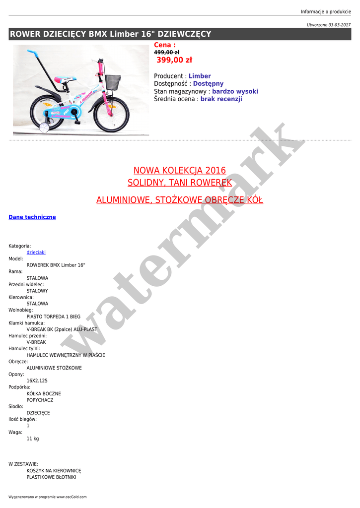 Informacje o produkcie Utworzono 03-03-2017 ROWER DZIECIĘCY BMX Limber 16" DZIEWCZĘCY Cena : 499,00 zł 399,00 zł er m ar k Producent : Limber Dostępność : Dostępny Stan magazynowy : bardzo wysoki Średnia ocena : brak recenzji NOWA KOLEKCJA 2016 SOLIDNY, TANI ROWEREK ALUMINIOWE, STOŻKOWE OBRĘCZE KÓŁ Dane techniczne w at Kategoria: dzieciaki Model: ROWEREK BMX Limber 16" Rama: STALOWA Przedni widelec: STALOWY Kierownica: STALOWA Wolnobieg: PIASTO TORPEDA 1 BIEG Klamki hamulca: V-BREAK BK (2palce) ALU-PLAST Hamulec przedni: V-BREAK Hamulec tylni: HAMULEC WEWNĘTRZNY W PIAŚCIE Obręcze: ALUMINIOWE STOŻKOWE Opony: 16X2.125 Podpórka: KÓŁKA BOCZNE POPYCHACZ Siodło: DZIECIĘCE Ilość biegów: 1 Waga: 11 kg W ZESTAWIE: KOSZYK NA KIEROWNICĘ PLASTIKOWE BŁOTNIKI Wygenerowano w programie www.oscGold.com Dostępne opcje ROWER DZIECIĘCY BMX Limber 16" DZIEWCZĘCY w at er m ar k » Kolor Ramy: różowo-biały, różowo-fioletowy.