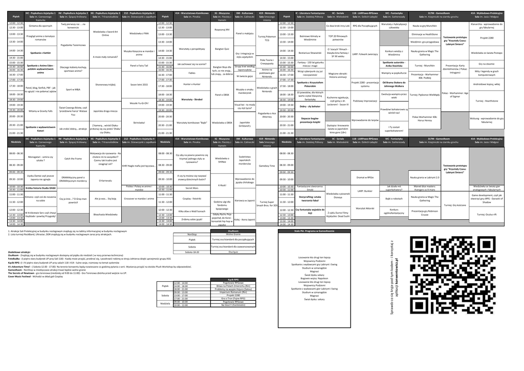 Piątek IIIC - Popkultura Azjatycka 1 Sala im. Czerwonego Kapturka 12:00 - 12:30 12:30 - 13:00 13:00 - 13:30 13:30 - 14:00 Gintama dla opornych IM - Popkultura Azjatycka 2 Sala im. Śpiącej Królewny IIG - Popkultura Azjatycka 3 212 - Popkultura Azjatycka 4 Sala im. 7 Krasnoludków Sala im. Dziewczynki z zapałkami 414 - Warsztatowo-Komiksowa Sala im. Pinokia IG - Muzyczna Sala im. Flecisty z Hameln IIM - Kulturowa Sala im. Calineczki 419 - Nintendo Sala Smoczego imienia 12:00 - 12:30 Twój pierwszy raz ....na konwencie Wiedzówka z FMA IC - Literatura Fantastyczna Sala im. Dalekiej Północy Piątek IIC - Seriale Sala im. Wieloskórki 118 - LARPowo-RPGowa Sala im. Dzikich Łabędzi IVC - Fantastyka Sala im. Szeherezady Co dwa kroki inny Loki RPG dla Początkujących Warsztaty z hybrydyzacji człowieka 12:00 - 12:30 12:30 - 13:00 Wiedzówka z Sword Art Online Przegląd anime o tematyce romansów Piątek 12:30 - 13:00 Rozpoznaj MV Panel o makijażu 13:00 - 13:30 Turniej Pokemon TCG 13:30 - 14:00 13:00 - 13:30 13:30 - 14:00 Baśniowe klimaty w Wiedźminie TOP 20 filmowych potworów Bestiariusz Słowiański O 'starych' filmach klasyka kina fantasy i SF XX wieku 317M - GamesRoom Sala im. Księżniczki na ziarnku grochu Eliminacje w HeathStone Wiedźmin: gra przygodowa A może mały romansik? 14:30 - 15:00 Muzyka klasyczna w mandze i anime 16:30 - 17:00 15:00 - 15:30 Spotkanie z Anime Eden polskim wydawnictwem anime Panel o Fairy Tail Dlaczego kobiety kochają sportowe anime? Panel, blog, fanfick, PBF - jak to ugryść i nie połamać zębów Sezon letni 2015 Witamy w Gravity Falls Świat Czworga Bóstw, czyli 'przedziwne harce' Watase Yuu Spotkanie z wydawnictwem Kotori IIIC - Popkultura Azjatycka 1 Sala im. Czerwonego Kapturka Monogatari - szmira czy sztuka ? Jak zrobić dobrą… atrakcje IM - Popkultura Azjatycka 2 Sala im. Śpiącej Królewny Catch the Frame 08.30 - 09.00 Z kamerą… wśród Otakuprzkonaj się czy jesteś 'Otaku' czy Otaku. Anime na podstawie gier Nintendo Panel o DBSK Muzyka o smaku mandarynek Motywacja do rysowania - Na cholere mi to wszystko!? Czemu tak trudno jest osiągnąć cel? Niedziela 08:00 - 08.30 DRAMAtyczny panel o DRAMAtycznym mordercy 09:30 - 10:00 Polska i Polacy w anime i mandze Krótka historia Studia Ghibli 10:00 - 10:30 10:30 - 11:00 Czy ja śnie...? D.Gray-man powrócił Ale ja was... Się boję Crossover w mandze i anime Warsztaty komiksowe "Bajki" W Królestwie Serc czyli chwyć 12:30 - 13:00 Keyblade i powitaj Przygodę! 13:00 - 13:30 13:30 - 14:00 14:00 - 14:30 Bleachasta Wiedzówka 12:30 - 13:00 13:00 - 13:30 13:30 - 14:00 14:00 - 14:30 1. Atrakcje Sali Prelekcyjnej w budynku noclegowym znajduję się na tablicy informacyjnej w budynku noclegowym 2. Lista turnieji RockBand, Ultrastar, DDR znajdują się w budynku noclegowym zaraz przy atrakcjach. Dodatkowe atrakcje: OsuRoom - Znajduję się w budynku noclegowym dostepny od piątku do niedzieli ( w nocy przerwa techniczna) FotoBudka - (I piętro stary budynek UP przy Sali 118) - Każdy może przyjść, przebrać się, i pozdrowić rodzinę w stroju żołnierza dzięki uprzejmości grupy ASG Czy aby na pewno powinno się trzymać jednego stylu w rysowaniu? IG - Muzyczna Sala im. Flecisty z Hameln IIM - Kulturowa Sala im. Calineczki Niedziela Nauka grania w Magic The Gathering Spotkanie autorskie Anika Stasińska Turniej - Munchkin Wampiry w popkulturze Magiczne obrazki: Historia animacji 17:30 - 18:00 Spotkanie z Krzysztofem Piskorskim 10 powodów, dla których warto czytać klasyczną fantastykę Dobry - zły bohater Projekt 2280 - prezentacja systemu Kuchenne egzekucje, czyli gotuj z dr. Lecterem! - Sezon III 20:00 - 20:30 Niedziela Wprowadzenie do języka chińskiego K-Rock! Gameboy Time Siepacze bogówprezentacja książki Turniej: Pędzonce Wielbłądy Gry na steamie Mity i legendy w grach komputerowych Pokaz - Warhammer: Age of Sigmar Turniej - Hearthstone Podstawy Improwizacji Dystopia i kreowanie świata w japońskim kinie gore (18+) IC - Literatura Fantastyczna Sala im. Dalekiej Północy Pokaz Warhammer 40k: Horus Heresy Wprowadzenie do larpów IIC - Seriale Sala im. Wieloskórki Wolsung - wprowadzenie do gry fabularnej I Ty zostań superbohaterem! 118 - LARPowo-RPGowa Sala im. Dzikich Łabędzi IVC - Fantastyka Sala im. Szeherezady 317M - GamesRoom Sala im. Księżniczki na ziarnku grochu 414 - Wykładowo-Prelekcyjna Sala im. Jasia i Małgosi Testowanie prototypu gry "Kryształy Czasu: Labirynt Śmierci" Godzina ulgi dla fandomu kpopowego Kierowca w Japonii Kilka słów o WebToonach Gdyby Rychu Peja pojechał‚ do Korei Kolej - ikona Japonii koreański hip hop w pigułce NonStop OsuRoom Wolne Granie Piątek Turniej osu!standard dla początkujących Sobota Turniej osu!standard dla zaawansowanych Sobota 18-20 Osu!quiz Kącik RPG Pogotowie RPGowe Bitwa na Polach Zmierzchu (Rin) Problemy na wyspie Hojuro (Satou) Imperium Romanum (Rin) Projekt 2280 Gra o Tron (Fajne RPG) Pogotowie RPGowe Na Stos!!! (Fechmistrz) Dramat w RPGie 09:30 - 10:00 11:00 - 11:30 12.00 - 14.00 14.00 - 18.00 18.00 - 21.00 09.00 - 13.00 13.00 - 17.00 17.00 - 21.00 09.00 - 10.00 10.00 - 12.00 Prezentacja: Karty dżentelmenów / Pokaz: Intryganci Androidowe kopiuj, wklej 08.30 - 09.00 10:00 - 10:30 10:30 - 11:00 Secret Wars Zróbmy sobie język! Wiedzówka ze świata Postapo Od Brama Stokera do Johnnego Walkera Ewolucja wampira przez wieki Projekt 2280 Prawdziwi bohaterowie są wśród nas! 20:30 - 21:00 419 - Nintendo Sala Smoczego imienia Prezentacja - Warhammer 40k: Podbój 09:00 - 09:30 A czy ty możesz się nazywać znawcą dziecinnych baśni? It's Adventure Time! - ( Sobota 12.00 - 17.00) Na terenie konwentu będą rozwieszane co godzinę pytania z serii. Wystarczy przyjść na stoisko Plush Workshop by odpowiedzieć. GamesRoom - NonStop w miedzyczasie atrakcji trwać będzie wolne granie The Secrets of Newtown - gra terenowa (niedzielę od 9:00 do 11:00) - Gra Terenowa zbiórka przed wejście na UP. Cover Music 