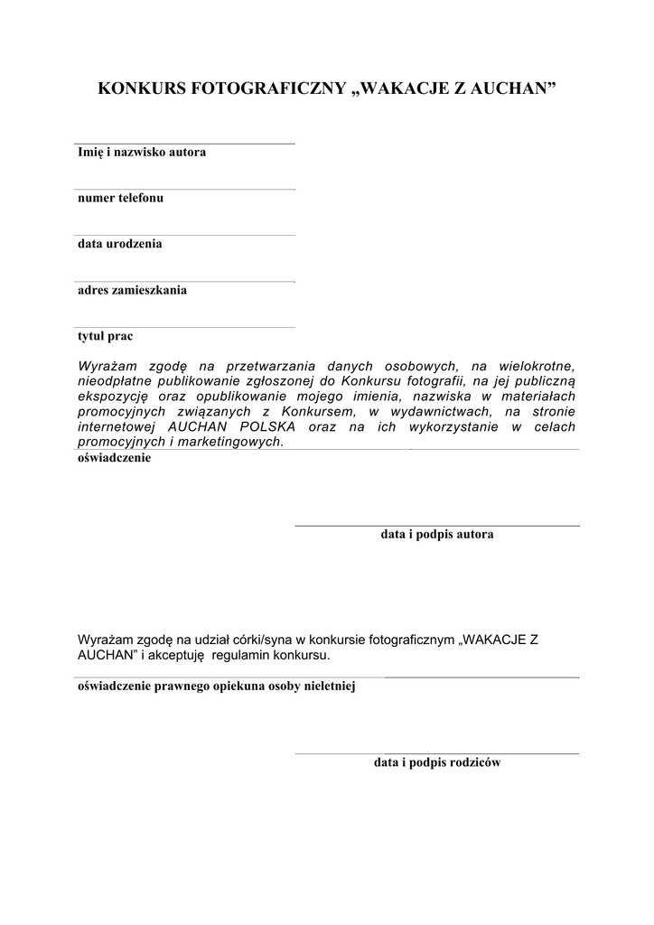 KONKURS FOTOGRAFICZNY „WAKACJE Z AUCHAN” Imię i nazwisko autora numer telefonu data urodzenia adres zamieszkania tytuł prac Wyrażam zgodę na przetwarzania danych osobowych, na wielokrotne, nieodpłatne publikowanie zgłoszonej do Konkursu fotografii, na jej publiczną ekspozycję oraz opublikowanie mojego imienia, nazwiska w materiałach promocyjnych związanych z Konkursem, w wydawnictwach, na stronie internetowej AUCHAN POLSKA oraz na ich wykorzystanie w celach promocyjnych i marketingowych. oświadczenie data i podpis autora Wyrażam zgodę na udział córki/syna w konkursie fotograficznym „WAKACJE Z AUCHAN” i akceptuję regulamin konkursu. oświadczenie prawnego opiekuna osoby nieletniej data i podpis rodziców