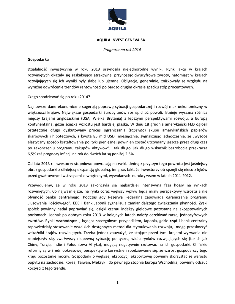 AQUILA INVEST GENEVA SA Prognoza na rok 2014 Gospodarka Działalność inwestycyjna w roku 2013 przynosiła niejednorodne wyniki. Rynki akcji w krajach rozwiniętych okazały się zaskakująco atrakcyjne, przynosząc dwucyfrowe zwroty, natomiast w krajach rozwijających się ich wyniki były słabe lub ujemne. Obligacje, generalnie, zniżkowały ze względu na wyraźne odwrócenie trendów rentowności po bardzo długim okresie spadku stóp procentowych. Czego spodziewać się po roku 2014? Najnowsze dane ekonomiczne sugerują poprawę sytuacji gospodarczej i rozwój makroekonomiczny w większości krajów. Największe gospodarki Europy znów rosną, choć powoli. Istnieje wyraźna różnica między krajami anglosaskimi (USA, Wielka Brytania) z lepszymi perspektywami rozwoju, a Europą kontynentalną, gdzie ścieżka wzrostu jest bardziej płaska. W dniu 18 grudnia amerykański FED ogłosił ostatecznie długo dyskutowany proces ograniczania (tapering) skupu amerykańskich papierów skarbowych i hipotecznych, z kwotą 85 mld USD miesięcznie, sygnalizując jednocześnie, że „wysoce elastyczny sposób kształtowania polityki pieniężnej powinien zostać utrzymany jeszcze przez długi czas po zakończeniu programu zakupów aktywów”, tak długo, jak długo wskaźnik bezrobocia przekracza 6,5% zaś prognozy inflacji na rok do dwóch lat są poniżej 2.5%. Od lata 2013 r. inwestorzy stopniowo powracają na rynki. Jedną z przyczyn tego powrotu jest jaśniejszy obraz gospodarki z silniejszą ekspansją globalną, inną zaś fakt, że inwestorzy otrząsnęli się nieco z lęków przed gwałtownymi wstrząsami zewnętrznymi, wywołanych eurokryzysem w latach 2011-2012. Przewidujemy, że w roku 2013 zakończyła się najbardziej intensywna faza hossy na rynkach rozwiniętych. Co najważniejsze, na rynki coraz większy wpływ będą miały perspektywy wzrostu a nie płynność banku centralnego. Podczas gdy Rezerwa Federalna zapowiada ograniczanie programu „luzowania ilościowego”, EBC i Bank Japonii sygnalizują zamiar dalszego zwiększania płynności. Zyski spółek powinny nadal poprawiać się, dzięki czemu indeksy giełdowe pozostaną na akceptowalnych poziomach. Jednak po dobrym roku 2013 w kolejnych latach należy oczekiwać raczej jednocyfrowych zwrotów. Rynki wschodzące i, będąca szczególnym przypadkiem, Japonia, gdzie rząd i bank centralny zapowiedziały stosowanie wszelkich dostępnych metod dla stymulowania rozwoju, mogą przeskoczyć wskaźniki krajów rozwiniętych. Trzeba jednak zauważyć, że stojące przed tymi krajami wyzwania nie zmniejszyły się, zważywszy niepewną sytuację polityczną wielu rynków rozwijających się (takich jak Chiny, Turcja, Indie i Południowa Afryka), mogącą negatywnie rzutować na ich gospodarki. Chińskie reformy są w średniookresowej perspektywie korzystne i spodziewamy się, że wzrost gospodarczy tego kraju pozostanie mocny. Gospodarki o większej ekspozycji eksportowej powinny skorzystać ze wzrostu popytu na zachodzie. Korea, Taiwan, Meksyk i do pewnego stopnia Europa Wschodnia, powinny odczuć korzyści z tego trendu. 1 Perspektywy obligacji pozostają niepewne. Ograniczanie „luzowania ilościowego” przez FED doprowadziło i w przyszłości nadal będzie skutkować wyższą rentownością i niższymi cenami obligacji. Generalnie, tę kategorię aktywów uważamy za mało atrakcyjną. W szczególności, nie spodziewamy się nadzwyczajnych wyników na obligacjach rządowych, większym zaufaniem obdarzając europejskie obligacje dłużne o wysokiej rentowności, których marże wydają się o wiele sensowniejsze. Wahania cen w ciągu roku mogą pozostać wysokie. Rosnące różnice i rozluźnienie powiązań między rentownością w krajach anglosaskich a Europą powinno być z korzyścią dla waluty amerykańskiej. Dalsza luźna polityka pieniężna EBC uniemożliwia znaczącą aprecjację EUR wobec CHF. Funt brytyjski zdaje się wychodzić z najniższych stanów, natomiast japoński jen powinien spowalniać. W walutach krajów rozwijających się utrzymywalibyśmy tylko minimalne zaangażowanie. Na rynku złota w ostatnich 18 miesiącach nastąpiła wyjątkowo duża korekta: cena spadła z ponad 1900 USD za uncję do około 1200 USD za uncję. Utrzymująca się niska inflacja i wyższa rentowność obligacji są sygnałami, że zmiany cen złota nie staną się atrakcyjne. Jednakże, jego nadsprzedaż i możliwość dalszych problemów w Europie (gdzie zasadnicze problemy z zadłużeniem bynajmniej nie zostały jeszcze rozwiązane) a także możliwość niepokojów społecznych w niektórych krajach na świecie mogą w którymś momencie ponownie pobudzić zainteresowanie złotem. Roczne zwroty z inwestycji w 2013 r. Rynki kapitałowe 2013 Rynek Indeks Zwroty w EUR Zwroty w USD Kraje rozwinięte MSCI World TR 21,2% 27,4% USA S&P 500 Composite 24,0% 29,6% Europa DJ Stoxx 600 TR 21,6% 27,0% Azja (bez Japonii) MSCI AC Asia ex Japan -3,6% 0,7% Kraje rozwijające się MSCI EM TR -6,7% -2,6% Rynki obligacji i alternatywne w 2013 r. Zwroty w EUR Zwroty w USD JP Morgan Global Govt. Bond -6,8% -2,6% Obligacje krajów rozwijających się w walutach lokalnych Bloomberg EMMA Local Sovereign Index -7,8% -4,0% Fundusze hedgingowe HFRX Global Index 1,9% 6,5% Rynki towarowe DJ-UBS Commodities Index TR -12,5% -9,5% Rynek Indeks Globalny obligacji rządowych Źródła: Aquila, Bloomberg, MSCI Barra, CS 2 W kręgu walut: EUR zyskało 4,2% wobec USD. CHF stracił 1,6% wobec EUR a zyskał 2,5% wobec USD. PLN osłabł o 1,8% wobec EUR, a zyskał 2,3% wobec USD, jednocześnie tracąc 0,2% wobec CHF. Z perspektywy inwestycji średnioterminowych polecamy lokowanie aktywów w instrumenty kapitałowe i inwestycje alternatywne, z mniejszym niż zwykle zaangażowaniem w instrumenty o stałym dochodzie i instrumenty rynku pieniężnego. Tymczasowe spadki instrumentów kapitałowych wynikające ze zwiększonych wahań mogą stanowić taktyczne pun