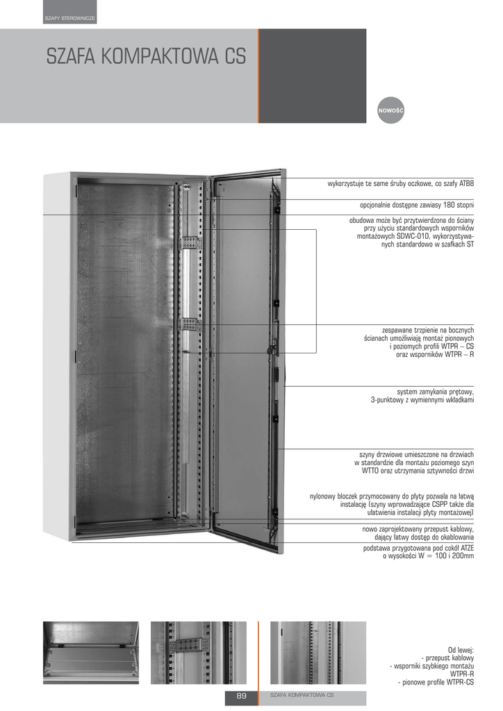 SZAFY STEROWNICZE SZAFA KOMPAKTOWA CS wykorzystuje te same śruby oczkowe, co szafy ATB8 opcjonalnie dostępne zawiasy 180 stopni obudowa może być przytwierdzona do ściany przy użyciu standardowych wsporników montażowych SDWC-010, wykorzystywanych standardowo w szafkach ST zespawane trzpienie na bocznych ścianach umożliwiają montaż pionowych i poziomych profili WTPR – CS oraz wsporników WTPR – R system zamykania prętowy, 3-punktowy z wymiennymi wkładkami szyny drzwiowe umieszczone na drzwiach w standardzie dla montażu poziomego szyn WTTO oraz utrzymania sztywności drzwi nylonowy bloczek przymocowany do płyty pozwala na łatwą instalację (szyny wprowadzające CSPP także dla ułatwienia instalacji płyty montażowej) nowo zaprojektowany przepust kablowy, dający łatwy dostęp do okablowania podstawa przygotowana pod cokół ATZE o wysokości W = 100 i 200mm Od lewej: - przepust kablowy - wsporniki szybkiego montażu WTPR-R - pionowe profile WTPR-CS 89 SZAFA KOMPAKTOWA CS SZAFA KOMPAKTOWA CS DRZWI POJEDYNCZE OPIS: - obudowa: 1.5mm blacha stalowa - drzwi: 1.5mm blacha stalowa (od szerokości S= 800 stal 2 mm) - płyta montażowa: ocynkowana 2.5mm blacha stalowa WYKOŃCZENIE KOLORYSTYCZNE: Malowanie proszkowe: powłoka epoxy-poliester. Wykończenie drzwi i obudowy: kolor RAL 7035 z teksturą. ZAKRES DOSTAWY: Obudowa, drzwi wraz z zawiasami (otwierane prawostronne, można zamontować po drugiej stronie), płyta montażowa, podłoga z regulowanym przepustem kablowym, 2 ocynkowane profile umieszczone na drzwiach oraz prętowy, 3-punktowy system zamykania. DOPUSZCZENIA I CERTYFIKATY: STOPIEŃ OCHRONY: - IP55, zgodny z IEC EN62208; EN60529 - NEMA 12 zgodny z UL508A; UL50 - stopień ochrony zachowany dzięki dwuskładnikowej uszczelce poliuretanowej - odporność na uderzenie IK10 zgodne z IEC EN62208; EN50102 GŁÓWNE AKCESORIA: ATZE cokół modułowy (str. 94) śruby oczkowe (str. 95) elementy do montażu na ścianie (str. 95) 90 SZAFA KOMPAKTOWA CS SZAFY STEROWNICZE WYMIARY KODY CS CS61240 CS61430 CS61440 CS81240 CS81430 CS81440 B 600 600 600 800 800 800 WYMIARY SZAFY A P 1200 400 1400 300 1400 400 1200 400 1400 300 1400 400 PODŁOGA C D 493 304 493 204 493 304 693 304 693 204 304 693 PRZEPUST KABLOWY E F 490 260 490 160 490 260 690 260 690 160 690 260 Dla szafy z drzwiami przezroczystymi dodaj PX do kodu produktu np. CS61240PX. Dostępne na zamówienie. 91 SZAFA KOMPAKTOWA CS DRZWI M N 445 1030 445 1230 445 1230 545 1030 545 1230 545 1230 PŁYTA MONTAŻOWA H L 520 1145 520 1345 520 1345 720 1145 720 1345 720 1345 SZAFA KOMPAKTOWA CS DRZWI PODWÓJNE OPIS: - obudowa: 1.5mm blacha stalowa - drzwi: 1.5mm blacha stalowa - płyta montażowa: ocynkowana 2.5mm blacha stalowa WYKOŃCZENIE KOLORYSTYCZNE: Malowanie proszkowe: powłoka epoxy-poliester. Wykończenie drzwi i obudowy: kolor RAL 7035 z teksturą. ZAKRES DOSTAWY: Obudowa, drzwi wraz z zawiasami (otwierane prawostronne, można zamontować po drugiej stronie), płyta montażowa, podłoga z regulowanym przepustem kablowym, 2 ocynkowane profile umieszczone na drzwiach oraz prętowy, 3-punktowy system zamykania. DOPUSZCZENIA I CERTYFIKATY: STOPIEŃ OCHRONY: - IP55, zgodny z IEC EN62208; EN60529 - NEMA 12 zgodny z UL508A; UL50 - stopień ochrony zachowany dzięki dwuskładnikowej uszczelce poliuretanowej - odprność na uderzenie IK10 zgodne z IEC EN62208; EN50102 GŁÓWNE AKCESORIA: ATZE cokół modułowy (str. 94) śruby oczkowe (str. 95) elementy do montażu na ścianie (str. 95) 92 SZAFA KOMPAKTOWA CS SZAFY STEROWNICZE WYMIARY KODY CS CS101240 CS101430 CS101440 CS121240 CS121430 CS121440 WYMIARY SZAFY B A P 1000 1200 400 1000 1400 300 1000 1400 400 1200 1200 400 1200 1400 300 1200 1400 400 PODŁOGA C D 893 304 893 204 893 304 1093 304 1093 204 1093 304 93 PRZEPUST KABLOWY E F 410 260 410 160 410 260 510 260 510 160 510 260 SZAFA KOMPAKTOWA CS DRZWI M N 345 1030 345 1230 345 1230 445 1030 445 1230 445 1230 PŁYTA MONTAŻOWA L H 920 1145 920 1345 920 1345 1120 1145 1120 1345 1120 1345 AKCESORIA DO SZAF KOMPAKTOWYCH CS OPIS: Elementy narożnikowe wytłoczone z blachy stalowej o grubości 2.5mm. Posiadają zaślepki z tworzywa sztucznego. Listwy boczne wytłoczone z 2mm blachy stalowej. WYKOŃCZENIE KOLORYSTYCZNE: Malowanie proszkowe: powłoka epoxy - poliester. Kolor: RAL 7035 z teksturą (kolor ciemnoszary). ZAKRES DOSTAWY: Cokół modułowy składa się z: - 4 elementów narożnikowych wraz z zaślepkami - 2 listew przednich - 2 listew bocznych ELEMENTY NAROŻNIKOWE LISTWY BOCZNE DO SZAFY CS KODY ATZE OPIS KODY ATZE OPIS DŁUGOŚĆ LISTWY (MM) ATZE-A100 ATZE-A200 DLA COKOŁU O WYSOKOŚCI H=100 DLA COKOŁU O WYSOKOŚCI H=200 ATZE-T0300S ATZE-T0400A DLA COKOŁU O GŁĘBOKOŚCI D=300 DLA COKOŁU O GŁĘBOKOŚCI D=400 136 236 Dostawa obejmuje 4 elementy wraz z akcesoriami do montażu. Dostawa obejmuje 2 elementy. Aby zamówić listwy boczne dla cokołu o wysokości 200mm dodaj „D” do kodu produktu np. ATZE-T300SD. UNIWERSALNE LISTWY PRZEDNIE KODY ATZE ATZE-T0600 ATZE-T0800 ATZE-T1000 ATZE-T1200 OPIS DLA COKOŁU O DŁUGOŚCI W=600 DLA COKOŁU O DŁUGOŚCI W=800 DLA COKOŁU O DŁUGOŚCI W=1000 DLA COKOŁU O DŁUGOŚCI W=1200 DŁUGOŚĆ LISTWY (MM) 444 644 844 1044 Dostawa obejmuje 2 elementy. Aby zamówić listwy przednie dla cokołu o wysokości 200mm dodaj „D” do kodu produktu np. ATZE-T0600D. 94 AKCESORIA DO SZAF KOMPAKTOWYCH CS SZAFY STEROWNICZE DRZWI WEWNĘTRZNE STPO1 Drzwi wewnętrzne STPO1 dla szafek naściennych ST mogą być także zastosowane w szafach kompaktowych CS. OPIS Stelaż i drzwi wykonane ze stali 1.5mm. WYKOŃCZENIE KOLORYSTCZNE Malowanie proszkowe: powłoka epoxy-poliester. Kolor: RAL 7035 z teksturą. ZAKRES DOSTAWY Dostawa zawiera: - stelaż - drzwi - podwójny zamek z wkładką 3mm - akcesoria montażowe STOPIEŃ OCHRONY - na zewnątrz: taki jak szafy - wewnątrz: IP20 WYMIARY KODY STP STP01612 STP01812 KOD SZAFY CS61240 CS81240 B 600 800 WYMIARY SZAFY A 1200 1200 P 400 400 L 530 730 WYMIARY DRZWI