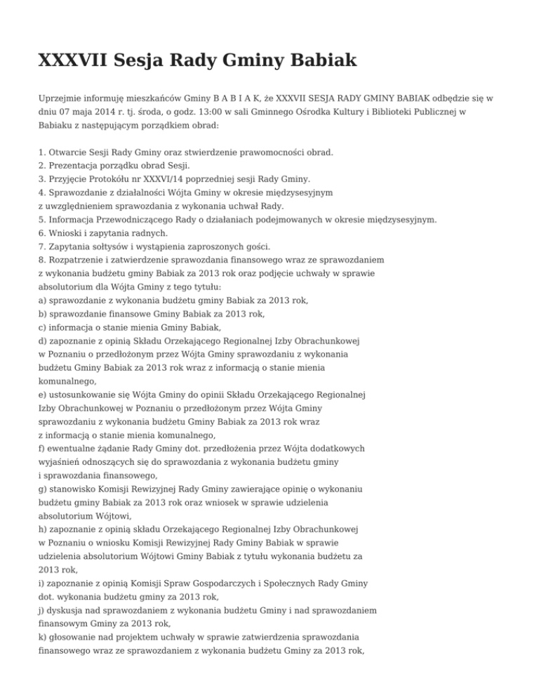 XXXVII Sesja Rady Gminy Babiak Uprzejmie informuję mieszkańców Gminy B A B I A K, że XXXVII SESJA RADY GMINY BABIAK odbędzie się w dniu 07 maja 2014 r. tj. środa, o godz. 13:00 w sali Gminnego Ośrodka Kultury i Biblioteki Publicznej w Babiaku z następującym porządkiem obrad: 1. Otwarcie Sesji Rady Gminy oraz stwierdzenie prawomocności obrad. 2. Prezentacja porządku obrad Sesji. 3. Przyjęcie Protokółu nr XXXVI/14 poprzedniej sesji Rady Gminy. 4. Sprawozdanie z działalności Wójta Gminy w okresie międzysesyjnym z uwzględnieniem sprawozdania z wykonania uchwał Rady. 5. Informacja Przewodniczącego Rady o działaniach podejmowanych w okresie międzysesyjnym. 6. Wnioski i zapytania radnych. 7. Zapytania sołtysów i wystąpienia zaproszonych gości. 8. Rozpatrzenie i zatwierdzenie sprawozdania finansowego wraz ze sprawozdaniem z wykonania budżetu gminy Babiak za 2013 rok oraz podjęcie uchwały w sprawie absolutorium dla Wójta Gminy z tego tytułu: a) sprawozdanie z wykonania budżetu gminy Babiak za 2013 rok, b) sprawozdanie finansowe Gminy Babiak za 2013 rok, c) informacja o stanie mienia Gminy Babiak, d) zapoznanie z opinią Składu Orzekającego Regionalnej Izby Obrachunkowej w Poznaniu o przedłożonym przez Wójta Gminy sprawozdaniu z wykonania budżetu Gminy Babiak za 2013 rok wraz z informacją o stanie mienia komunalnego, e) ustosunkowanie się Wójta Gminy do opinii Składu Orzekającego Regionalnej Izby Obrachunkowej w Poznaniu o przedłożonym przez Wójta Gminy sprawozdaniu z wykonania budżetu Gminy Babiak za 2013 rok wraz z informacją o stanie mienia komunalnego, f) ewentualne żądanie Rady Gminy dot. przedłożenia przez Wójta dodatkowych wyjaśnień odnoszących się do sprawozdania z wykonania budżetu gminy i sprawozdania finansowego, g) stanowisko Komisji Rewizyjnej Rady Gminy zawierające opinię o wykonaniu budżetu gminy Babiak za 2013 rok oraz wniosek w sprawie udzielenia absolutorium Wójtowi, h) zapoznanie z opinią składu Orzekającego Regionalnej Izby Obrachunkowej w Poznaniu o wniosku Komisji Rewizyjnej Rady Gminy Babiak w sprawie udzielenia absolutorium Wójtowi Gminy Babiak z tytułu wykonania budżetu za 2013 rok, i) zapoznanie z opinią Komisji Spraw Gospodarczych i Społecznych Rady Gminy dot. wykonania budżetu gminy za 2013 rok, j) dyskusja nad sprawozdaniem z wykonania budżetu Gminy i nad sprawozdaniem finansowym Gminy za 2013 rok, k) głosowanie nad projektem uchwały w sprawie zatwierdzenia sprawozdania finansowego wraz ze sprawozdaniem z wykonania budżetu Gminy za 2013 rok, l) głosowanie nad projektem uchwały w sprawie udzielenia absolutorium Wójtowi Gminy. 9. Wprowadzenie zmian w uchwale budżetowej na 2014 rok. 10. Przedłużenie czasu obowiązywania dotychczasowych taryf dla zbiorowego zaopatrzenia w wodę i zbiorowego odprowadzania ścieków na terenie gminy Babiak. 11. Podjęcie uchwały w sprawie przystąpienia do zmiany Studium uwarunkowań i kierunków zagospodarowania przestrzennego Gminy Babiak. 12. Odpowiedzi na wnioski i zapytania radnych. 13. Wolne wnioski i informacje. 14. Zamknięcie obrad XXXVII Sesji Rady Gminy Babiak. Bezpłatne warsztaty Ruszył finał Listów dla Ziemi 2014 W poniedziałek 14 kwietnia ruszył finał II edycji Listów dla Ziemi Fundacji Ekologicznej Arka. Do końca kwietnia ponad 300 tysięcy uczniów z ponad 300 gmin z całej Polski zasiądzie do pisania listów. W tysiącach placówek zorganizowane zostaną specjalne ekologiczne działania, a w największych miastach odbędą się eventy, które będą zwracały uwagę mieszkańców na problem zanieczyszczenia powietrza. W przedszkolu i w gimnazjum Listy zostaną napisane przez przedszkolaków, uczniów podstawówek i gimnazjów. Ich tematyka będzie dotyczyła przede wszystkim palenia śmieci w piecach domowych i niskiej emisji. Najmłodsi swoje zaniepokojenie zanieczyszczeniem powietrza i jego konsekwencjami, podobnie jak w roku ubiegłym, będą wyrażali w formie rysunków i wycinanek. Zanim uczniowie zaczną zapisywać swoje przemyślenia na kartkach z makulatury wezmą udział w specjalnych lekcjach tematycznych. Gminy, które włączyły się do akcji, otrzymały bowiem specjalne pakiety edukacyjne i scenariusze zajęć. Powstały one przy współpracy z dydaktykiem biologii i edukacji środowiskowej. Z materiałów uczniowie dowiedzą się, jakie są źródła zanieczyszczeń powietrza, czym jest niska emisja, dlaczego palenie śmieci w piecach jest niebezpieczne. Wybór Strażnika Listy trafią do rodziców i będą stanowiły bodziec do podjęcia dyskusji ekologicznej oraz aktywnego włączenia się w pomoc środowisku. Na drugiej stronie papieru listowego znajdują się bowiem porady oraz wolne miejsce na zapisanie 3 pomysłów na ekologiczne działania. Może to być posadzenie drzewa, robienie zakupów w torbach wielokrotnego użytku czy rezygnacja z jazdy samochodem na rzecz komunikacji miejskiej lub roweru. Członkowie rodziny wybiorą spośród siebie Strażnika, który będzie pilnował, by podjęte zobowiązania zostały zrealizowane. Konkurs na najpiękniejszy list Na tym jednak droga listów się nie skończy. Nauczyciele w placówkach zorganizują wewnętrzne konkursy, podczas których wyłonią najpiękniejsze ich zdaniem listy. Każda szkoła jeden z takich listów do 12 maja może przysłać do Fundacji Ekologicznej Arka. Nadesłane prace wezmą udział w konkursie na Najpiękniejszy list dla Ziemi. Motywacja do pisania jest spora, bo na uczestników konkursu czeka aż 100 nagród ufundowanych przez Narodowy Fundusz Ochrony Środowiska i Gospodarki Wodnej. Laureaci wybierani będą w trzech kategoriach (przedszkola, szkoły podstawowe i gimnazja) i dwoma sposobami, bo przez internautów oraz jury. Eventy w największych miastach Działaniom w placówkach i domach będą towarzyszyły eventy w przestrzeni publicznej. Inauguracja Listów dla Ziemi odbyła się w poniedziałek 14 kwietnia o godzinie 11 na Wyspie M