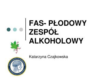 FAS- PŁODOWY ZESPÓŁ ALKOHOLOWY Katarzyna Czajkowska Spis treści Czym jest FAS? Historia FAS Przyczyny Objawy- wygląd twarzy Deficyty anatomiczne i psychologiczne Jak alkohol wpływa na mózg dziecka? Diagnoza Niepokojące fakty Statystyki urodzeń dzieci z FAS Konsekwencje choroby Leczenie Światowy dzień FAS FAS knot Czym jest FAS? FAS- fetal alcohol syndrome- płodowy zespół alkoholowy FAS to zespół umysłowych i fizycznych zaburzeń będących skutkiem działania alkoholu na płód w okresie prenatalnym Historia FAS Już w starożytności ludzie zdawali sobie sprawę ze szkodliwości spożywania alkoholu przez ciężarną kobietę. W celtyckiej Szkocji matki i pielęgniarki nie mogły pić ale (angielskie piwo) podczas ciąży i karmienia piersią. W 1968r. francuski lekarz, Paul Lemoine of Nantes, opublikował pracę o charakterystycznych cechach występujących u dzieci alkoholiczek. Historia FAS W latach 1968-1969 Christy Ulleland i współpracownicy przeprowadzili badanie dokumentujące zagrożenie dla dziecka wynikające ze spożywania przez matki alkoholu w czasie ciąży. Nazwa Fetal Alkohol Syndrome stworzona w 1973r. przez dwóch lekarzy dysmorfologów - Kenneth Lyons Jones i David Weyhe Smith z University of Washington Medical School w Seattle, USA. W 1982r. Sterling Clarren, prowadząc badania na małpach, dowiódł, że alkohol jest teratogenem. Przyczyny Spożywanie alkoholu przez kobiety w ciąży i karmiące mlekiem zaburzone: produkcja DNA i białek wzrost, różnicowanie i migracje komórek transport aminokwasów i glukozy przez łożysko zwężenie naczyń krwionośnych matki i niedotlenienie płodu - hipoksja Przyczyny Czynnikiem współwywołującym FAS jest stres oksydacyjny - gdy produkcja wolnych rodników przekracza zdolności eliminacyjne komórek. Produkty przemiany alkoholu są wolnymi rodnikami Podawanie antyoksydantów może zmniejszyć negatywne skutki picia alkoholu Objawy- wygląd twarzy Deficyty anatomiczne i psychologiczne Zagrożenie ciąży U niemowląt: trudności z jedzeniem nadwrażliwość na bodźce możliwość występowania hypertonii (zbyt duże napięcie mięśniowe) lub hypotonii (zbyt małe napięcie mięśniowe) lub jednego i drugiego Deficyty anatomiczne i psychologiczne Małogłowie, mniejszy i mniej pofałdowany mózg Zahamowanie wzrostu i złe ukształtowanie kośćca Wady serca, nerek, wątroby, narządów wzroku, słuchu Nadaktywność, wrażliwość na dotyk i dźwięki IQ Deficyty uwagi i pamięci, jąkanie się, bełkotliwe mówienie Trudności z myśleniem abstrakcyjnym i przyczynowoskutkowym Niedojrzałe zachowanie, depresja, wybuchy gniewu Jak alkohol wpływa na mózg dziecka? Obszary rozwijające się Ciało modzelowateinformacje przepływają powoli i nieskutecznie Kora przedczołowa Móżdżek Diagnoza Diagnoza alkoholowego zespołu płodowego FAS opiera się na następujących kryteriach: charakterystyczne rysy twarzy mała waga urodzeniowa dysfunkcja OUN (ośrodkowego układu nerwowego) wywiad potwierdzający narażenie płodu na działanie alkoholu w życiu płodowym Diagnoza Kiedy występuje kilka cech wraz z objawami ze strony OUN i wywiadem świadczącym o narażeniu na działanie alkoholu w życiu płodowym, można rozważyć diagnozę FAS FASD Niepokojące fakty Na 100 urodzeń 3-4 dzieci z FAS Alkohol uszkadza płód bardziej, niż jakikolwiek narkotyk. FAS jest wiodącą przyczyną chorób umysłowych. Na świat przychodzi dziesięciokrotnie więcej dzieci z pełnoobjawowym FAS, niż z Zespołem Downa. Brak lub niewłaściwe diagnozy Ponad połowa dzieci z polskich domów dziecka ma FAS. 1/3 Polek pije w czasie ciąży. Statystyki urodzeń dzieci z FAS Nawet troje dzieci na każde 1000 urodzeń żywych może być dotkniętych płodowym zespołem alkoholowym (FAS). Dziesięć razy więcej dzieci rodzi się z innymi zaburzeniami rozwojowymi związanymi z alkoholem- FASD (Fetal Alcohol Spectrum DisordersPoalkoholowe uszkodzenie płodu), do których należą: FAE, PAE, ARND, ARBD. Konsekwencje choroby Dzieci i dorośli z FAS są podatni na fizyczną, seksualną i emocjonalną przemoc. Dorośli z zespołem FAS mają trudności z osiągnięciem pełnej niezależności, utrzymaniem stałej posady i wytrwaniem w zdrowym związku. Kobieta w ciąży, która wypija alkohol, wywołuje u dziecka stres, który negatywnie wpływa na relację przywiązania. Leczenie FAS – statyczna encefalopatia - zmiany, które raz zaszły w mózgu, nie ulegają ani pogłębieniu, ani nie mogą zostać cofnięte. Cholina - można znieść skutki picia przez matkę alkoholu w czasie ciąży, podając dziecku z płodowym zespołem alkoholowym cholinę. programy stymulacji i obozy terapeutyczne Światowy dzień FAS Światowy Dzień FAS 9 września - symbol 9 miesięcy ciąży, która powinna być wolna od alkoholu. Celem Dnia FAS jest przestrzeganie przed używaniem alkoholu przez kobiety ciężarne. www.fasday.com THE FAS (K)NOT! Podsumowanie nawet mała dawka alkoholu może wywołać trwałe uszkodzenia płodu żadna dawka alkoholu nie jest bezpieczna! Dzieci z FAS często uważane są za niegrzeczne, złośliwe i nieodpowiedzialne, a to właśnie one potrzebują szczególnej troski i zrozumienia. Dzieci z FAE (Fetal Alcohol Effect) nie zawsze rodzą się ze specyficzną urodą. FASD (Poalkoholowe uszkodzenie płodu) The following Fetal Alcohol Spectrum Disorders (FASD) are caused by drinking alcohol during pregnancy: FAS: Fetal Alcohol Syndrome Symptoms include small head/body, facial characteristics, brain damage FAE: Fetal Alcohol Effects Symptoms usually not visible, such as behavior disorders, attention deficits ARBD: Alcohol Related Birth Defects Anomalies such as heart defects, sight/hearing problems, joint anomalies, etc. ARND: Alcohol Related Neurodevelopmental Disorders Disorders such as attention deficits, behavior disorders, obsessive/compulsive disorder, etc. Full FAS comprises only about 10% of the spectrum. The other 9