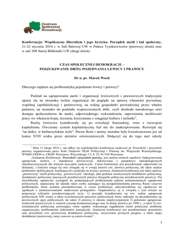 Konferencja: Współczesny liberalizm i jego krytyka. Porządek myśli i ład społeczny, 21-22 stycznia 2016 r. w Sali Balowej UW w Pałacu Tyszkiewiczów (pierwszy dzień) oraz w sali 308 Starej Biblioteki UW (drugi dzień). CZAS SPOŁECZNEJ DEMOKRACJI – POSZUKIWANIE DRÓG POJEDNANIA LEWICY I PRAWICY Dr n. pr. Marek Woch Dlaczego zająłem się problematyką pojednania lewicy i prawicy? Podział na ugrupowania partii i organizacji lewicowych i prawicowych tradycyjnie opiera się na stosunku tychże organizacji do poglądu na sprawę własności prywatnej, wspólnej (spółdzielczej) i państwowej, na rodzaj gospodarki prowadzonej przez władze państwa, na stosunku do podziału wypracowanych dóbr, czyli dochodu narodowego oraz dostępu społeczeństwa do nauki, odpowiedniego wykształcenia, zapewnienia możliwości pracy we własnym kraju, leczenia, korzystania z osiągnięć kultury i techniki 1. Ruchy lewicowe kształtowały się po rewolucji francuskiej, wraz z rozwojem kapitalizmu. Ówczesny system kapitalistyczny był nie do zaakceptowania. Rozwijał się "na dziko, w barbarzyńskim stylu". Prawa Boże i normy moralne były kwestionowane już od końca XVII wieku przez ateistów oświeceniowych. Dołączył się do tego nurt szkoły 1 Dnia 13 lutego 2016 r. ma odbyć się (ogólnopolska konferencja naukowa) pt. Przeszłość i przyszłość prawicy organizowana przez Koło Naukowe Myśli Politycznej i Prawnej im. Wojciecha Wasiutyńskiego, WNHiS UKSW-u, UKSW Warszawa, Wóycickiego 1/3, b. 23; 01-938 Warszawa. ,,Zamiarem Konferencji: Przeszłość i przyszłość prawicy, jest analiza różnych aspektów funkcjonowania ugrupowań, ruchów, o charakterze prawicowym, dokonywana z perspektyw metodologicznych charakterystycznych dla różnych dyscyplin naukowych. Celem konferencji jest poszukiwanie odpowiedzi na dylematy, z którymi zmaga się oraz zmagała się w swojej historii tzw. prawica polityczna, ale także analiza problemów definicyjnych wynikających z podziału na lewicę i prawicę. Zamiarem konferencji jest także analiza: „prawicowej” myśli politycznej, „prawicowych” ideologii, jako podstaw teoretycznych działalności politycznej, działalności politycznej znaczących przedstawicieli prawicy (biografie polityczne przedstawicieli prawicy). Nie chcielibyśmy ograniczać wystąpień do podejmujących problematykę jedynie parlamentarnych ugrupowań politycznych, zapraszamy do udziału także osoby zajmujące się pozaparlamentarną prawicą. Ramy czasowe problematyki, która zostanie przeanalizowana w czasie konferencji, zdecydowaliśmy się ograniczyć do zgodnych z zainteresowaniami naukowymi prelegentów. Organizatorzy są w związku z tym otwarci na propozycje referatów przedstawiających m.in.: 1) początki kształtowania się tzw. rodzin ugrupowań politycznych XIX wieku, a także wcześniejszych procesów politycznych, które wpłynęły na ukształtowanie się prawicowych opcji politycznych, ale także 2) prawicę w okresie międzywojennym 3) położenie ugrupowań, środowisk prawicowych w ramach systemu komunistycznego oraz 4) dzieje prawicy po 1989 r., a także 5) tzw. teraźniejszość polityczną; poruszające różne aspekty wskazanego zagadnienia (myśl polityczna, problemy organizacyjne, problematyka elektoratów partyjnych). Zamiarem konferencji jest przedstawienie przeszłości oraz przyszłości tzw. prawicowej działalności politycznej, zarysowanie pewnych prognoz, a także mapy działalności prawicowej, ramy czasowe są zatem otwarte”. 1 heglowskiej, dążący do przekształcenia filozofii w krytykę, której celem była przemiana świata oraz krytykę religii. Do szkoły heglowskiej nawiązywali później Karol Marks i Fryderyk Engels. Formy własności Papież Jan Paweł II w encyklice ,,Laborem exercens” mówi o współposiadaniu środków produkcji, czyli: prawo własności powinno się pojmować ,,w najszerszym kontekście powszechnego prawa wszystkich do korzystania z dóbr całego stworzenia: prawo osobistego posiadania jako podporządkowane prawu powszechnego używania, uniwersalnemu przeznaczeniu dóbr”. Kanonizowany w dniu 27 kwietnia 2014 r., papież Jan XXIII twierdzi w encyklice ,,Pacem in Terris”, że nie da się jednoznacznie rozstrzygnąć, jaka jest najwłaściwsza forma własności. Obowiązek dostosowania określonych form własności z jednoczesną możliwością korzystania przez wszystkich z dóbr materialnych, powinien spoczywać na organach władzy publicznej. Istotą takiego ujęcia jest pogląd, że nie należy ustalać określonej formy własności w sposób powszechnie obowiązujący wszelkie społeczeństwa. Zgodna z prawem natury jest także własność państwowa i spółdzielcza. Komunizm Komunizm jest interesującą ideą utopijną i zaszczepił się w wielu narodach. Głosi ona bowiem formę życia społecznego ludzi w pierwotnej społeczności bezklasowej, którego ekonomiczną istotą była wspólna własność środków produkcji oraz ziemi, a struktura społeczna miała opierać się na zasadzie kolektywistycznego współdziałania członków społeczności bez układu panowania i podległości. Na drodze tej idei stanął marksizm swoją zasadą „cel uświęca środki”. To spowodowało, że komunizm zaczął rozwijać się od idei do doktryn politycznych. Socjalizm Socjalizm postulował zbudowanie ustroju, w którym społeczna własność środków produkcji staje się ekonomiczną podstawą zniesienia podziałów klasowych i wyzysku. Socjalizm byłby ideą słuszną, ale bez dyktatury proletariatu, która nadała mu charakter totalitarny i wypaczyła jego idee. Socjalizm wymagał stałego podnoszenia w społeczeństwie walorów moralnych. Patriotyzm Czym powinno być obecnie odwoływanie się do patriotyzmu? Może po prostu szanowaniem i tolerowaniem ludzi niewierzących, wyznawców innych religii i mniejszości narodowych. Ponadto patriotyzm powinien być oparty na poczuciu więzi spo