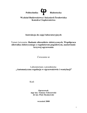 Politechnika Białostocka Wydział Budownictwa i Inżynierii Środowiska Katedra Ciepłownictwa Instrukcja do zajęć laboratoryjnych Temat ćwiczenia: Badanie siłowników elektrycznych. Współpraca siłownika elektrycznego z regulatorem pogodowym, nastawianie krzywej ogrzewania Ćwiczenie nr Laboratorium z przedmiotu: „Automatyczna regulacja w ogrzewnictwie i wentylacji” Kod: Opracował: mgr inż. Tomasz Teleszewski dr inż. Piotr Rynkowski wrzesień 2008 1 Cześć I - Badanie siłowników elektrycznych. 1. Wprowadzenie Zadaniem siłownika jest realizacja zmiany otwarcia zaworu regulującego lub przepustnicy. Elementy napędowe w układach regulacji możemy podzielić na: • siłowniki elektryczne, • siłowniki pneumatyczne, • siłowniki hydrauliczne, • siłowniki elektropneumatyczne, • siłowniki elektrohydrauliczne. W siłowniku elektrycznym energia elektryczna przetwarzana jest na energię mechaniczną. Podstawowym elementem siłownika elektrycznego jest silnik elektryczny. Napęd z silnika przenoszony jest przez wielostopniową przekładnię zębatą na zespół wyjściowy, który stanowi układ śruba-nakrętka. Siłowniki elektryczne pracują jako urządzenia trójstawne. Dwa stany odpowiadają ruchowi silnika w jednym i drugim kierunku (otwieranie i zamykanie zaworu), a trzeci postojowi. Sygnał trójstawny stałonapięciowy lub zmiennonapięciowy powinien posiadać następującą charakterystykę: stan +1 – znamionowe napięcie i proste następstwo faz lub biegunowość dodatnia, stan -1 – wartość napięcia równa zeru, stan -1 – znamionowe napięcie i odwrotne następstwo faz lub biegunowość ujemna. Siłownik wyposażony jest w układ mikrowyłączników ograniczających ruch elementu wyjściowego. Dla zabezpieczenia przed przeciążeniem w siłowniku znajdują się oddzielne mikrowyłączniki wraz z układem regulacji nastawy wartości granicznych siły lub momentu. Siłownik elektryczny może być wyposażony w nadajnik położenia. Nadajnik położenia odwzorowuje położenie elementu wyjściowego w sposób ciągły, za pomocą sygnałów elektrycznych, które mogą być wykorzystywane do sprzężenia zwrotnego w układach regulacji automatycznej. Siłowniki elektryczne wyposażane są w zespół napędu ręcznego umożliwiające ręczne przesunięcie elementu wyjściowego. Ze względu na ruch elementu wyjściowego siłowniki elektryczne możemy podzielić na: 1) siłowniki liniowe (element wyjściowy wykonuje ruch prostoliniowy, posuwistozwrotny), 2) siłowniki wahliwe (element wyjściowy wykonuje ruch obrotowy na drodze kątowej, nie przekraczającej kąta pełnego), 3) siłowniki obrotowe (element wyjściowy wykonuje ruch obrotowy na drodze kątowej, większej od kąta pełnego), 4) siłowniki stałoprędkościowe (element wyjściowy porusza się w określonym kierunku ze stałą prędkością), 5) siłowniki zmiennoprędkościowe (element wyjściowy może poruszać się w określonym kierunku ze zmienną prędkością, zależną od sygnału wejściowego). Siłowniki charakteryzują się następującymi wielkościami: 1) udźwig nominalny (kN), 2) nominalny skok siłownika (mm), 3) prędkość ruchu trzpienia (mm/min). Na rysunku 1 a) przedstawiono widok siłownika elektrycznego typu ESL-03 firmy CONTROLMATICA ZAP-PNEFAL, na rysunku 1 b) przedstawiono siłowniki elektryczne typu PSL firmy POLNA wraz zaworami, natomiast na rysunku 2 schemat elektryczny siłownika typu ESL-03. 2 a) b) Rys. 1 Siłowniki elektryczne: a)ESL-03 firmy CONTROLMATICA ZAP-PNEFAL, b) PSL firmy POLNA. Rys. 2 Schemat połączeń elektrycznych siłownika elektrycznego typu ESL-03 firmy CONTROLMATICA ZAP-PNEFAL: X1, X2 - uchwyty agregatowe; M – silnik; C – kondensator; W01, W02, WZ1 , WZ2 - wyłączniki krańcowe od drogi; WP0, WPZ - wyłączniki od przeciążenia. 3 2. Cel i zakres ćwiczenia laboratoryjnego (cześć I) Celem ćwiczenia jest zapoznanie studentów z budową i zasadą działania siłowników elektrycznych, wyznaczenie wielkości charakteryzujących działanie siłownika. 3. Metodyka badań a) opis stanowiska badawczego 1 2 3 Reg. H 5 4 Rys. 6 Schemat stanowiska badawczego: 1-siłownik elektryczny, 2- regulator temperatury, 3-opornik dekadowy, 4-ultratermostat, 5-czujnik temperatury. b) przebieg realizacji eksperymentu 1) Włączyć sterowanie ręczne na regulatorze (2). 2) Zmierzyć czas przesunięcia trzpienia siłownika w dół i w górę(1). 3) Obliczyć prędkość ruchu trzpienia ze wzoru: L v = [mm / s ] t gdzie: L – skok trzpienia [mm], t – czas przesunięcia [s], v – prędkość ruchu trzpienia [mm/s] 4) Wyniki pomiarów umieścić w tabeli 1. 5) Zapoznać się z budową siłownika – określić poszczególne część siłownika elektrycznego. Tabela 1 LP Skok Skok t t Prędkość [s] 1 2 [mm] [mm] [s] [s] [mm/s] c) prezentacja i analiza wyników badań Sporządzić szkic rysunku złożeniowego siłownika elektrycznego. 4 Cześć II - Współpraca siłownika elektrycznego z regulatorem pogodowym, nastawianie krzywej ogrzewania 4. Zasada działania regulatora pogodowego Temperatura powietrza zewnętrznego decyduje o zapotrzebowaniu budynku w na ciepło . Regulacja układu grzewczego stosownie do temperatury na zewnątrz budynku przynosi większe korzyści ekonomiczne niż regulacja według temperatury wewnętrznej. Pogodowa regulacja ogrzewania gwarantuje utrzymanie równomiernej temperatury w pomieszczeniu i prawidłowe wykorzystanie energii, gdyż temperatura wody zasilającej regulowana jest w zależności od temperatury zewnętrznej. Regulacja „pogodowa” odbywa się na podstawie zaprogramowanej charakterystyki ogrzewania zwanej krzywą grzewczą (rys. 7). Krzywa ta określa zależność między temperaturą powietrza zewnętrznego a temperaturą wody wychodzącej z kotła lub wymiennika. Do grzejników dostarczany jest czynnik grzewczy o temperaturze odpowiedniej dla aktualnej temperatury zewnętrznej. Regulator można dodatkowo wyposaż