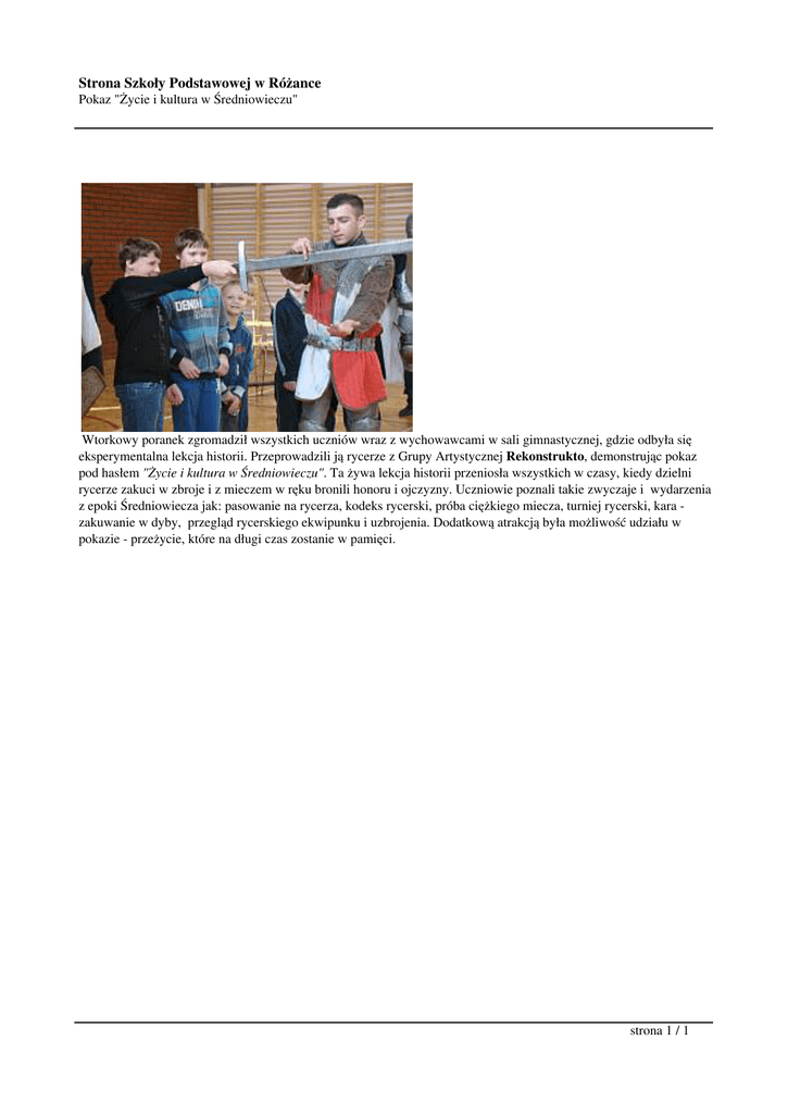 Strona Szkoły Podstawowej w Różance Pokaz "Życie i kultura w Średniowieczu" Wtorkowy poranek zgromadził wszystkich uczniów wraz z wychowawcami w sali gimnastycznej, gdzie odbyła się eksperymentalna lekcja historii. Przeprowadzili ją rycerze z Grupy Artystycznej Rekonstrukto, demonstrując pokaz pod hasłem "Życie i kultura w Średniowieczu". Ta żywa lekcja historii przeniosła wszystkich w czasy, kiedy dzielni rycerze zakuci w zbroje i z mieczem w ręku bronili honoru i ojczyzny. Uczniowie poznali takie zwyczaje i wydarzenia z epoki Średniowiecza jak: pasowanie na rycerza, kodeks rycerski, próba ciężkiego miecza, turniej rycerski, kara zakuwanie w dyby, przegląd rycerskiego ekwipunku i uzbrojenia. Dodatkową atrakcją była możliwość udziału w pokazie - przeżycie, które na długi czas zostanie w pamięci. strona 1 / 1