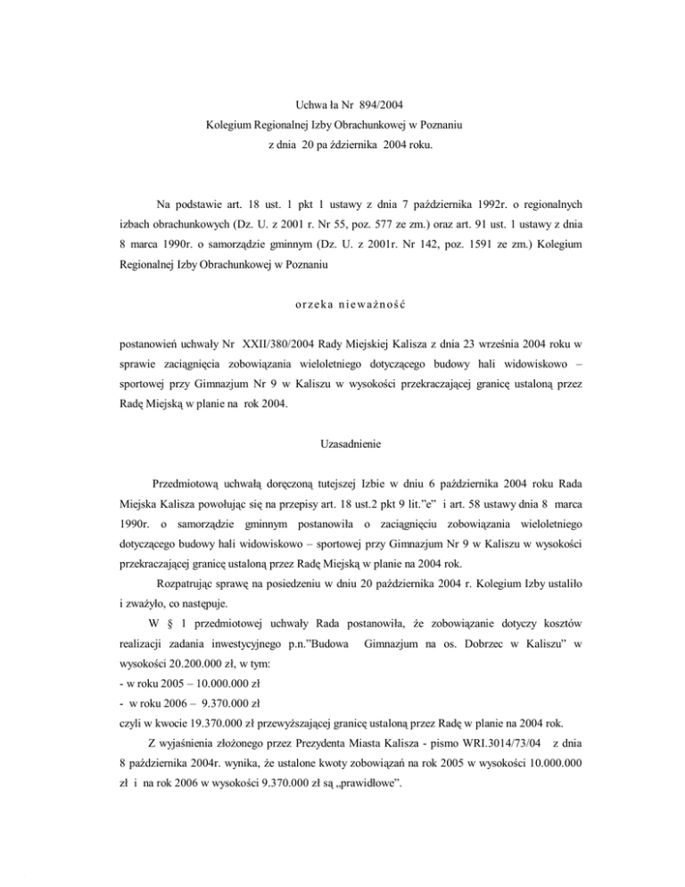 Uchwa ła Nr 894/2004 Kolegium Regionalnej Izby Obrachunkowej w Poznaniu z dnia 20 pa ździernika 2004 roku. Na podstawie art. 18 ust. 1 pkt 1 ustawy z dnia 7 października 1992r. o regionalnych izbach obrachunkowych (Dz. U. z 2001 r. Nr 55, poz. 577 ze zm.) oraz art. 91 ust. 1 ustawy z dnia 8 marca 1990r. o samorządzie gminnym (Dz. U. z 2001r. Nr 142, poz. 1591 ze zm.) Kolegium Regionalnej Izby Obrachunkowej w Poznaniu o r z e k a n i e w aż n o ś ć postanowień uchwały Nr XXII/380/2004 Rady Miejskiej Kalisza z dnia 23 września 2004 roku w sprawie zaciągnięcia zobowiązania wieloletniego dotyczącego budowy hali widowiskowo – sportowej przy Gimnazjum Nr 9 w Kaliszu w wysokości przekraczającej granicę ustaloną przez Radę Miejską w planie na rok 2004. Uzasadnienie Przedmiotową uchwałą doręczoną tutejszej Izbie w dniu 6 października 2004 roku Rada Miejska Kalisza powołując się na przepisy art. 18 ust.2 pkt 9 lit.”e” i art. 58 ustawy dnia 8 marca 1990r. o samorządzie gminnym postanowiła o zaciągnięciu zobowiązania wieloletniego dotyczącego budowy hali widowiskowo – sportowej przy Gimnazjum Nr 9 w Kaliszu w wysokości przekraczającej granicę ustaloną przez Radę Miejską w planie na 2004 rok. Rozpatrując sprawę na posiedzeniu w dniu 20 października 2004 r. Kolegium Izby ustaliło i zważyło, co następuje. W § 1 przedmiotowej uchwały Rada postanowiła, że zobowiązanie dotyczy kosztów realizacji zadania inwestycyjnego p.n.”Budowa Gimnazjum na os. Dobrzec w Kaliszu” w wysokości 20.200.000 zł, w tym: - w roku 2005 – 10.000.000 zł - w roku 2006 – 9.370.000 zł czyli w kwocie 19.370.000 zł przewyższającej granicę ustaloną przez Radę w planie na 2004 rok. Z wyjaśnienia złożonego przez Prezydenta Miasta Kalisza - pismo WRI.3014/73/04 z dnia 8 października 2004r. wynika, że ustalone kwoty zobowiązań na rok 2005 w wysokości 10.000.000 zł i na rok 2006 w wysokości 9.370.000 zł są „prawidłowe”. W dalszej części wskazał, że kwota „2.200.000 zł dotyczy kosztów realizacji zadania inwestycyjnego p.n. „Budowa Gimnazjum na os. Dobrzec” w części dotyczącej budowanej hali sportowej. Różnica w wysokości 830.000 zł stanowi wartość kosztów, które sfinansowane zostaną z wydatków planowanych w 2004r.” Wskazany w podstawie prawnej przepis art.18 ust.2 pkt 9 litera „e” ustawy o samorządzie gminnym stanowi, iż do wyłącznej kompetencji rady gminy należy podejmowanie uchwał w sprawach majątkowych gminy, przekraczających zakres zwykłego zarządu, dotyczących zobowiązań w zakresie podejmowania inwestycji i remontów o wartości przekraczającej granicę ustalaną corocznie przez radę gminy. Unormowania wskazanego przepisu dają zatem podstawę do zaciągania zobowiązań ponad kwoty zaplanowane w budżecie roku 2004. Skoro w budżecie roku 2004 zostały zaplanowane środki na przedmiotowe zadanie w wysokości 830.000 zł, co wynika z wyjaśnień złożonych przez Prezydenta Miasta Kalisza, zgodnie ze wskazanym przepisem art.18 ust.2 pkt 9 lit.”e” ustawy o samorządzie gminnym kwota do zaciągnięcia zobowiązań na wskazane przez Radę zadanie winna być o 830.000 zł niższa i powinna wynosić 19.370.000 zł Kolegium podnosi, że budżet Miasta Kalisza zawiera imienny wykaz zadań inwestycyjnych, w którym nie figuruje zadanie budowa hali widowiskowo – sportowej przy Gimnazjum Nr 9 w Kaliszu. W budżecie roku 2004 zaplanowane zostały środki w wysokości 6.890.000 zł na zadanie „Budowa Gimnazjum na oś. Dobrzec”. W uchwale nr XXII/380/2004 Rada postanowiła o zaciągnięciu zobowiązania wieloletniego dotyczącego budowy hali widowiskowo – sportowej przy Gimnazjum Nr 9 w Kaliszu w wysokości przekraczającej granicę ustaloną przez Radę Miejską w planie na 2004 rok. W § 1 ust.1 przedmiotowej uchwały Rada postanawia zaciągnąć zobowiązanie sfinansowanie kosztów realizacji zadania inwestycyjnego p.n.”Budowa na Gimnazjum na os. Dobrzec w Kaliszu” w wysokości 20.200.000zł. Z wyjaśnień złożonych przez Prezydenta i uchwały Rady o zaciągnięciu zobowiązań wynika, że budowa hali widowiskowej jest odrębnym zadaniem inwestycyjnym. Zatem w załączniku o zadaniach inwestycyjnych należałoby wyodrębnić zadanie dotyczące budowy hali widowiskowo – sportowej przy Gimnazjum nr 9 w Kaliszu, bowiem z treści załącznika o zadaniach inwestycyjnych na 2004r. nie można wyczytać nakładów w wysokości 830.000 zł zaplanowanych do poniesienia w roku bieżącym. W tym stanie faktycznym i prawnym Kolegium postanowiło jak w sentencji uchwały. Pouczenie: Na niniejsze rozstrzygnięcie nadzorcze przysługuje prawo wniesienia skargi do Wojewódzkiego Sądu Administracyjnego w Poznaniu w terminie 30 dni od daty jego doręczenia, za pośrednictwem Kolegium Regionalnej Izby Obrachunkowej w Poznaniu.