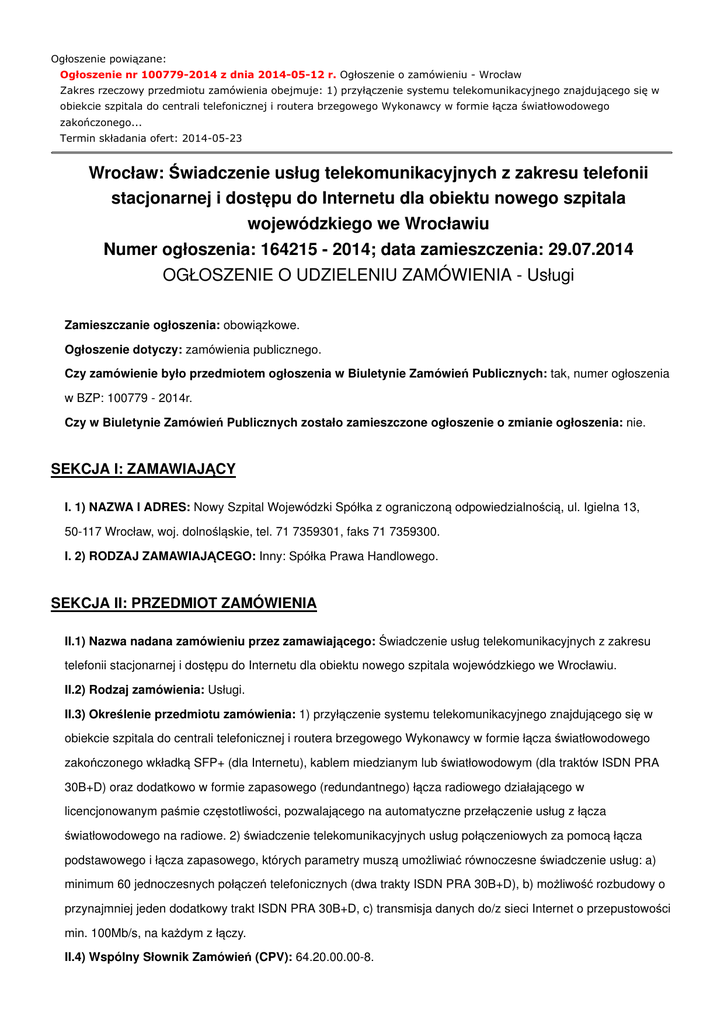 Ogłoszenie powiązane: Ogłoszenie nr 100779-2014 z dnia 2014-05-12 r. Ogłoszenie o zamówieniu - Wrocław Zakres rzeczowy przedmiotu zamówienia obejmuje: 1) przyłączenie systemu telekomunikacyjnego znajdującego się w obiekcie szpitala do centrali telefonicznej i routera brzegowego Wykonawcy w formie łącza światłowodowego zakończonego... Termin składania ofert: 2014-05-23 Wrocław: Świadczenie usług telekomunikacyjnych z zakresu telefonii stacjonarnej i dostępu do Internetu dla obiektu nowego szpitala wojewódzkiego we Wrocławiu Numer ogłoszenia: 164215 - 2014; data zamieszczenia: 29.07.2014 OGŁOSZENIE O UDZIELENIU ZAMÓWIENIA - Usługi Zamieszczanie ogłoszenia: obowiązkowe. Ogłoszenie dotyczy: zamówienia publicznego. Czy zamówienie było przedmiotem ogłoszenia w Biuletynie Zamówień Publicznych: tak, numer ogłoszenia w BZP: 100779 - 2014r. Czy w Biuletynie Zamówień Publicznych zostało zamieszczone ogłoszenie o zmianie ogłoszenia: nie. SEKCJA I: ZAMAWIAJĄCY I. 1) NAZWA I ADRES: Nowy Szpital Wojewódzki Spółka z ograniczoną odpowiedzialnością, ul. Igielna 13, 50-117 Wrocław, woj. dolnośląskie, tel. 71 7359301, faks 71 7359300. I. 2) RODZAJ ZAMAWIAJĄCEGO: Inny: Spółka Prawa Handlowego. SEKCJA II: PRZEDMIOT ZAMÓWIENIA II.1) Nazwa nadana zamówieniu przez zamawiającego: Świadczenie usług telekomunikacyjnych z zakresu telefonii stacjonarnej i dostępu do Internetu dla obiektu nowego szpitala wojewódzkiego we Wrocławiu. II.2) Rodzaj zamówienia: Usługi. II.3) Określenie przedmiotu zamówienia: 1) przyłączenie systemu telekomunikacyjnego znajdującego się w obiekcie szpitala do centrali telefonicznej i routera brzegowego Wykonawcy w formie łącza światłowodowego zakończonego wkładką SFP+ (dla Internetu), kablem miedzianym lub światłowodowym (dla traktów ISDN PRA 30B+D) oraz dodatkowo w formie zapasowego (redundantnego) łącza radiowego działającego w licencjonowanym paśmie częstotliwości, pozwalającego na automatyczne przełączenie usług z łącza światłowodowego na radiowe. 2) świadczenie telekomunikacyjnych usług połączeniowych za pomocą łącza podstawowego i łącza zapasowego, których parametry muszą umożliwiać równoczesne świadczenie usług: a) minimum 60 jednoczesnych połączeń telefonicznych (dwa trakty ISDN PRA 30B+D), b) możliwość rozbudowy o przynajmniej jeden dodatkowy trakt ISDN PRA 30B+D, c) transmisja danych do/z sieci Internet o przepustowości min. 100Mb/s, na każdym z łączy. II.4) Wspólny Słownik Zamówień (CPV): 64.20.00.00-8. SEKCJA III: PROCEDURA III.1) TRYB UDZIELENIA ZAMÓWIENIA: Przetarg nieograniczony III.2) INFORMACJE ADMINISTRACYJNE Zamówienie dotyczy projektu/programu finansowanego ze środków Unii Europejskiej: nie SEKCJA IV: UDZIELENIE ZAMÓWIENIA IV.1) DATA UDZIELENIA ZAMÓWIENIA: 25.07.2014. IV.2) LICZBA OTRZYMANYCH OFERT: 5. IV.3) LICZBA ODRZUCONYCH OFERT: 2. IV.4) NAZWA I ADRES WYKONAWCY, KTÓREMU UDZIELONO ZAMÓWIENIA: Netia S.A., ul. Poleczki 13, 02-822 Warszawa, kraj/woj. mazowieckie. IV.5) Szacunkowa wartość zamówienia (bez VAT): 637500,00 PLN. IV.6) INFORMACJA O CENIE WYBRANEJ OFERTY ORAZ O OFERTACH Z NAJNIŻSZĄ I NAJWYŻSZĄ CENĄ Cena wybranej oferty: 173976,12 Oferta z najniższą ceną: 173976,12 / Oferta z najwyższą ceną: 378151,20 Waluta: PLN.