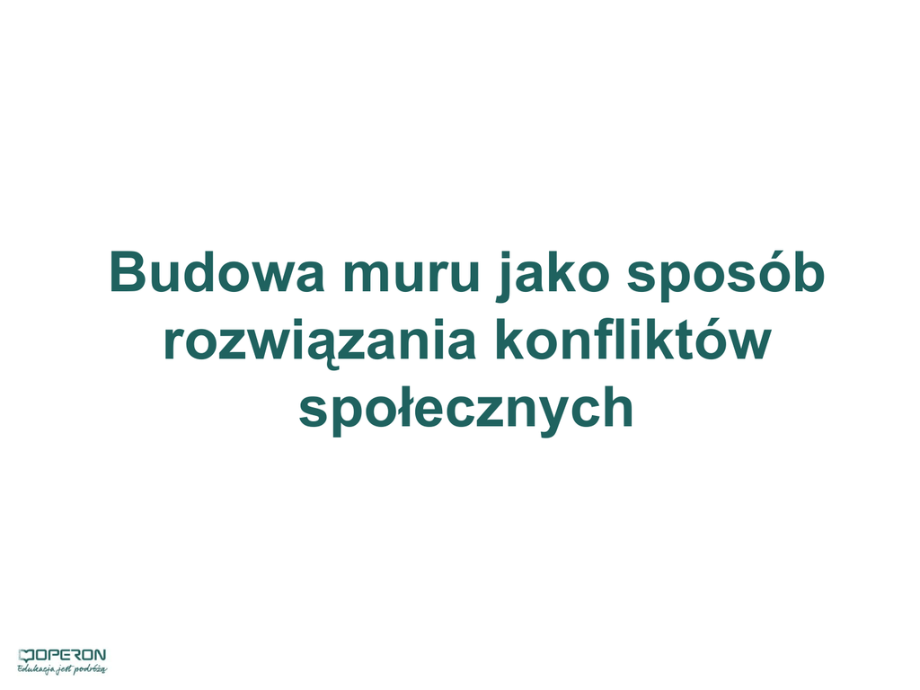 Budowa muru jako sposób rozwiązania konfliktów społecznych Płot elektryczny 412 mld dolarów kosztował Arabię Saudyjską zbudowany w 2006 r. elektroniczny płot na granicy z Irakiem. Całą konstrukcję obsługują urządzenia automatyczne. Marokański mur. W 1975 r. powstał piaskowy wał pełen min o długości 2500 km dzielący Saharę Zachodnią na dwie części – tę należącą do Maroka i tę kontrolowaną przez nomadów z ludu Sahrawi. 3400 km ma mieć trzymetrowa ściana, której budowę już rozpoczęto na granicy Indii i Bangladeszu (na zdjęciu granica między państwami). Tortilla Wall – między Teksasem a Meksykiem – mur zaczęto budować pod koniec lat 80. Szacuje się, że od 2000 r. przy przekraczaniu tej granicy zginęło ok. 1000 osób. Mur między Żydami i Palestyńczykami z Zachodniego Brzegu Jordanu W 2002 r. Izrael rozpoczął budowę wielkiej przegrody, oddzielającej Żydów od Palestyńczyków z Zachodniego Brzegu Jordanu. Ściana pod napięciem ma mieć 8 m wysokości i 670 km długości. Podwójne zapory odgradzają hiszpańskie porty przeładunkowe w Ceuta i Melilli na wybrzeżu afrykańskim. Ostatnie unowocześnienia kosztowały Unię Europejską 60 mln euro. Strefa graniczna między Koreą Północną a Południową. To najszerszy pas fortyfikacji, jaki istnieje – ma 4 km szerokości i 250 km długości.