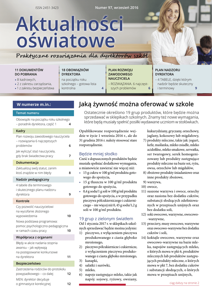 Numer 97, wrzesień 2016 ISSN 2451-3423 Aktualności oświatowe Praktyczne rozwiązania dla dyrektorów szkół 11 DOKUMENTÓW DO POBRANIA 18 OBOWIĄZKÓW DYREKTORA • 8 kadrowych, • 2 z zakresu zarządzania, • 1 z zakresu bezpieczeństwa na początku roku szkolnego – gotowa lista kontrolna PLAN ROZWOJU ZAWODOWEGO NAUCZYCIELA 4 – ROZWIĄZANIA. 6 najczęstszych problemów 6 Temat numeru Obowiązki na początku roku szkolnego – poradnik dyrektora, część 1 4 Ostatecznie określono 19 grup produktów, które będzie można sprzedawać w sklepikach szkolnych. Znamy też nowe wymagania, które będą musiały spełnić posiłki wydawane uczniom w stołówkach. Plan rozwoju zawodowego nauczyciela – rozwiązania 6 najczęstszych problemów 6 Opublikowane rozporządzenie wejdzie w życie 1 września 2016 r., ale do 31 grudnia 2016 r. należy stosować stare rozporządzenie. Jak wyliczyć staż nauczyciela, gdy brak świadectwa pracy Będzie mniej słodko Kadry 7 Dokumentacja 8 Nadzór pedagogiczny 4 tabele dla terminowego i skutecznego planu nadzoru dyrektora 9 Kontrole Czy pozwolić nauczycielowi na wycofanie złożonego wypowiedzenia 10 Nowa podstawa programowa: pomoc psychologiczno-pedagogiczna w ramach czasu pracy 10 Współpraca z organami Błędy w akcie nadania stopnia awansu – jak wpływają na postępowanie konkursowe na dyrektora 11 Bezpieczeństwo Zastrzeżenia rodziców do protokołu powypadkowego – co dalej 12 MEN: dyrektor decyduje o gimnastyce korekcyjnej – 4 TABELE, dzięki którym nadzór będzie skuteczny i terminowy 9 Jaką żywność można oferować w szkole W numerze m.in.: Zaktualizuj swój statut, zanim ktoś znajdzie w nim błędy PLAN NADZORU DYREKTORA 12 Cześć z dopuszczonych produktów będzie musiała spełniać dodatkowe wymagania, a mianowicie zawierać nie więcej niż: • 15 g cukru w 100 g/ml produktu gotowego do spożycia, • 15 g tłuszczu w 100 g/ml produktu gotowego do spożycia, • 0,4 g sodu/1 g soli w 100 g/ml produktu gotowego do spożycia, a w przypadku pieczywa półcukierniczego i cukierniczego – nie więcej niż 0, 45 g sodu/1,2 g soli w 100 g/ml produktu. 19 grup z zielonym światłem Od 1 stycznia 2017 r. w sklepikach szkolnych sprzedawać będzie można jedynie: 1) pieczywo, z wyłączeniem pieczywa produkowanego z ciasta głęboko mrożonego, 2) pieczywo półcukiernicze i cukiernicze, z wyłączeniem pieczywa produkowanego z ciasta głęboko mrożonego, 3)kanapki, 4) sałatki i surówki, 5)mleko, 6) napoje zastępujące mleko, takie jak napój: sojowy, ryżowy, owsiany, kukurydziany, gryczany, orzechowy, jaglany, kokosowy lub migdałowy, 7)produkty mleczne, takie jak: jogurt, kefir, maślanka, mleko zsiadłe, mleko acidofilne, mleko smakowe, serwatka, ser twarogowy, serek homogenizowany lub produkty zastępujące produkty mleczne na bazie soi, ryżu, owsa, orzechów lub migdałów, 8)zbożowe produkty śniadaniowe oraz inne produkty zbożowe, 9)warzywa, 10)owoce, 11)suszone warzywa i owoce, orzechy oraz nasiona bez dodatku cukrów, substancji słodzących zdefiniowanych w przepisach unijnych oraz bez dodatku soli, 12) soki owocowe, warzywne, owocowo-warzywne, 13) przeciery, musy owocowe, warzywne oraz owocowo-warzywne bez dodatku cukrów i soli, 14)koktajle owocowe, warzywne oraz owocowo-warzywne na bazie mleka, napojów zastępujących mleko, o których mowa w pkt 6, produktów mlecznych lub produktów zastępujących produkty mleczne, o których mowa w pkt 7, bez dodatku cukrów i substancji słodzących, o których mowa w przepisach unijnych, ciąg dalszy na stronie 2 Aktualności oświatowe ciąg dalszy ze strony 1 15) naturalna woda mineralna nisko lub średniozmineralizowana, woda źródlana i woda stołowa, 16) napoje przygotowywane na miejscu, które nie mogą zawierać więcej niż 10 g cukrów w 250 ml produktu gotowego do spożycia, 17)napoje bez dodatku cukrów i substancji słodzących zdefiniowanych w przepisach unijnych, 18)bezcukrowe gumy do żucia, 19) czekolada gorzka o zawartości minimum 70% miazgi kakaowej. Nowe zasady w stołówkach Środki spożywcze przeznaczone do zbiorowego żywienia dzieci i młodzieży w jednostkach oświaty będą musiały spełniać 9 wymagań. 1) Posiłki mają być dostosowane do danej grupy wiekowej, wynikać z aktualnych norm żywienia. 2) Na całodzienne żywienie mają składać się środki spożywcze pochodzące z różnych grup środków spożywczych. 3) Posiłki mają zawierać produkty z następujących grup środków spożywczych: produkty zbożowe lub ziemniaki, warzywa lub owoce, mleko lub produkty mleczne, mięso, ryby, jaja, orzechy, nasiona roślin strączkowych i inne nasiona oraz tłuszcze. 4) Zupy, sosy oraz potrawy mają być sporządzane z naturalnych składników, bez użycia koncentratów spożywczych, z wyłączeniem koncentratów z naturalnych składników. 5) Napoje przygotowywane na miejscu mogą zawierać nie więcej niż 10 g cukrów w 250 ml produktu gotowego do spożycia. 6) Od poniedziałku do piątku należy podawać nie więcej niż dwie porcje potrawy smażonej, przy czym do smażenia jest używany olej roślinny rafinowany o zawartości kwasów jednonienasyconych powyżej 50% i zawartości kwasów wielonienasyconych poniżej 40%. 7) Każdego dnia należy podawać: • co najmniej 2 porcje mleka lub produktów mlecznych, • co najmniej jedną porcję z grupy mięso, jaja, orzechy, nasiona roślin strączkowych, • warzywa lub owoce w każdym posiłku, • co najmniej jedną porcję produktów zbożowych w śniadaniu, obiedzie oraz kolacji. 8) W żywieniu całodziennym należy podawać przynajmniej pięć porcji warzyw lub owoców. 9) Co najmniej raz w tygodniu należy podawać porcję ryby. Podstawa prawna: Rozporządzenie Ministra Zdrowia z 26 lipca 2016 r. w sprawie grup środków spożywczych przeznaczonych do sprzedaży dzieciom i młodzieży w jednostkach systemu oświaty oraz wymagań, jakie muszą spełniać środki spożywcze 