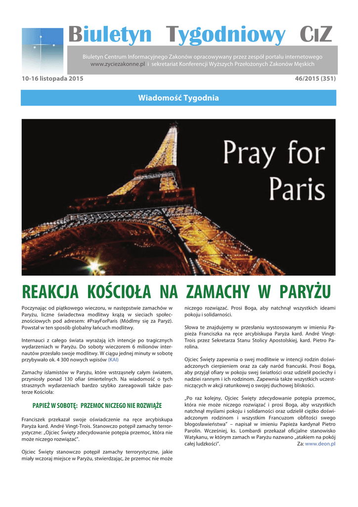 Biuletyn Tygodniowy CIZ Biuletyn Centrum Informacyjnego Zakonów opracowywany przez zespół portalu internetowego www.zyciezakonne.pl i sekretariat Konferencji Wyższych Przełożonych Zakonów Męskich 10-16 listopada 2015 46/2015 (351) Wiadomość Tygodnia ! REAKCJA KOŚCIOŁA NA ZAMACHY W PARYŻU Poczynając od piątkowego wieczoru, w następstwie zamachów w Paryżu, liczne świadectwa modlitwy krążą w sieciach społecznościowych pod adresem: #PrayForParis (Módlmy się za Paryż). Powstał w ten sposób globalny łańcuch modlitwy. Internauci z całego świata wyrażają ich intencje po tragicznych wydarzeniach w Paryżu. Do soboty wieczorem 6 milionów internautów przesłało swoje modlitwy. W ciągu jednej minuty w sobotę przybywało ok. 4 300 nowych wpisów (KAI) Zamachy islamistów w Paryżu, które wstrząsneły całym światem, przyniosły ponad 130 ofiar śmiertelnych. Na wiadomość o tych strasznych wydarzeniach bardzo szybko zareagowali także pasterze Kościoła: PAPIEŻ W SOBOTĘ: PRZEMOC NICZEGO NIE ROZWIĄŻE Franciszek przekazał swoje oświadczenie na ręce arcybiskupa Paryża kard. André Vingt-Trois. Stanowczo potępił zamachy terrorystyczne: „Ojciec Święty zdecydowanie potępia przemoc, która nie może niczego rozwiązać”. Ojciec Święty stanowczo potępił zamachy terrorystyczne, jakie miały wczoraj miejsce w Paryżu, stwierdzając, że przemoc nie może niczego rozwiązać. Prosi Boga, aby natchnął wszystkich ideami pokoju i solidarności. Słowa te znajdujemy w przesłaniu wystosowanym w imieniu Papieża Franciszka na ręce arcybiskupa Paryża kard. André VingtTrois przez Sekretarza Stanu Stolicy Apostolskiej, kard. Pietro Parolina. Ojciec Święty zapewnia o swej modlitwie w intencji rodzin doświadczonych cierpieniem oraz za cały naród francuski. Prosi Boga, aby przyjął ofiary w pokoju swej światłości oraz udzielił pociechy i nadziei rannym i ich rodzinom. Zapewnia także wszystkich uczestniczących w akcji ratunkowej o swojej duchowej bliskości. „Po raz kolejny, Ojciec Święty zdecydowanie potępia przemoc, która nie może niczego rozwiązać i prosi Boga, aby wszystkich natchnął myślami pokoju i solidarności oraz udzielił ciężko doświadczonym rodzinom i wszystkim Francuzom obfitości swego błogosławieństwa” – napisał w imieniu Papieża kardynał Pietro Parolin. Wcześniej, ks. Lombardi przekazał oficjalne stanowisko Watykanu, w którym zamach w Paryżu nazwano „atakiem na pokój całej ludzkości”. Za: www.deon.pl 10-16 listopada 2015 Biuletyn Tygodniowy CiZ 46/2015 (351) ______________________________________________________________________________________________ PAPIEŻ W NIEDZIELĘ: BLUŹNIERSTWO I BARBARZYŃSTWO całym światem – mówił papież. Po chwili ciszy wszyscy odmówili modlitwę Zdrowaś Maryjo. Za: Radio watykanskie Droga przemocy i nienawiści nie rozwiąże problemów ludzkości – powiedział papież Franciszek po południowej modlitwie „Anioł Pański”. Wyraził swój „głęboki smutek z powodu ataków terrorystycznych, które w piątek późnym wieczorem zanurzyły Francję we krwi, powodując wiele ofiar”. LIST PRZEWODNICZĄCEGO KEP DO ARCYBISKUPA PARYŻA Eminencjo, Kardynale Vingt-Trois, Arcybiskupie Paryża, w imieniu Kościoła katolickiego w Polsce składam wyrazy współczucia oraz zapewniam o naszej solidarności z ofiarami wczorajszych zamachów w Paryżu. W sposób szczególny łączymy się w bólu z rodzinami zamordowanych i rannych oraz ze wszystkimi, którzy boleśnie przeżywają tę tragedię. Prezydentowi Republiki Francuskiej i wszystkim obywatelom tego kraju składam wyrazy mojego najgłębszego współczucia. Szczególnie blisko jestem rodzin osób, które straciły życie i rannych – podkreślił papież. Jezus Chrystus powiedział: „Pokój zostawiam wam, pokój mój daję wam. Nie tak jak daje świat, Ja wam daję. Niech się nie trwoży serce wasze ani się lęka!” (J 14,27). Przypominam słowa Jezusa w tej tragicznej sytuacji chcąc dodać otuchy i życzyć, aby nie trwożyły się serca Fracuzów, aby nie dali się zastraszyć i zwyciężyć złu, lecz by potrafili zło dobrem zwyciężać (por. Rz 12,21). To wielkie barbarzyństwo budzi nasz niepokój i zastanawiamy się, jak ludzkie serce może wymyślić i dokonać takich strasznych wydarzeń, które wstrząsnęły nie tylko Francją, ale i całym światem. W obliczu tych niedopuszczalnych czynów, nie można nie potępić oburzającej obelgi dla godności osoby ludzkiej. Pragnę stanowczo potwierdzić, że droga przemocy i nienawiści nie rozwiąże problemów ludzkości! I że używanie imienia Bożego dla usprawiedliwienia tej drogi jest bluźnierstwem – wskazał Franciszek. Biskupi polscy, kapłani, osoby życia konsekrowanego i katolicy w Polsce łączą się w modlitwie, aby Francja mogła cieszyć się trwałym pokojem i bezpieczeństwem jej obywateli. Modlimy się, aby nigdy więcej nie było zamachów, które są przeciw uniwersalnemu Prawu Bożemu i przykazaniu miłości Boga i bliźniego. Łącząc się w bólu, + Stanisław Gądecki, Arcybiskup Metropolita Poznański, Przewodniczący Konferencji Episkopatu Polski. Za: www.episkopat.pl Zachęcił wszystkich do przyłączenia się do jego modlitwy. – Powierzmy miłosierdziu Bożemu bezbronne ofiary tej tragedii. Niech Maryja Panna, Matka Miłosierdzia wzbudzi w sercach wszystkich ludzi myśli mądrości i postanowienia pokoju. Prosimy Ją, by chroniła i czuwała nad umiłowanym narodem francuskim, Europą i Wiadomości z kraju NA JASNEJ GÓRZE MODLITWA ZA OFIARY ZAMACHÓW W PARYŻU Na Jasnej Górze trwa modlitwa w intencji ofiar zamachów w Paryżu. Podczas każdej Mszy św. zanoszone są modlitwy za zabitych i rannych, za ich rodziny, a także intencje o pokój na świecie. „Na Jasnej Górze modlimy się za naszych braci, którzy zginęli w zamachach w Paryżu, ale również za tych, którzy cierpią po stracie swoich bl