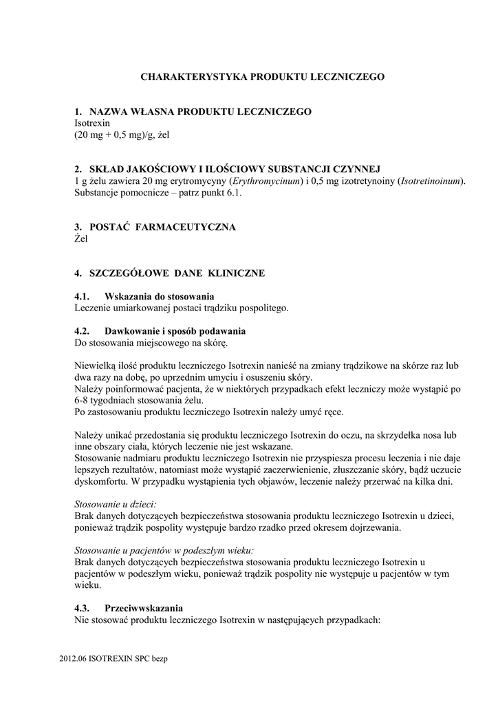 CHARAKTERYSTYKA PRODUKTU LECZNICZEGO 1. NAZWA WŁASNA PRODUKTU LECZNICZEGO Isotrexin (20 mg + 0,5 mg)/g, żel 2. SKŁAD JAKOŚCIOWY I ILOŚCIOWY SUBSTANCJI CZYNNEJ 1 g żelu zawiera 20 mg erytromycyny (Erythromycinum) i 0,5 mg izotretynoiny (Isotretinoinum). Substancje pomocnicze – patrz punkt 6.1. 3. POSTAĆ FARMACEUTYCZNA Żel 4. SZCZEGÓŁOWE DANE KLINICZNE 4.1. Wskazania do stosowania Leczenie umiarkowanej postaci trądziku pospolitego. 4.2. Dawkowanie i sposób podawania Do stosowania miejscowego na skórę. Niewielką ilość produktu leczniczego Isotrexin nanieść na zmiany trądzikowe na skórze raz lub dwa razy na dobę, po uprzednim umyciu i osuszeniu skóry. Należy poinformować pacjenta, że w niektórych przypadkach efekt leczniczy może wystąpić po 6-8 tygodniach stosowania żelu. Po zastosowaniu produktu leczniczego Isotrexin należy umyć ręce. Należy unikać przedostania się produktu leczniczego Isotrexin do oczu, na skrzydełka nosa lub inne obszary ciała, których leczenie nie jest wskazane. Stosowanie nadmiaru produktu leczniczego Isotrexin nie przyspiesza procesu leczenia i nie daje lepszych rezultatów, natomiast może wystąpić zaczerwienienie, złuszczanie skóry, bądź uczucie dyskomfortu. W przypadku wystąpienia tych objawów, leczenie należy przerwać na kilka dni. Stosowanie u dzieci: Brak danych dotyczących bezpieczeństwa stosowania produktu leczniczego Isotrexin u dzieci, ponieważ trądzik pospolity występuje bardzo rzadko przed okresem dojrzewania. Stosowanie u pacjentów w podeszłym wieku: Brak danych dotyczących bezpieczeństwa stosowania produktu leczniczego Isotrexin u pacjentów w podeszłym wieku, ponieważ trądzik pospolity nie występuje u pacjentów w tym wieku. 4.3. Przeciwwskazania Nie stosować produktu leczniczego Isotrexin w następujących przypadkach: 2012.06 ISOTREXIN SPC bezp − nadwrażliwość na erytromycynę, lub na którąkolwiek substancję pomocniczą produktu leczniczego, − ostry wyprysk, − trądzik różowaty, − okołowargowe zapalenie skóry, − okres ciąży i karmienia piersią, − u kobiet planujących ciążę. 4.4. Ostrzeżenia specjalne i środki ostrożności dotyczące stosowania Należy unikać kontaktu produktu leczniczego Isotrexin z oczami, ustami, błonami śluzowymi oraz stosowania na skórę podrażnioną, otartą lub z wypryskiem. Isotrexin należy stosować ostrożnie na wrażliwe obszary skóry, np. na szyję. Podczas leczenia należy unikać długotrwałego działania promieniowania słoneczego oraz sztucznych źródeł promieniowania UV (np. solaria, lampy kwarcowe), ponieważ produkt leczniczy Isotrexin może zwiększać wrażliwość na działanie promieniowania słonecznego. W przypadku wystąpienia reakcji na światło słoneczne, leczenie należy czasowo przerwać. Jeśli nie można uniknąć narażenia na promieniowanie słoneczne, należy stosować produkty zawierające odpowiednie filtry UVB i UVA oraz odzież ochronną na obszar leczonej skóry. W przypadku długotrwałego stosowania środków złuszczających, przed rozpoczęciem leczenia produktem leczniczym Isotrexin należy zaprzestać ich stosowania. Jeśli produkt leczniczy Isotrexin i środki złuszczające są stosowane kolejno jeden po drugim, produkt leczniczy Isotrexin należy stosować rzadziej, gdyż może wystąpić podrażnienie lub stan zapalny skóry. 4.5. Interakcje z innymi lekami i inne rodzaje interakcji Ze względu na ryzyko nasilenia działania drażniącego, należy zachować ostrożność w przypadku jednoczesnego miejscowego stosowania antybiotyków, mydeł leczniczych lub ścierających oraz środków myjących, mydeł i kosmetyków o silnym działaniu wysuszającym, a także środków z dużą zawartościa alkoholu i (lub) środków ściągających. Szczególną ostrożność należy zachować podczas stosowania produktów zawierających środki złuszczające (np. nadtlenek benzoilu). 4.6. Ciąża i laktacja Ciąża Brak danych dotyczących bezpieczeństwa stosowania produktu leczniczego Isotrexin u kobiet w ciąży (patrz punkt 5.3). Izotretynoina w postaci o działaniu ogólnoustrojowym może działać teratogennie. Nie należy stosować produktu leczniczego Isotrexin u kobiet w ciąży i planujących ciążę. Leczenie należy przerwać na jeden cykl przed planowaną ciążą. Laktacja Brak danych dotyczących bezpieczeństwo stosowania produktu leczniczego Isotrexin u kobiet w okresie karmienia piersią. Absorpcja izotretynoiny z produktu leczniczego Isotrexin przez skórę jest niewielka. Nie wiadomo, czy izotretynoina przenika do mleka matki, dlatego nie należy stosować żelu Isotrexin w okresie karmienia piersią. Nie należy stosować produktu leczniczego Isotrexin w okresie karmienia piersią. 4.7. Wpływ na zdolność prowadzenia pojazdów mechanicznych i obsługiwania urządzeń mechanicznych ruchu ISOTREXIN SPC bezp_clean.doc 2 Produkt leczniczy Isotrexin nie ma wpływu na zdolność do prowadzenia pojazdów mechanicznych i obsługiwania urządzeń mechanicznych ruchu. 4.8. Działania niepożądane Może wystąpić uczucie parzenia, pieczenia, podrażnienie, rumień i złuszczanie skóry w miejscu stosowania produktu leczniczego Isotrexin. Te niepożądane objawy miejscowe zwykle ustępują wraz z kontynuacją leczenia. W przypadku silnego podrażnienia skóry, leczenie należy czasowo przerwać i rozpocząć ponownie po ustąpieniu objawów niepożądanych. Jeśli podrażnienie utrzymuje się nadal, leczenie nie powinno być kontynuowane. Objawy niepożądane zwykle ustępują po przerwaniu leczenia. Odnotowano nasilenie wrażliwości na promieniowanie słoneczne i inne źródła promieniowania UVB. W razie długotrwałego stosowania preparatu (ze względu na zawartość erytromycyny), rzadko może wystąpić zapalenie mieszków włosowych, spowodowane zakażeniem bakteriami Gramujemnymi. W takim przypadku należy zaprzestać stosowania produktu leczniczego Isotrexin. 4.9. Przed