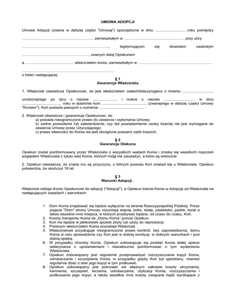 odpowiedniej opieki nad Koniem. Opieun niniejszym zrzeka się względem Właściciela