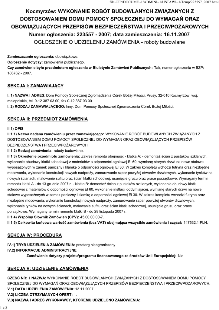 1z2 file:///C:/DOCUME~1/ADMINI~1/USTAWI~1/Temp/223557_2007.html Kocmyrzów: WYKONANIE ROBÓT BUDOWLANYCH ZWIĄZANYCH Z DOSTOSOWANIEM DOMU POMOCY SPOŁECZNEJ DO WYMAGAŃ ORAZ OBOWIĄZUJĄCYCH PRZEPISÓW BEZPIECZEŃSTWA I PRZECIWPOśAROWYCH Numer ogłoszenia: 223557 - 2007; data zamieszczenia: 16.11.2007 OGŁOSZENIE O UDZIELENIU ZAMÓWIENIA - roboty budowlane Zamieszczanie ogłoszenia: obowiązkowe. Ogłoszenie dotyczy: zamówienia publicznego. Czy zamówienie było przedmiotem ogłoszenia w Biuletynie Zamówień Publicznych: Tak, numer ogłoszenia w BZP: 186762 - 2007. SEKCJA I: ZAMAWIAJĄCY I. 1) NAZWA I ADRES: Dom Pomocy Społecznej Zgromadzenia Córek BoŜej Miłości, Prusy, 32-010 Kocmyrzów, woj. małopolskie, tel. 0-12 387 03 00, fax 0-12 387 03 00. I. 2) RODZAJ ZAMAWIAJĄCEGO: Inny: Dom Pomocy Społecznej Zgromadzenia Córek BoŜej Miłości. SEKCJA II: PRZEDMIOT ZAMÓWIENIA II.1) OPIS II.1.1) Nazwa nadana zamówieniu przez zamawiającego: WYKONANIE ROBÓT BUDOWLANYCH ZWIĄZANYCH Z DOSTOSOWANIEM DOMU POMOCY SPOŁECZNEJ DO WYMAGAŃ ORAZ OBOWIĄZUJĄCYCH PRZEPISÓW BEZPIECZEŃSTWA I PRZECIWPOśAROWYCH. II.1.2) Rodzaj zamówienia: roboty budowlane. II.1.3) Określenie przedmiotu zamówienia: Zakres remontu obejmuje: - klatka A: - demontaŜ ścian z pustaków szklanych, wykonanie obudowy klatki schodowej z materiałów o odporności ogniowej El 60, wymianę starych drzwi na nowe stalowe wyposaŜonych w zamek paniczny i klamkę o odporności ogniowej El 30. W zakres kompletu wchodzi futryna oraz niezbędne mocowania, wykonanie konstrukcji nowych nadproŜy, zamurowanie szpar powyŜej otworów drzwiowych, wykonanie tynków na nowych ścianach, malowanie sufitu oraz ścian klatki schodowej, usunięcie gruzu oraz prace porządkowe. Wymagany termin remontu klatki A - do 13 grudnia 2007 r. - klatka B: demontaŜ ścian z pustaków szklanych, wykonanie obudowy klatki schodowej z materiałów o odporności ogniowej El 60, wykonanie instlacji oddymiajacej, wymianę starych drzwi na nowe stalowe wyposaŜonych w zamek paniczny i klamkę o odporności ogniowej El 30. W zakres kompletu wchodzi futryna oraz niezbędne mocowania, wykonanie konstrukcji nowych nadproŜy, zamurowanie szpar powyŜej otworów drzwiowych, wykonanie tynków na nowych ścianach, malowanie sufitu oraz ścian klatki schodowej, usunięcie gruzu oraz prace porządkowe. Wymagany termin remontu klatki B - do 28 listopada 2007 r. II.1.4) Wspólny Słownik Zamówień (CPV): 45.00.00.00-7. II.1.5) Całkowita końcowa wartość zamówienia (bez VAT) obejmująca wszystkie zamówienia i części: 147532,1 PLN. SEKCJA IV: PROCEDURA IV.1) TRYB UDZIELENIA ZAMÓWIENIA: przetarg nieograniczony IV.2) INFORMACJE ADMINISTRACYJNE Zamówienie dotyczy projektu/programu finansowanego ze środków Unii Europejskiej: Nie SEKCJA V: UDZIELENIE ZAMÓWIENIA CZĘŚĆ NR: 1 NAZWA: WYKONANIE ROBÓT BUDOWLANYCH ZWIĄZANYCH Z DOSTOSOWANIEM DOMU POMOCY SPOŁECZNEJ DO WYMAGAŃ ORAZ OBOWIĄZUJĄCYCH PRZEPISÓW BEZPIECZEŃSTWA I PRZECIWPOśAROWYCH. V.1) DATA UDZIELENIA ZAMÓWIENIA: 13.11.2007. V.2) LICZBA OTRZYMANYCH OFERT: 1. V.3) NAZWA I ADRES WYKONAWCY, KTÓREMU UDZIELONO ZAMÓWIENIA: 2z2 file:///C:/DOCUME~1/ADMINI~1/USTAWI~1/Temp/223557_2007.html INTERPRODUKT, Łepkowskiego 8/60, 31-422 Kraków, kraj/woj. małopolskie. V.4) INFORMACJA O CENIE WYBRANEJ OFERTY ORAZ O NIE PODLEGAJĄCYCH ODRZUCENIU OFERTACH Z NAJNIśSZĄ I NAJWYśSZĄ CENĄ (bez VAT) Cena wybranej oferty: 147532.10 Oferta z najniŜszą ceną: 147532.10 / oferta z najwyŜszą ceną: 147532.10 Waluta: PLN.