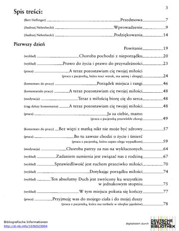 Spis treści: Przedmowa 7 (Andrzej Nehrebecki) Wprowadzenie 9 (Andrzej Nehrebecki) Podziękowania 14 Powitanie 19 (wykład) Choroba pochodzi z nieporządku 20 (wykład) Prawo do życia i prawo do przynależności 23 (Bert Hellinger) Pierwszy dzień (praca) A teraz pozostawiam cię twojej miłości (praca z pacjentką, która traci wzrok, ma astmę i alergię) 24 (komentarz do pracy) Porządek miejsca i rangi 46 (komentarzdo pracy) A teraz pozostawiam cię twojej miłości 48 Teraz z miłością biorę cię do serca 48 teraz pozostawiam cię twojej miłości 48 (medytacja) (ciąg dalszy komentarza) A Ja za ciebie, mamo (praca) (komentarz do pracy) (praca) (praca z pacjentką przewlekle chorą) 49 Bez więzi z matką nikt nie może być zdrowy 57 Bo tu zawsze chodzi o życie i śmierć (praca z pacjentką, która często ulega wypadkom) 59 Choroba patrzy za nas na wykluczonych 64 (wykład) Zadaniem sumienia jest związać nas z rodziną 67 (wykład) Sprawiedliwość jest ruchem przeciwko miłości 70 (wykład) Dotykając porządku miłości 74 (wykład) Ten absolutny Duch jest zwrócony ku wszystkim w jednakowym stopniu 75 tym miejscu pokuta się kończy 77 (medytacja) (wykład) (praca) W Przyjmuję was do mojego ciała i do mojej duszy (praca z pacjentką, która ma torbiele w obrębie jajników) http://d-nb.info/1036523004 78 4 (omówienie pracy)_Przyjmuję was do mojego ciała i do mojej duszy 87 Czym jest duchowe uzdrawianie 89 Uzdrowienie poprzez połączenie się z ruchem Ducha 90 (wykład) (medytacja) Druei dzień (wykład) Powitanie 93 Choroba ma związek z nieporządkiem w duszy 93 (praca) Gdy głowa reprezentuje wykluczoną osobę (praca z osobą zagrożoną chorobą nowotworową) 95 Gdy głowa reprezentuje wykluczoną osobę 117 (medytacja) Uzdrawiająca moc życzliwości 118 (wykład) Duchowe ustawienia rodzinne 119 od czego uciekamy, prowadzi nas ku miłości 121 (omówienie pracy) (ćwiczenie duchowe)_To, : (praca) 122 Ty jesteś mały 146 Pytanie o znaczenie słowa „proszę" 149 Uzależnienie jako poszukiwanie pełni 150 Być w zgodzie z ruchem Ducha 151 (omówienie pracy) (wykład) (medytacja) (praca) Ty jesteś mały (praca na rzecz dziecka z zanikiem kości udowej) Za jakiś czas dołączę do was (praca z osobą uzależnioną od nikotyny i alkoholu) 154 Jak osiągamy pełnię 165 (wykład) Choroba jako wynik klątwy 167 (wykład) O zaburzeniach odżywiania 169 (komentarz do pracy) (praca) (komentarz do pracy) (wykład) Widzę was i kocham was (praca z pacjentem chorym na schizofrenię) 171 Widzę was i kocham was 190 Czym jest schizofrenia i jak ją uzdrawiać 191 Trzeci dzień Powitanie. _Nasza rodzina jest naszym losem (praca). (praca z pacjentką z nowotworami narządów rodnych). .197 Nasza rodzina jest naszym losem. .210 Powiedz „proszę" tam, gdzie nie wolno ci patrzeć. .211 (komentarz do pracy)_ (medytacja) (praca) Tu nie wolno mi nic zrobić (praca z pacjentką chorą na chorobę autoimmunologiczną). (praca). .215 Mam upośledzone dziecko (praca dla upośledzonego dziecka, chorego na artrogrypozę). (praca). .212 Zostawiam cię tam z miłością, mamo (praca z pacjentem po usunięciu złośliwego guza i radioterapii). (praca). .195 .225 Ty nie żyjesz i martwym pozostaniesz (praca z pacjentem, którego pierwszy brat popełni! samobójstwo, a drugi choruje na anoreksję). (praca). (wyktad) (medytacja), (praca) Zanika mi twarz (praca z pacjentką z zanikami mięśni twarzy). .262 O duszy rodziny. .272 .O tym, który nie nosi żadnej winy. .274 Miłość, która uzdrawia (praca z pacjentem z lękami i uporczywymi bólami głowy). (praca). (medytacja), (praca) (wykład) (medytacja) .275 Moja córka się zabiła (praca z pacjentką, której córka popełniła samobójstwo). .280 _Pozwólmy się pochwycić przez ruch Ducha. .291 Ja to już wiem (praca z pacjentką ze stanami lękowymi i depresją). (praca)_ .247 .292 Tak tanio nie da się tego kupić (praca z pacjentką chorą na cukrzycę). .293 .Aborcja i niektóre skutki, jakie niesie dla rodziny. .307 Spójrzmy na coś boskiego, co porusza winnych i ofiary. .309 6 Tak, umrę za Ciebie, mamo (praca) (praca z pacjentką z nowotworem jelita grubego po radio- i chemioterapii) 310 Tak, umrę za Ciebie, mamo 321 Weźmy ich wszystkich z wdzięcznością do serca 323 Powitanie 327 Stając z pokorą wobec własnej śmierci 328 Ustawienia duchowe są tym, co prowadzi nas do szczęścia i spełnienia 332 (komentarz do pracy) (medytacja) Czwarty dzień (medytacja) (wykład) (praca) W tej pracy dotknęliśmy czegoś wielkiego (praca z pacjentką z guzem macicy, tarczycy, silnymi migrenami i jaskrą) (medytacja)_Jak 335 uwolnić się od zmarłych, którzy ciągną nas ku śmierci? 352 Ostatni wykład 353 Komentarze do pracy Berta Hellingera .361