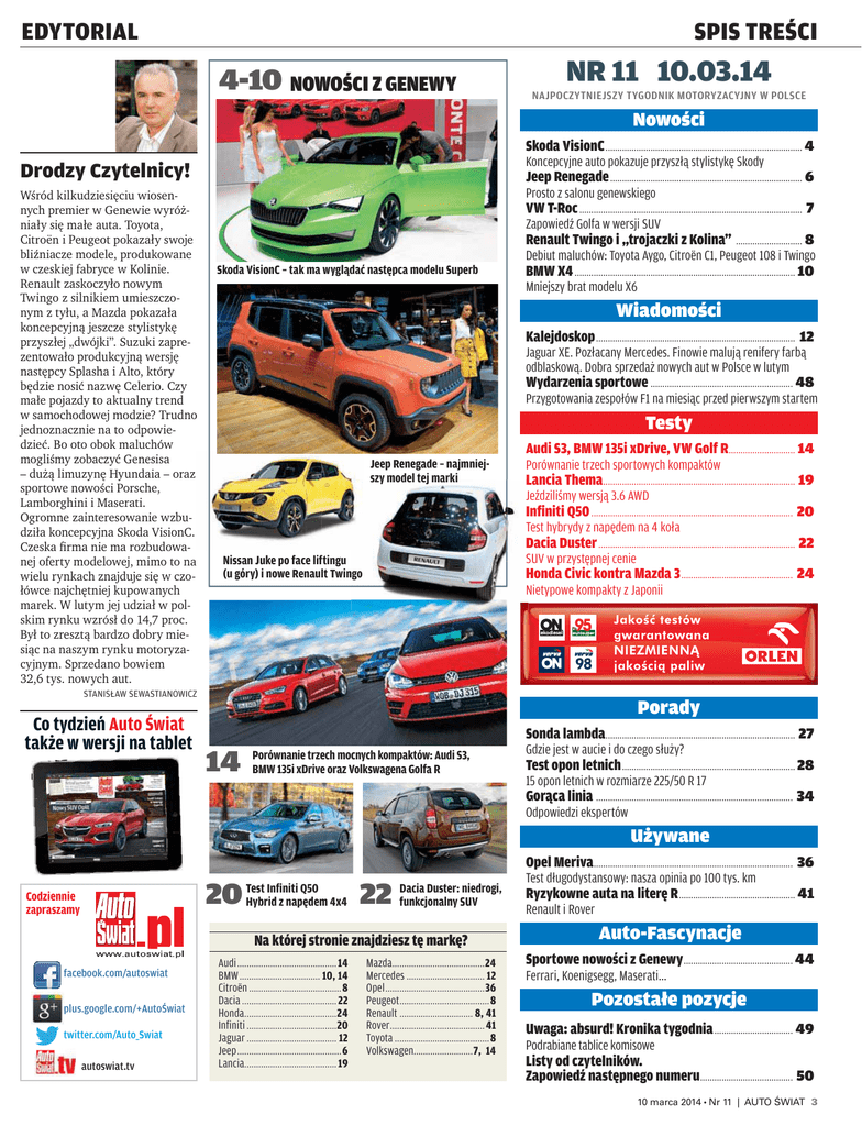 EDYTORIAL SPIS TREŚCI 4-10 NOWOŚCI Z GENEWY NR 11 10.03.14 NAJPOCZYTNIEJSZY TYGODNIK MOTORYZACYJNY W POLSCE Nowości Skoda VisionC ................................................................................... 4 Koncepcyjne auto pokazuje przyszłą stylistykę Skody Drodzy Czytelnicy! Wśród kilkudziesięciu wiosennych premier w Genewie wyróżniały się małe auta. Toyota, Citroën i Peugeot pokazały swoje bliźniacze modele, produkowane w czeskiej fabryce w Kolinie. Renault zaskoczyło nowym Twingo z silnikiem umieszczonym z tyłu, a Mazda pokazała koncepcyjną jeszcze stylistykę przyszłej „dwójki”. Suzuki zaprezentowało produkcyjną wersję następcy Splasha i Alto, który będzie nosić nazwę Celerio. Czy małe pojazdy to aktualny trend w samochodowej modzie? Trudno jednoznacznie na to odpowiedzieć. Bo oto obok maluchów mogliśmy zobaczyć Genesisa – dużą limuzynę Hyundaia – oraz sportowe nowości Porsche, Lamborghini i Maserati. Ogromne zainteresowanie wzbudziła koncepcyjna Skoda VisionC. Czeska firma nie ma rozbudowanej oferty modelowej, mimo to na wielu rynkach znajduje się w czołówce najchętniej kupowanych marek. W lutym jej udział w polskim rynku wzrósł do 14,7 proc. Był to zresztą bardzo dobry miesiąc na naszym rynku motoryzacyjnym. Sprzedano bowiem 32,6 tys. nowych aut. Jeep Renegade ................................................................................. 6 Prosto z salonu genewskiego VW T-Roc .............................................................................................. 7 Zapowiedź Golfa w wersji SUV Renault Twingo i „trojaczki z Kolina” ............................ 8 Debiut maluchów: Toyota Aygo, Citroën C1, Peugeot 108 i Twingo Skoda VisionC – tak ma wyglądać następca modelu Superb BMW X4 ............................................................................................. 10 Mniejszy brat modelu X6 Wiadomości Kalejdoskop .................................................................................... 12 Jaguar XE. Pozłacany Mercedes. Finowie malują renifery farbą odblaskową. Dobra sprzedaż nowych aut w Polsce w lutym Wydarzenia sportowe ............................................................ 48 Przygotowania zespołów F1 na miesiąc przed pierwszym startem Testy Audi S3, BMW 135i xDrive, VW Golf R............................ 14 Jeep Renegade – najmniejszy model tej marki Porównanie trzech sportowych kompaktów LLancia Thema................................................................................. 19 JJeździliśmy wersją 3.6 AWD IInfiniti Q50 ..................................................................................... 20 TTest hybrydy z napędem na 4 koła Dacia Duster ................................................................................... 22 D SSUV w przystępnej cenie Nissan Juke po face liftingu (u góry) i nowe Renault Twingo ngo Honda Civic kontra Mazda 3 ............................................... 24 H NNietypowe kompakty z Japonii STANISŁAW SEWASTIANOWICZ Co tydzień Auto Świat także w wersji na tablet Porady 14 Sonda lambda................................................................................ 27 Porównanie trzech mocnych kompaktów: Audi S3, BMW 135i xDrive oraz Volkswagena Golfa R Gdzie jest w aucie i do czego służy? Test opon letnich ......................................................................... 28 15 opon letnich w rozmiarze 225/50 R 17 Gorąca linia ................................................................................... 34 Odpowiedzi ekspertów Używane Opel Meriva.................................................................................... 36 20 Codziennie zapraszamy Test Infiniti Q50 Hybrid z napędem 4x4 22 Dacia Duster: niedrogi, funkcjonalny SUV Na której stronie znajdziesz tę markę? facebook.com/autoswiat plus.google.com/+AutoŚwiat twitter.com/Auto_Swiat autoswiat.tv Audi .......................................... 14 BMW .................................. 10, 14 Citroën .......................................8 Dacia ........................................ 22 Honda.......................................24 Infiniti ......................................20 Jaguar ...................................... 12 Jeep ............................................6 Lancia....................................... 19 Mazda.......................................24 Mercedes ................................. 12 Opel ..........................................36 Peugeot ......................................8 Renault ............................... 8, 41 Rover ........................................ 41 Toyota ........................................8 Volkswagen.........................7, 14 Test długodystansowy: nasza opinia po 100 tys. km Ryzykowne auta na literę R ................................................. 41 Renault i Rover Auto-Fascynacje Sportowe nowości z Genewy .............................................. 44 Ferrari, Koenigsegg, Maserati... Pozostałe pozycje Uwaga: absurd! Kronika tygodnia ................................. 49 Podrabiane tablice komisowe Listy od czytelników. Zapowiedź następnego numeru....................................... 50 10 marca 2014 Nr 11 | AUTO ŚWIAT 3