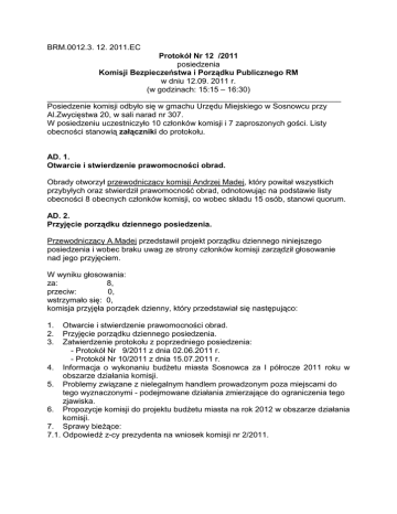 BRM.0012.3. 12. 2011.EC Protokół Nr 12 /2011 posiedzenia Komisji Bezpieczeństwa i Porządku Publicznego RM w dniu 12.09. 2011 r. (w godzinach: 15:15 – 16:30) __________________________________________________________________ Posiedzenie komisji odbyło się w gmachu Urzędu Miejskiego w Sosnowcu przy Al.Zwycięstwa 20, w sali narad nr 307. W posiedzeniu uczestniczyło 10 członków komisji i 7 zaproszonych gości. Listy obecności stanowią załączniki do protokołu. AD. 1. Otwarcie i stwierdzenie prawomocności obrad. Obrady otworzył przewodniczący komisji Andrzej Madej, który powitał wszystkich przybyłych oraz stwierdził prawomocność obrad, odnotowując na podstawie listy obecności 8 obecnych członków komisji, co wobec składu 15 osób, stanowi quorum. AD. 2. Przyjęcie porządku dziennego posiedzenia. Przewodniczący A.Madej przedstawił projekt porządku dziennego niniejszego posiedzenia i wobec braku uwag ze strony członków komisji zarządził głosowanie nad jego przyjęciem. W wyniku głosowania: za: 8, przeciw: 0, wstrzymało się: 0, komisja przyjęła porządek dzienny, który przedstawiał się następująco: 1. 2. 3. Otwarcie i stwierdzenie prawomocności obrad. Przyjęcie porządku dziennego posiedzenia. Zatwierdzenie protokołu z poprzedniego posiedzenia: - Protokół Nr 9/2011 z dnia 02.06.2011 r. - Protokół Nr 10/2011 z dnia 15.07.2011 r. 4. Informacja o wykonaniu budżetu miasta Sosnowca za I półrocze 2011 roku w obszarze działania komisji. 5. Problemy związane z nielegalnym handlem prowadzonym poza miejscami do tego wyznaczonymi - podejmowane działania zmierzające do ograniczenia tego zjawiska. 6. Propozycje komisji do projektu budżetu miasta na rok 2012 w obszarze działania komisji. 7. Sprawy bieżące: 7.1. Odpowiedź z-cy prezydenta na wniosek komisji nr 2/2011. AD. 3. Zatwierdzenie protokołu z poprzedniego posiedzenia. Przewodniczący A.Madej przedstawił: - Protokół Nr 9/2011 z posiedzenia komisji w dniu 02.06.2011 r. - Protokół Nr 10/2011 z posiedzenia komisji w dniu 15.07.2011 r. i wobec braku uwag ze strony członków komisji zarządził głosowania nad jego przyjęciem. W wyniku głosowania: za: 8, przeciw: 0, wstrzymało się: 0, komisja przyjęła Protokół nr 9/2011. W wyniku głosowania: za: 8, przeciw: 0, wstrzymało się: 0, komisja przyjęła Protokół nr 10/2011. AD.4. Informacja o wykonaniu budżetu miasta Sosnowca za I półrocze 2011 roku w obszarze działania komisji. Skarbnik miasta J.Kaczor zreferował wykonanie budżetu miasta za I półrocze 2011 r. oraz kształtowanie się wieloletniej prognozy finansowej miasta za I półrocze 2011 roku w zakresie działania komisji. Materiały pisemne stanowią załączniki do protokołu. Przewodniczący A.Madej podsumowując zarządził głosowanie nad przyjęciem pozytywnej opinii do projektu uchwały w sprawie: przyjęcia Informacji o przebiegu wykonania budżetu miasta Sosnowca za I półrocze 2011 r. – w obszarze działania komisji. W wyniku głosowania: za: 9, przeciw: 1, wstrzymało się: 0, komisja przyjęła w/w opinię, a jej tekst stanowi załącznik do protokołu. Następnie przewodniczący A.Madej zarządził głosowanie nad przyjęciem pozytywnej opinii do projektu uchwały Rady Miejskiej w sprawie: przyjęcia Informacji o kształtowaniu się wieloletniej prognozy finansowej za I półrocze 2011 r. - w obszarze działania komisji. 2 W wyniku głosowania: za: 10, przeciw: 0, wstrzymało się: 0, komisja przyjęła w/w opinię, a jej tekst stanowi załącznik do protokołu. AD.5. Problemy związane z nielegalnym handlem prowadzonym poza miejscami do tego wyznaczonymi - podejmowane działania zmierzające do ograniczenia tego zjawiska. Przewodniczący A.Madej wskazał na materiały tematyczne przygotowane przez Wydział Polityki Gospodarczej, Wydział Organizacji Drogami i Ruchem Drogowym, Wydział Gospodarki Komunalnej i Mieszkaniowej oraz Straż Miejska. Stanowią one załącznik do protokołu. Stanowią one załączniki do protokołu. Powiedział, że 31 sierpnia 2011 r. sejm uchwalił nowelę do ustawy Kodeks wykroczeń, która przewiduje karę grzywny do 5 tys. zł oraz możliwość przepadku towaru za handel poza miejscem wyznaczonym, a nawet przepadek towarów przeznaczonych do sprzedaży, choćby nie stanowił własność sprzedawcy. Podkreślił, że zaledwie 3-ma głosami przewagi uchwalił ta zmianę. Zapytał, o sposób egzekwowania kar czyli zapisów w/w ustawy. Podkreślił, że w praktyce bowiem przepisy te powinny być stosowane przeciwko cwaniakom prowadzącym nielegalny handel na szerszą skalę, którzy nie płacą opłat targowych, rozkładają się w miejscach najbardziej ruchliwych i przez to dewastują krajobraz miasta oraz stanowią formę nieuczciwej konkurencji w stosunku do tych kupców, którzy inwestują w swoje sklepy i zatrudniają legalnie pracowników i płacą ZUS, podatki, opłaty za lokal itp. Uczciwi kupcy nieuczciwą konkurencję odczuwają najdotkliwiej. Osobiście doświadczyłem - zgłaszania takich pretensji i próśb o interwencje. Dlatego uważa, że w stosunku do handlarza, cwaniaka grzywna i przepadek towaru są jak najbardziej na miejscu. Ale jak traktować ubogiego emeryta sprzedającego gruszki i pietruszkę czy kwiatki z działki ? Wielotysięczne grzywny i mandaty powinny dosięgnąć handlarza – cwaniaka. Należałoby zachować zdrowy rozsądek, żeby nie było tak, że nowy przepis będzie dotyczył tych drugich, bo łatwiej ich złapać i strażnik miejski będzie mógł się wykazać, bo łatwiej ukarać emeryta niż cwaniaka. Chodzi mi o to, żeby słuszny i zasadny przepis nie stał się karykatura skutecznego prawa. Zapytał, co będzie się działo w przypadku skonfiskowania towaru, czy są przewidziane miejsca do jego przechowywania. Następnie wskazał na zapis w materiale Straży Miejskiej, że w okresie 01.01.2011 r. do 31.08.2011 r. nikt nie uiścił nałożonej opłaty. W związku z tym zapytał