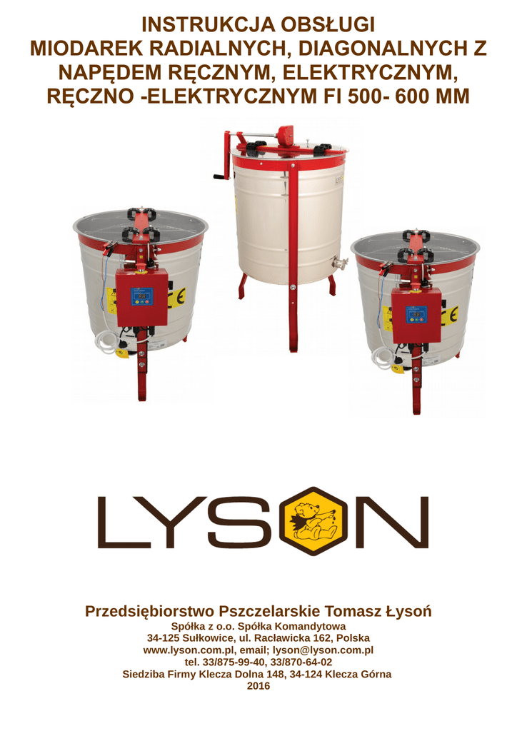 INSTRUKCJA OBSŁUGI MIODAREK RADIALNYCH, DIAGONALNYCH Z NAPĘDEM RĘCZNYM, ELEKTRYCZNYM, RĘCZNO -ELEKTRYCZNYM FI 500- 600 MM Przedsiębiorstwo Pszczelarskie Tomasz Łysoń Spółka z o.o. Spółka Komandytowa 34-125 Sułkowice, ul. Racławicka 162, Polska www.lyson.com.pl, email; [email protected] tel. 33/875-99-40, 33/870-64-02 Siedziba Firmy Klecza Dolna 148, 34-124 Klecza Górna 2016 Instrukcja obejmuje miodarki o kodach: MIODARKI DIAGONALNE I RADIALNE Z NAPĘDEM RĘCZNYM, ELEKTRYCZNYM, RĘCZNOELEKTRYCZNYM W2002, W2003, W2013A, W2004, W2012, W20120, W2013C, W2013B, W20130, W20140, W2013, W2014, W216 INSTRUKCJA OBSŁUGI 1. Ogólne zasady bezpieczeństwa użytkowania miodarki 1.1. Zasady użytkowania 1.2. Bezpieczeństwo elektryczne 1.3. Bezpieczeństwo użytkowania 2. Instrukcja użytkowania miodarki 2.1. Ogólne zasady przygotowania miodarki do pracy 2.2. Zasady użytkowania 3. Charakterystyka miodarek diagonalnych 3.1. Miodarka diagonalna z napędem ręczym 3.1.1. Parametry techniczne miodarek z napędem ręcznym 3.1.2. Schemat miodarek diagonalnych 3.1.3. Schemat miodarek ręcznych 3.2. Miodarka z napędem elektryczym 3.2.1. Parametry techniczne miodarek z napędem elektrycznym 3.2.2. Schemat miodarek elektrycznych 3.3. Miodarka diagonalna z napędem ręczno-elektrycznym 3.3.1. Parametry techniczne miodarek z napędem ręczno-elektrycznym 3.3.2. Schemat miodarki ręcznoelektrycznej 4. Instrukcja obsługi sterownika w miodarkach diagonalnych 4.1.Charakterystyka sterownika 4.2. Obsługa sterownika 5. Przechowywanie miodarek 6. Konserwacja i czyszczenie miodarki 6.1. Demontaż kosza w miodarkach diagonalnych ręcznych 6.2. Demontaż kosza w miodarkach elektrycznych i ręczno-elektrycznych 7. Utylizacja 8. Gwarancja 1. OGÓLNE ZASADY BEZPIECZEŃSTWA UŻYTKOWANIA MIODARKI Przed rozpoczęciem pracy z urządzeniem należy dokładnie przeczytać instrukcję obsługi i postępować według wskazówek w niej zawartych. Producent nie odpowiada za szkody spowodowane użytkowaniem urządzenia niezgodnie z jego przeznaczeniem lub niewłaściwą jego obsługą. 1.1. Zasady użytkowania zamknięta! Zabrania się otwierania pokrywy miodarki podczas wirowania. 8. Nie należy przestawiać miodarki podczas wirowania. 9. W przypadku miodarki ze sterowaniem elektrycznym oraz ręczno-elektrycznym należy chronić silnik oraz sterowanie przed wilgocią; (również podczas przechowywania). 10. Zabrania się ciągnąć za przewód zasilający. Przewód zasilający należy trzymać z dala od źródeł ciepła, ostrych krawędzi oraz dbać o jego dobry stan. 1. Miodarka przeznaczona jest do odwirowywania miodu z ramek. 2. Miodarkę przed wirowaniem należy dokładnie umyć gorącą wodą z niewielką ilością preparatów dopuszczonych do mycia urządzeń przeznaczonych do kontaktu z żywnością, lub za pomocą myjki ciśnieniowej. Pamiętając o zabezpieczeniu elementów elektronicznych 1.3. Bezpieczeństwo użytkowania i łożysk przed zamoczeniem!!! 1. Niniejszy sprzęt nie jest przeznaczony do użytkowania przez osoby (w tym dzieci) o ograniczonej zdolności fizycznej, czuciowej lub psychicznej lub osoby nie mające doświadczenia lub znajomości sprzętu, chyba, że odbywa się to pod nadzorem lub zgodnie z instrukcją użytkowania sprzętu, przekazanej przez osoby odpowiadające za ich bezpieczeństwo. Należy zwracać uwagę na dzieci, aby nie bawiły się miodarką. 1.2. Bezpieczeństwo elektryczne 1. Instalacja elektryczna zasilająca musi być wyposażona w wyłącznik różnicowo-prądowy o znamionowym prądzie zadziałania In nie wyższym niż 30mA. Okresowo należy sprawdzać działanie wyłącznika nadprądowego. 2. Jeżeli przewód zasilający nieodłączany lub przewód łączeniowy ulegnie uszkodzeniu i trzeba go wymienić, to czynność ta powinna być wykonana u gwaranta lub przez specjalistyczny zakład naprawczy albo przez wykwalifikowaną osobę w celu uniknięcia zagrożenia. Nie używać miodarki, gdy przewód zasilający lub łączeniowy jest uszkodzony! 2. W przypadku uszkodzenia miodarki, w celu uniknięcia zagrożenia, naprawę może przeprowadzić tylko specjalistyczny zakład naprawczy albo wykwalifikowana osoba. 3. Nie należy prowadzić jakichkolwiek prac konserwacyjnych, lub usuwania usterek podczas pracy urządzenia lub wtedy gdy miodarka jest podpięta do sieci! 4. Wszystkie osłony podczas pracy muszą być trwale przymocowane do miodarki. 5. W przypadku jakiegokolwiek zagrożenia należy 3. Przed włączeniem urządzenia do sieci należy upewnić bezzwłocznie użyć wyłącznika bezpieczeństwa. się, że sterowanie jest wyłączone. Wyłącznik na panelu Ponowne uruchomienie miodarki może nastąpić po wyeliminowaniu zagrożenia. sterowania powinien znajdować się w pozycji 0. 4. Należy upewnić się, czy napięcie nominalne miodarki i 6. Urządzenia te nie są przeznaczone do pracy na zewnątrz pomieszczeń, mogą być eksploatowane tylko źródła zasilania są zgodne. wewnątrz pomieszczeń. 5. Podczas podłączania do sieci należy zachować 7. Urządzenia nie wolno włączać i przechowywać przy ostrożność. temperaturze poniżej 0º C. Ręce muszą być suche! Miodarki nie należy włączać, gdy temperatura otoczenia Podłoże, na którym stoi wirówka powinno być suche! jest niższa niż 5º C. Przed uruchomieniem miodarki, w 6. W momencie uruchamiania miodarki przycisk „STOP przypadku gdy została ona przeniesiona z pomieszczenia o niższej temperaturze do pomieszczenia awaryjny” powinien pozostać wyłączony (należy o wyższej temperaturze, należy odczekać aż osiągnie przekręcić tak, aby wyskoczył). ona temperaturę otoczenia. Wciśnięcie przycisku „STOP awaryjny” umożliwia natychmiastowe zatrzymanie pracy wirówki. 7. Pokrywa miodarki podczas wirowania musi być – następnie włączyć wtyczkę do gniazdka, a na skrzynce sterowniczej przełączyć przycisk włączający sterowanie, z pozycji „0” na „1”. Następnie przystąp