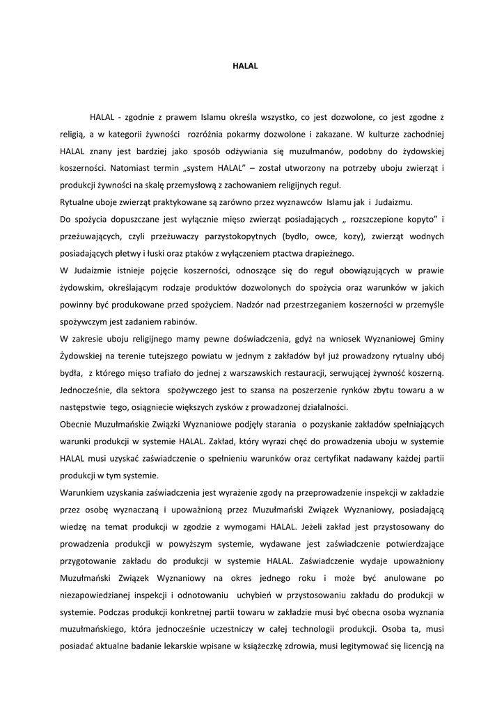 HALAL HALAL - zgodnie z prawem Islamu określa wszystko, co jest dozwolone, co jest zgodne z religią, a w kategorii żywności rozróżnia pokarmy dozwolone i zakazane. W kulturze zachodniej HALAL znany jest bardziej jako sposób odżywiania się muzułmanów, podobny do żydowskiej koszerności. Natomiast termin „system HALAL” – został utworzony na potrzeby uboju zwierząt i produkcji żywności na skalę przemysłową z zachowaniem religijnych reguł. Rytualne uboje zwierząt praktykowane są zarówno przez wyznawców Islamu jak i Judaizmu. Do spożycia dopuszczane jest wyłącznie mięso zwierząt posiadających „ rozszczepione kopyto” i przeżuwających, czyli przeżuwaczy parzystokopytnych (bydło, owce, kozy), zwierząt wodnych posiadających płetwy i łuski oraz ptaków z wyłączeniem ptactwa drapieżnego. W Judaizmie istnieje pojęcie koszerności, odnoszące się do reguł obowiązujących w prawie żydowskim, określającym rodzaje produktów dozwolonych do spożycia oraz warunków w jakich powinny być produkowane przed spożyciem. Nadzór nad przestrzeganiem koszerności w przemyśle spożywczym jest zadaniem rabinów. W zakresie uboju religijnego mamy pewne doświadczenia, gdyż na wniosek Wyznaniowej Gminy Żydowskiej na terenie tutejszego powiatu w jednym z zakładów był już prowadzony rytualny ubój bydła, z którego mięso trafiało do jednej z warszawskich restauracji, serwującej żywność koszerną. Jednocześnie, dla sektora spożywczego jest to szansa na poszerzenie rynków zbytu towaru a w następstwie tego, osiągniecie większych zysków z prowadzonej działalności. Obecnie Muzułmańskie Związki Wyznaniowe podjęły starania o pozyskanie zakładów spełniających warunki produkcji w systemie HALAL. Zakład, który wyrazi chęć do prowadzenia uboju w systemie HALAL musi uzyskać zaświadczenie o spełnieniu warunków oraz certyfikat nadawany każdej partii produkcji w tym systemie. Warunkiem uzyskania zaświadczenia jest wyrażenie zgody na przeprowadzenie inspekcji w zakładzie przez osobę wyznaczaną i upoważnioną przez Muzułmański Związek Wyznaniowy, posiadającą wiedzę na temat produkcji w zgodzie z wymogami HALAL. Jeżeli zakład jest przystosowany do prowadzenia produkcji w powyższym systemie, wydawane jest zaświadczenie potwierdzające przygotowanie zakładu do produkcji w systemie HALAL. Zaświadczenie wydaje upoważniony Muzułmański Związek Wyznaniowy na okres jednego roku i może być anulowane po niezapowiedzianej inspekcji i odnotowaniu uchybień w przystosowaniu zakładu do produkcji w systemie. Podczas produkcji konkretnej partii towaru w zakładzie musi być obecna osoba wyznania muzułmańskiego, która jednocześnie uczestniczy w całej technologii produkcji. Osoba ta, musi posiadać aktualne badanie lekarskie wpisane w książeczkę zdrowia, musi legitymować się licencją na przeprowadzenie uboju, którą wydaje Muzułmański Związek Wyznaniowy, zaś wyprodukowany towar otrzymuje wcześniej wspomniany stosowny certyfikat wydawany na każdą partię towaru. Powiatowy Lekarz Weterynarii będący organem w zakresie urzędowego badania zwierząt rzeźnych i mięsa, jako właściwa władza dla miejsca działalności podmiotu w drodze odstępstw od przepisów o warunkach uboju i dobrostanie zwierząt, może wydać pozwolenie na dokonanie uboju rytualnego. Zakład zobowiązany jest do udostępnienia do inspekcji wszystkich pomieszczeń oraz do okazania wszelkich dokumentów związanych z ubojem i produkcją zgodnie z zasadami i wymogami HALAL. Przed przystąpieniem do uboju , linie produkcyjne muszą być oczyszczone i zdezynfekowane przy użyciu środków odkażających z wyłączeniem alkoholu, gdyż prawem religijnym spożywanie alkoholu nawet w śladowych ilościach jest zabronione. W trakcie pozbywania zwierzęcia życia, bardzo rygorystycznie przestrzegane są zasady uboju religijnego. Podlegające ubojowi zwierzęta, powinny być zwrócone głową w stronę południowo – wschodnią, czyli w kierunku miasta Mekka - kierunek modlitwy muzułmańskiej. Przed ubojem, zwierze musi być żywe, zdrowe i wolne od wszelkich wad, zaś w trakcie uboju muzułmanin wymawia na głos w języku arabskim słowa modlitwy: bismillahi Allahu akbar. Ubój przeprowadza się ręcznie i polega na jednoczesnym przecięciu żył i tętnic szyjnych po obu stronach oraz tchawicy. Cięcie wykonuje się długim ostrzem przypominającym szablę (wielokrotnie dłuższym od szerokości szyi) musi być jedno, zdecydowane i szybkie nie naruszające kręgosłupa. Przecięcie pnia nerwowego odcinka szyjnego kręgosłupa zwierzęcia, dyskwalifikuje mięso z kategorii HALAL. Krew zabitego zwierzęcia musi maksymalnie spłynąć, gdyż religia kategorycznie zabranie spożywania jej, ponadto jest dobrą pożywką dla bakterii mających wpływ na psucie się żywności i szerzenie się chorób. Powyżej opisana metoda uboju rytualnego była często opisywane przez organizacje broniące praw zwierząt, jako niehumanitarne, zadające zwierzęciu niepotrzebne cierpienie, ponieważ w tej metodzie zwierzęta podczas wykrwawiania nie są pozbawiane świadomości. Z kolei zwolennicy uboju rytualnego powołują się na badania wskazujące, że szybki odpływ krwi a co za tym idzie spadek ciśnienia krwi, powoduje nagłe obumarcie mózgu i nie ma czasu na wystąpienie czucia bólu. Jednocześnie pojawiły się głosy, by mięso i przetwory mięsne pochodzące z ubojów rytualnych podlegało oznakowaniu tak, by konsument miał świadomość, jaka metoda uboju w konkretnym przypadku została zastosowana. To dałoby kupującemu możliwość zakupu mięsa, które pochodzi z uboju przeprowadzonego w możliwie najbardziej humanitarny sposób. Romuald Juściński Powiatowy Lekarz Weterynarii