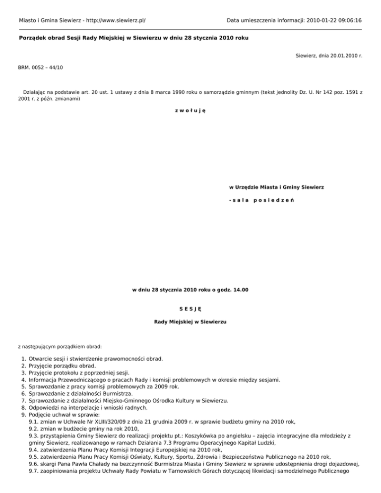 Miasto i Gmina Siewierz - http://www.siewierz.pl/ Data umieszczenia informacji: 2010-01-22 09:06:16 Porządek obrad Sesji Rady Miejskiej w Siewierzu w dniu 28 stycznia 2010 roku Siewierz, dnia 20.01.2010 r. BRM. 0052 – 44/10 Działając na podstawie art. 20 ust. 1 ustawy z dnia 8 marca 1990 roku o samorządzie gminnym (tekst jednolity Dz. U. Nr 142 poz. 1591 z 2001 r. z późn. zmianami) zwołuję w Urzędzie Miasta i Gminy Siewierz -sala posiedzeń w dniu 28 stycznia 2010 roku o godz. 14.00 SESJĘ Rady Miejskiej w Siewierzu z następującym porządkiem obrad: 1. 2. 3. 4. 5. 6. 7. 8. 9. Otwarcie sesji i stwierdzenie prawomocności obrad. Przyjęcie porządku obrad. Przyjęcie protokołu z poprzedniej sesji. Informacja Przewodniczącego o pracach Rady i komisji problemowych w okresie między sesjami. Sprawozdanie z pracy komisji problemowych za 2009 rok. Sprawozdanie z działalności Burmistrza. Sprawozdanie z działalności Miejsko-Gminnego Ośrodka Kultury w Siewierzu. Odpowiedzi na interpelacje i wnioski radnych. Podjęcie uchwał w sprawie: 9.1. zmian w Uchwale Nr XLIII/320/09 z dnia 21 grudnia 2009 r. w sprawie budżetu gminy na 2010 rok, 9.2. zmian w budżecie gminy na rok 2010, 9.3. przystąpienia Gminy Siewierz do realizacji projektu pt.: Koszykówka po angielsku – zajęcia integracyjne dla młodzieży z gminy Siewierz, realizowanego w ramach Działania 7.3 Programu Operacyjnego Kapitał Ludzki, 9.4. zatwierdzenia Planu Pracy Komisji Integracji Europejskiej na 2010 rok, 9.5. zatwierdzenia Planu Pracy Komisji Oświaty, Kultury, Sportu, Zdrowia i Bezpieczeństwa Publicznego na 2010 rok, 9.6. skargi Pana Pawła Chałady na bezczynność Burmistrza Miasta i Gminy Siewierz w sprawie udostępnienia drogi dojazdowej, 9.7. zaopiniowania projektu Uchwały Rady Powiatu w Tarnowskich Górach dotyczącej likwidacji samodzielnego Publicznego 10. 11. 12. 13. Zakładu Opieki Zdrowotnej Wielospecjalistycznego Szpitala Powiatowego im. dr B. Hagera w Tarnowskich Górach przy ul. Pyskowickiej 47-51. Problematyka sołectw. Interpelacje i zapytania radnych. Wolne wnioski. Zamknięcie obrad sesji. Przewodnicząca Rady Miejskiej w Siewierzu (-) Barbara Bochenek Urząd Miasta i Gminy Siewierz, 42-470 Siewierz, ul. Żwirki i WIgury 16, tel. 32 64 99 400, e-mail: [email protected] Burmistrz Miasta i Gminy Siewierz mgr Zdzisław Banaś
