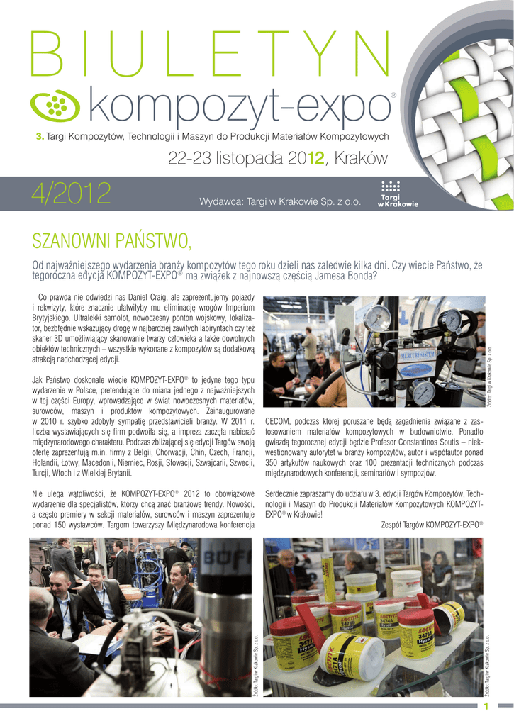 BIULETYN kompozyt-expo ® 3. Targi Kompozytów, Technologii i Maszyn do Produkcji Materiałów Kompozytowych 22-23 listopada 2012, Kraków 4/2012 Wydawca: Targi w Krakowie Sp. z o.o. SZANOWNI PAŃSTWO, CECOM, podczas której poruszane będą zagadnienia związane z zastosowaniem materiałów kompozytowych w budownictwie. Ponadto gwiazdą tegorocznej edycji będzie Profesor Constantinos Soutis – niekwestionowany autorytet w branży kompozytów, autor i współautor ponad 350 artykułów naukowych oraz 100 prezentacji technicznych podczas międzynarodowych konferencji, seminariów i sympozjów. Serdecznie zapraszamy do udziału w 3. edycji Targów Kompozytów, Technologii i Maszyn do Produkcji Materiałów Kompozytowych KOMPOZYTEXPO® w Krakowie! Zespół Targów KOMPOZYT-EXPO® Źródło: Targi w Krakowie Sp. z o.o. Źródło: Targi w Krakowie Sp. z o.o. Co prawda nie odwiedzi nas Daniel Craig, ale zaprezentujemy pojazdy i rekwizyty, które znacznie ułatwiłyby mu eliminację wrogów Imperium Brytyjskiego. Ultralekki samolot, nowoczesny ponton wojskowy, lokalizator, bezbłędnie wskazujący drogę w najbardziej zawiłych labiryntach czy też skaner 3D umożliwiający skanowanie twarzy człowieka a także dowolnych obiektów technicznych – wszystkie wykonane z kompozytów są dodatkową atrakcją nadchodzącej edycji. Jak Państwo doskonale wiecie KOMPOZYT-EXPO® to jedyne tego typu wydarzenie w Polsce, pretendujące do miana jednego z najważniejszych w tej części Europy, wprowadzające w świat nowoczesnych materiałów, surowców, maszyn i produktów kompozytowych. Zainaugurowane w 2010 r. szybko zdobyły sympatię przedstawicieli branży. W 2011 r. liczba wystawiających się firm podwoiła się, a impreza zaczęła nabierać międzynarodowego charakteru. Podczas zbliżającej się edycji Targów swoją ofertę zaprezentują m.in. firmy z Belgii, Chorwacji, Chin, Czech, Francji, Holandii, Łotwy, Macedonii, Niemiec, Rosji, Słowacji, Szwajcarii, Szwecji, Turcji, Włoch i z Wielkiej Brytanii. Nie ulega wątpliwości, że KOMPOZYT-EXPO® 2012 to obowiązkowe wydarzenie dla specjalistów, którzy chcą znać branżowe trendy. Nowości, a często premiery w sekcji materiałów, surowców i maszyn zaprezentuje ponad 150 wystawców. Targom towarzyszy Międzynarodowa konferencja Źródło: Targi w Krakowie Sp. z o.o. Od najważniejszego wydarzenia branży kompozytów tego roku dzieli nas zaledwie kilka dni. Czy wiecie Państwo, że tegoroczna edycja KOMPOZYT-EXPO® ma związek z najnowszą częścią Jamesa Bonda? 1 C-L Sp. z o.o. Strefa prezentacji technicznych Firma C-L Sp. z o.o. jest dystrybutorem surowców i urządzeń do produkcji kompozytów. Rozpoczęła swoją działalność w 1998 roku. Nazwa firmy wywodzi się od pierwszych liter jej założycieli – firm Connector i Laminopol. Oferta obejmuje: • żywice poliestrowe, epoksydowe i winyloestrowe • żelkoty poliestrowe • zbrojenia szklane • systemy utwardzające • środki rozdzielcze • wypełniacze • waszyny i urządzenia • pozostałe materiały kompozytowe W ciągu wielu lat firma zdobyła zaufanie wielu klientów w kraju i zagranicą. Współpracuje ze znaczącymi dostawcami w branży kompozytów. C-L posiada dobrze rozbudowaną sieć oddziałów na terenie całego kraju oraz na Ukrainie i Rumunii. Zapewnia profesjonalne wsparcie klientów. Oferujemy również wspólnie z partnerami handlowymi materiały i urządzenia stosowane w nowych technologiach takich jak L- RTM, infuzja. Informacje o produktach firmy C-L są dostępne na stroni internetowej www.c-l.pl 22.11.2012, czwartek 11.30 - 12.15 Graco’s Prepreg technology for the composite market, RACO BVBA Źródło: C-L Sp. z o.o. 12.30 - 13.15 Ceramika techniczna dla zaawansowanych zastosowań - produkcja/właściwości/zastosowanie, LABRO Technologie 23.11.2012, piątek 10.15 - 11.00 FLEX MOLDING PROCESS wtrysk żywicy pod folię/membranę, Magnum Venus Polska 11.15 - 12.00 Proces tworzenia dokumentacji CAD formy do kompozytów na podstawie skanowania 3D skanerem firmy SMARTTECH, SMARTTECH skaner3d.pl Sp. z o.o. PERMABOND 12.15 - 13.00 Innowacje i optymalizacja proces cięcia materiałów kompozytowych, Allcomp Polska Sp. z o.o. Źródło: Permabond Kleje cyjanoakrylowe i anaerobowe. Angielska firma Permabond jest czołowym na świecie producentem klejów cyjanoakrylowych oraz anaerobowych. Kleje firmy Permabond są stosowane w różnych gałęziach przemysłu, a także w życiu codziennym. Wyłącznym dystrybutorem na polskim rynku jest firma Milar Sp. z o.o. 13.30 - 14.15 Zaawansowane żywice i żelkoty do zastosowań przemysłowych, CHEM4OL Grabski i Wspólnicy Sp.J. 13.15 - 14.00 Wybrane prace badawczo-rozwojowe z kompozytami w Instytucie Materiałoznastwa i Mechaniki Technicznej Politechniki Wrocławskiej, Politechnika Wrocławska POLITECHNIKA WROCŁAWSKA - KOMPOZYTOWY MOST PONTONOWY Źródło: Politechnika Wrocławska W ramach projektu rozwojowego nr 03003906, zespoły Wojskowego Instytutu Techniki Inżynieryjnej i Politechniki Wrocławskiej zaprojektowały i wykonały pierwszy w świecie, całkowicie kompozytowy ponton przeznaczony do budowy mostów pływających. Kompletny prototypowy zespół pontonowy składa się z trzech członów zespolonych w układzie „V” – szerokiego członu centralnego i dwóch dwukrotnie węższych członów bocznych. Człony boczne do transportu składają się zawiasowo na wierzch członu centralnego. Każdy z trzech członów wykonano według różnej technologii. Jeden z nich całkowicie kompozytowy wykonano wykorzystując włókna szklane, węglowe, aramidowe oraz szereg różnego typu pianek. Ponton jest lekki, niezatapialny, o podwyższonej odporności na uszkodzenia mechaniczne, w tym odłamki i przestrzelenie a także na ogień. W ostatnim etapie prac ponton włączono w przeprawę i testowano poprzez najeżdżanie kolejno cięższymi pojazdami wojskowymi. Udowodniono słuszność koncepcji wykorzystania ma