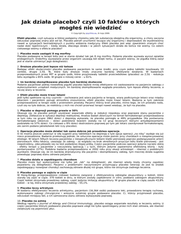 Jak działa placebo? czyli 10 faktów o których mogłeś nie wiedzieć © Copyright by psychika.eu, 8 maja 2009. Efekt placebo, czyli sytuacja w której podajemy choremu jako lek substancję obojętną dla organizmu, a chory zaczyna odczuwać poprawę znany jest od lat. Placebo potrafi uruchomić leczące siły organizmu i doprowadzić do wyzdrowienia nawet w sytuacjach beznadziejnych z punktu widzenia medycyny. Efekt placebo jest więc zjawiskiem znanym choć nadal dość tajemniczym – kiedy działa, dlaczego działa i w jakich sytuacjach działa do końca nie wiemy. Co zatem ciekawego wiemy o efekcie placebo? 1. Placebo może zastąpić 8 mg morfiny Placebo podawane w terapii bólu jest w stanie działać tak jak 8 mg morfiny. Podanie placebo wyzwala wyrzut opiatów endogennych. Endorfiny wyzwalane przez organizm usuwają ból dzięki temu, iż pacjent wierzy, że pigułka którą zażył jest w stanie uśmierzyć jego dolegliwości. 2. Droższe placebo jest lepsze niż tańsze Badając efekt skuteczności placebo podawano pacjentom te same środki, przy czym jedne tabletki kosztowały 10 centów, drugie 2,5$. Te, które były droższe miały znacznie bardziej efektywne działanie. W badaniach przeprowadzonych przez MIT w grupie osób, które przyjmowały tabletki przeciwbólowe (placebo) za 2,5$ - redukcja bólu wystąpiła u 85% osób. W grupie o niższej cenie – u 61%. 3. Im bardziej skomplikowane placebo tym bardziej skuteczne Podanie pacjentowi jednej niewielkiej pigułki placebo będzie mniej efektywne niż zastosowanie na pacjencie zabiegu z wykorzystaniem urządzeń medycznych. Im bardziej skomplikowanie wygląda procedura, tym lepsze efekty leczenia, a raczej wiary w leczenie. 4. Efekt placebo może trwać latami Jeśli tylko spełnione są trzy czynniki – zachowana jest wiara pacjenta w terapię, wiarę podtrzymuje lekarz oraz między lekarzem i pacjentem panuje atmosfera zrozumienia, efekt placebo może trwać latami. Badania w tym zakresie przeprowadzono w terapii osób z przerostem prostaty. Pacjenci którzy brali placebo, mimo tego, że ich prostata rosła, czuli się na tyle dobrze, że niektórzy z nich nie chcieli przerwać terapii nawet wiedząc, że byli na placebo. 5. Placebo w depresji pomaga prawie w 50% Okazuje się, że placebo potrafi uzyskiwać wspaniałe efekty w redukcji niepokoju oraz poprawie stanu pacjentów z depresją. Zwłaszcza w sytuacji depresji reaktywnej. Analiza badań zbiorczych na temat farmakoterapii przeprowadzona w tym roku na grupie 2862 dzieci z depresją wykazała, że placebo pomogło w 49% przypadków. Dla porównania farmakoterapia (zbiorczo – dzieci podzielone bowiem zostały na 12 grup leczonych różnymi antydepresantami) podziałała na 57% dzieci. Co ciekawe u 8% dzieci dostrzeżono poprawę po tym jak lekarz zaordynował farmakoterapię, ale zanim podano jakiekolwiek leki (czy placebo). 6. Operacja placebo może działać tak samo dobrze jak prawdziwa operacja O ile można jeszcze uwierzyć w siłę sugestii przy tabletkach na depresję o tyle opcja operacji „na niby” wydaje się już nieco przesadzona. Badania przekonują jednak, że sztuczna operacja może pomóc przy chorobach o niesprecyzowanej etiologii. W latach 50tych leczono pacjentów z niespecyficznymi bólami klatki piersiowej poprzez podwiązywanie arterii piersiowych. Kilku lekarzy, uważając że zabieg – ze względu na brak określonych przyczyn bólu klatki piersiowej - jest niepotrzebny, zdecydowało się na test podwójnej ślepej próby. Części pacjentów podczas operacji jedynie nacięto skórę - efekty terapii u pacjentów z rzeczywistą operacją i u tych, którym jedynie zapewniono efektowną bliznę - były porównywalne (37%). Podobne badania przeprowadzono w 2002 roku przy okazji artroskopii – również z podobnymi wynikami. Okazuje się, że im bardziej dramatyczny dla pacjenta i skomplikowany zabieg, tym mocniej działa sugestia powodując poprawę stanu zdrowia pacjenta. 7. Placebo działa w zapobieganiu chorobom Placebo może być wykorzystane nie tylko jak „lek” na dolegliwość, ale również wtedy kiedy chcemy zapobiec pojawieniu się dolegliwości. Pacjenci z problemami naczyniowymi przyjmujący placebo (wierząc że jest to środek zapobiegający rozwojowi choroby) zachowują zdrowie dłużej niż grupa, która nie otrzymuje żadnego leczenia. 8. Placebo pomaga w zajściu w ciąże W Hong-Kongu przeprowadzono ciekawe badania związane z efektywnością zabiegów akupunktury u kobiet, które starały się zajść w ciąże. 370 kobiet w dniu, w którym zostały zapłodnione in vitro, poddano zabiegom akupunktury. Część kobiet otrzymała prawdziwy zabieg, część jedynie imitację akupunktury. W grupie placebo w ciążę zaszło 43,8% kobiet – w tej, która otrzymała prawdziwy zabieg – 55,1%. 9. Placebo leczy artretyzm W badaniu efektywności leczenia artretyzmu, pacjentom (16,364 osób) podawano leki, prowadzono terapię ruchową, wykonywano zabiegi chirurgiczne i wreszcie ostatniej grupie podawano placebo. Ci, którzy przyjmowali placebo, odczuwali mniejszy ból, a ich samoocena stanu zdrowia wykazywała poprawę. 10. Placebo na astmę Według raportu z Journal of Allergy and Clinical Immunology, placebo osiąga wspaniałe rezultaty w leczeniu astmy. U części pacjentów którym podawano placebo poprawie uległ nie tylko spostrzegany przez nich stan zdrowia, ale również zwiększyła się pojemność płuc. *** Inne fakty • Jak pokazały badania Teda Kaptchuk z Harvard Medical School w Bostonie, placebo działa także wtedy, gdy pacjent wie, że zażywa tylko placebo1. Można to wytłumaczyć faktem, że jedynie świadomość pacjenta wie o nieskuteczności zażywanej pastylki, natomiast podświadomość identyfikuje pastylkę jako lekarstwo ze względu na jej zewnętrzne podobieństwo do lekarstw i wcześniej wpojone / nabyte schematy związane z zażywaniem lekarstw. 1 Zob. „Jawne oszustwo”, [w:] „Psy