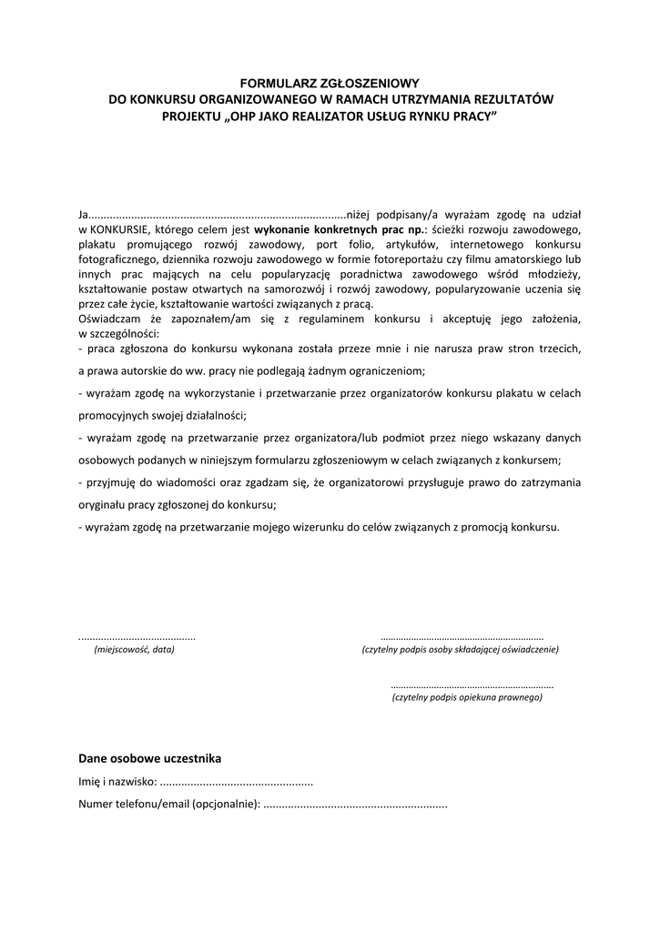 FORMULARZ ZGŁOSZENIOWY DO KONKURSU ORGANIZOWANEGO W RAMACH UTRZYMANIA REZULTATÓW PROJEKTU „OHP JAKO REALIZATOR USŁUG RYNKU PRACY” Ja....................................................................................niżej podpisany/a wyrażam zgodę na udział w KONKURSIE, którego celem jest wykonanie konkretnych prac np.: ścieżki rozwoju zawodowego, plakatu promującego rozwój zawodowy, port folio, artykułów, internetowego konkursu fotograficznego, dziennika rozwoju zawodowego w formie fotoreportażu czy filmu amatorskiego lub innych prac mających na celu popularyzację poradnictwa zawodowego wśród młodzieży, kształtowanie postaw otwartych na samorozwój i rozwój zawodowy, popularyzowanie uczenia się przez całe życie, kształtowanie wartości związanych z pracą. Oświadczam że zapoznałem/am się z regulaminem konkursu i akceptuję jego założenia, w szczególności: - praca zgłoszona do konkursu wykonana została przeze mnie i nie narusza praw stron trzecich, a prawa autorskie do ww. pracy nie podlegają żadnym ograniczeniom; - wyrażam zgodę na wykorzystanie i przetwarzanie przez organizatorów konkursu plakatu w celach promocyjnych swojej działalności; - wyrażam zgodę na przetwarzanie przez organizatora/lub podmiot przez niego wskazany danych osobowych podanych w niniejszym formularzu zgłoszeniowym w celach związanych z konkursem; - przyjmuję do wiadomości oraz zgadzam się, że organizatorowi przysługuje prawo do zatrzymania oryginału pracy zgłoszonej do konkursu; - wyrażam zgodę na przetwarzanie mojego wizerunku do celów związanych z promocją konkursu. .......................................... ………………………………………………………. (miejscowość, data) (czytelny podpis osoby składającej oświadczenie) ………………………………………………………. (czytelny podpis opiekuna prawnego) Dane osobowe uczestnika Imię i nazwisko: .................................................. Numer telefonu/email (opcjonalnie): ............................................................