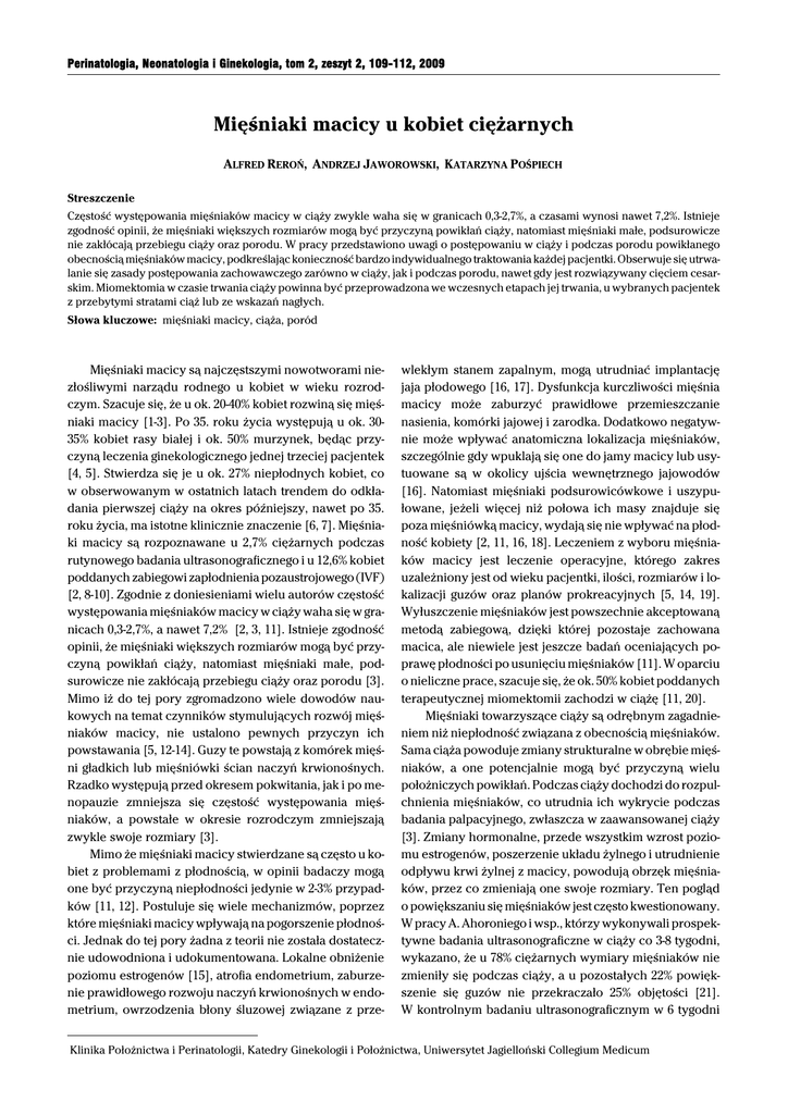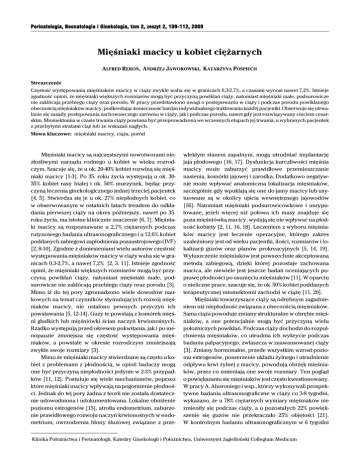 Perinatologia, Neonatologia i Ginekologia, tom 2, zeszyt 2, 109-112, 2009 Mięśniaki macicy u kobiet ciężarnych ALFRED REROŃ, ANDRZEJ JAWOROWSKI, KATARZYNA POŚPIECH Streszczenie Częstość występowania mięśniaków macicy w ciąży zwykle waha się w granicach 0,3-2,7%, a czasami wynosi nawet 7,2%. Istnieje zgodność opinii, że mięśniaki większych rozmiarów mogą być przyczyną powikłań ciąży, natomiast mięśniaki małe, podsurowicze nie zakłócają przebiegu ciąży oraz porodu. W pracy przedstawiono uwagi o postępowaniu w ciąży i podczas porodu powikłanego obecnością mięśniaków macicy, podkreślając konieczność bardzo indywidualnego traktowania każdej pacjentki. Obserwuje się utrwalanie się zasady postępowania zachowawczego zarówno w ciąży, jak i podczas porodu, nawet gdy jest rozwiązywany cięciem cesarskim. Miomektomia w czasie trwania ciąży powinna być przeprowadzona we wczesnych etapach jej trwania, u wybranych pacjentek z przebytymi stratami ciąż lub ze wskazań nagłych. Słowa kluczowe: mięśniaki macicy, ciąża, poród Mięśniaki macicy są najczęstszymi nowotworami niezłośliwymi narządu rodnego u kobiet w wieku rozrodczym. Szacuje się, że u ok. 20-40% kobiet rozwiną się mięśniaki macicy [1-3]. Po 35. roku życia występują u ok. 3035% kobiet rasy białej i ok. 50% murzynek, będąc przyczyną leczenia ginekologicznego jednej trzeciej pacjentek [4, 5]. Stwierdza się je u ok. 27% niepłodnych kobiet, co w obserwowanym w ostatnich latach trendem do odkładania pierwszej ciąży na okres późniejszy, nawet po 35. roku życia, ma istotne klinicznie znaczenie [6, 7]. Mięśniaki macicy są rozpoznawane u 2,7% ciężarnych podczas rutynowego badania ultrasonograficznego i u 12,6% kobiet poddanych zabiegowi zapłodnienia pozaustrojowego (IVF) [2, 8-10]. Zgodnie z doniesieniami wielu autorów częstość występowania mięśniaków macicy w ciąży waha się w granicach 0,3-2,7%, a nawet 7,2% [2, 3, 11]. Istnieje zgodność opinii, że mięśniaki większych rozmiarów mogą być przyczyną powikłań ciąży, natomiast mięśniaki małe, podsurowicze nie zakłócają przebiegu ciąży oraz porodu [3]. Mimo iż do tej pory zgromadzono wiele dowodów naukowych na temat czynników stymulujących rozwój mięśniaków macicy, nie ustalono pewnych przyczyn ich powstawania [5, 12-14]. Guzy te powstają z komórek mięśni gładkich lub mięśniówki ścian naczyń krwionośnych. Rzadko występują przed okresem pokwitania, jak i po menopauzie zmniejsza się częstość występowania mięśniaków, a powstałe w okresie rozrodczym zmniejszają zwykle swoje rozmiary [3]. Mimo że mięśniaki macicy stwierdzane są często u kobiet z problemami z płodnością, w opinii badaczy mogą one być przyczyną niepłodności jedynie w 2-3% przypadków [11, 12]. Postuluje się wiele mechanizmów, poprzez które mięśniaki macicy wpływają na pogorszenie płodności. Jednak do tej pory żadna z teorii nie została dostatecznie udowodniona i udokumentowana. Lokalne obniżenie poziomu estrogenów [15], atrofia endometrium, zaburzenie prawidłowego rozwoju naczyń krwionośnych w endometrium, owrzodzenia błony śluzowej związane z prze- wlekłym stanem zapalnym, mogą utrudniać implantację jaja płodowego [16, 17]. Dysfunkcja kurczliwości mięśnia macicy może zaburzyć prawidłowe przemieszczanie nasienia, komórki jajowej i zarodka. Dodatkowo negatywnie może wpływać anatomiczna lokalizacja mięśniaków, szczególnie gdy wpuklają się one do jamy macicy lub usytuowane są w okolicy ujścia wewnętrznego jajowodów [16]. Natomiast mięśniaki podsurowicówkowe i uszypułowane, jeżeli więcej niż połowa ich masy znajduje się poza mięśniówką macicy, wydają się nie wpływać na płodność kobiety [2, 11, 16, 18]. Leczeniem z wyboru mięśniaków macicy jest leczenie operacyjne, którego zakres uzależniony jest od wieku pacjentki, ilości, rozmiarów i lokalizacji guzów oraz planów prokreacyjnych [5, 14, 19]. Wyłuszczenie mięśniaków jest powszechnie akceptowaną metodą zabiegową, dzięki której pozostaje zachowana macica, ale niewiele jest jeszcze badań oceniających poprawę płodności po usunięciu mięśniaków [11]. W oparciu o nieliczne prace, szacuje się, że ok. 50% kobiet poddanych terapeutycznej miomektomii zachodzi w ciążę [11, 20]. Mięśniaki towarzyszące ciąży są odrębnym zagadnieniem niż niepłodność związana z obecnością mięśniaków. Sama ciąża powoduje zmiany strukturalne w obrębie mięśniaków, a one potencjalnie mogą być przyczyną wielu położniczych powikłań. Podczas ciąży dochodzi do rozpulchnienia mięśniaków, co utrudnia ich wykrycie podczas badania palpacyjnego, zwłaszcza w zaawansowanej ciąży [3]. Zmiany hormonalne, przede wszystkim wzrost poziomu estrogenów, poszerzenie układu żylnego i utrudnienie odpływu krwi żylnej z macicy, powodują obrzęk mięśniaków, przez co zmieniają one swoje rozmiary. Ten pogląd o powiększaniu się mięśniaków jest często kwestionowany. W pracy A. Ahoroniego i wsp., którzy wykonywali prospektywne badania ultrasonograficzne w ciąży co 3-8 tygodni, wykazano, że u 78% ciężarnych wymiary mięśniaków nie zmieniły się podczas ciąży, a u pozostałych 22% powiększenie się guzów nie przekraczało 25% objętości [21]. W kontrolnym badaniu ultrasonograficznym w 6 tygodni Klinika Położnictwa i Perinatologii, Katedry Ginekologii i Położnictwa, Uniwersytet Jagielloński Collegium Medicum 110 A. Reroń, A. Jaworowski, K. Pośpiech po porodzie rozmiary mięśniaków nie różniły się statystycznie od ich rozmiarów w ciąży [21]. Wyniki innych badań z lat 80. i 90. potwierdziły, że 89-93% mięśniaków nie zmienia swoich rozmiarów w ciąży [22-24], a niekiedy obserwuje się ich zmniejszenie, zwłaszcza w III trymestrze ciąży. Według nowszego badania A. Hammoud i wsp. nawet 75% guzów w trzecim tryme