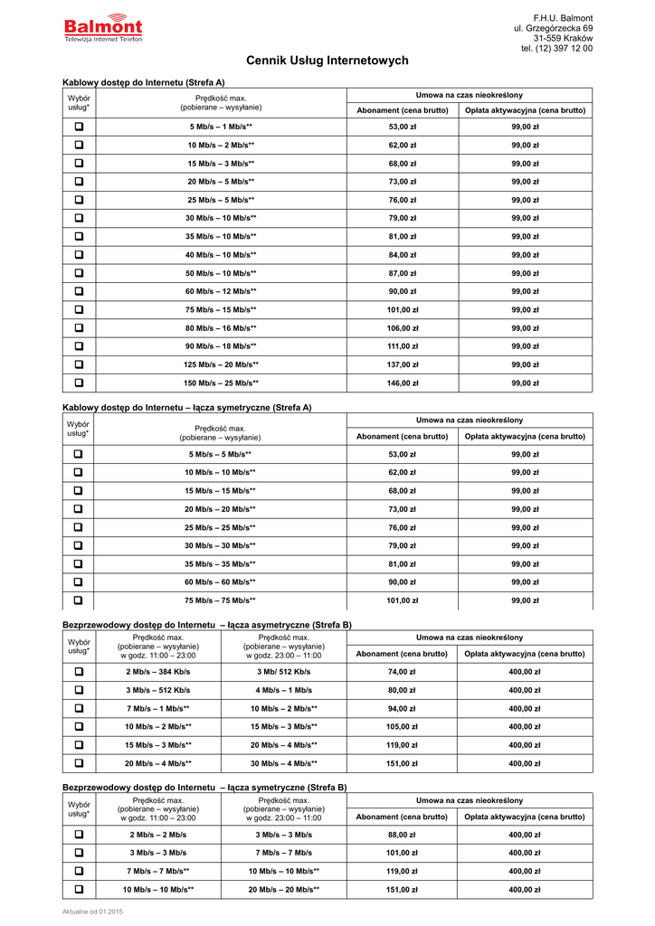 F.H.U. Balmont ul. Grzegórzecka 69 31-559 Kraków tel. (12) 397 12 00 Cennik Usług Internetowych Kablowy dostęp do Internetu (Strefa A) Umowa na czas nieokreślony Wybór usług* Prędkość max. (pobierane – wysyłanie) Abonament (cena brutto) Opłata aktywacyjna (cena brutto) 5 Mb/s – 1 Mb/s** 53,00 zł 99,00 zł 10 Mb/s – 2 Mb/s** 62,00 zł 99,00 zł 15 Mb/s – 3 Mb/s** 68,00 zł 99,00 zł 20 Mb/s – 5 Mb/s** 73,00 zł 99,00 zł 25 Mb/s – 5 Mb/s** 76,00 zł 99,00 zł 30 Mb/s – 10 Mb/s** 79,00 zł 99,00 zł 35 Mb/s – 10 Mb/s** 81,00 zł 99,00 zł 40 Mb/s – 10 Mb/s** 84,00 zł 99,00 zł 50 Mb/s – 10 Mb/s** 87,00 zł 99,00 zł 60 Mb/s – 12 Mb/s** 90,00 zł 99,00 zł 75 Mb/s – 15 Mb/s** 101,00 zł 99,00 zł 80 Mb/s – 16 Mb/s** 106,00 zł 99,00 zł 90 Mb/s – 18 Mb/s** 111,00 zł 99,00 zł 125 Mb/s – 20 Mb/s** 137,00 zł 99,00 zł 150 Mb/s – 25 Mb/s** 146,00 zł 99,00 zł Kablowy dostęp do Internetu – łącza symetryczne (Strefa A) Umowa na czas nieokreślony Wybór usług* Prędkość max. (pobierane – wysyłanie) Abonament (cena brutto) Opłata aktywacyjna (cena brutto) 5 Mb/s – 5 Mb/s** 53,00 zł 99,00 zł 10 Mb/s – 10 Mb/s** 62,00 zł 99,00 zł 15 Mb/s – 15 Mb/s** 68,00 zł 99,00 zł 20 Mb/s – 20 Mb/s** 73,00 zł 99,00 zł 25 Mb/s – 25 Mb/s** 76,00 zł 99,00 zł 30 Mb/s – 30 Mb/s** 79,00 zł 99,00 zł 35 Mb/s – 35 Mb/s** 81,00 zł 99,00 zł 60 Mb/s – 60 Mb/s** 90,00 zł 99,00 zł 75 Mb/s – 75 Mb/s** 101,00 zł 99,00 zł Bezprzewodowy dostęp do Internetu – łącza asymetryczne (Strefa B) Wybór usług* Prędkość max. (pobierane – wysyłanie) w godz. 11:00 – 23:00 Prędkość max. (pobierane – wysyłanie) w godz. 23:00 – 11:00 Umowa na czas nieokreślony Abonament (cena brutto) Opłata aktywacyjna (cena brutto) 2 Mb/s – 384 Kb/s 3 Mb/ 512 Kb/s 74,00 zł 400,00 zł 3 Mb/s – 512 Kb/s 4 Mb/s – 1 Mb/s 80,00 zł 400,00 zł 7 Mb/s – 1 Mb/s** 10 Mb/s – 2 Mb/s** 94,00 zł 400,00 zł 10 Mb/s – 2 Mb/s** 15 Mb/s – 3 Mb/s** 105,00 zł 400,00 zł 15 Mb/s – 3 Mb/s** 20 Mb/s – 4 Mb/s** 119,00 zł 400,00 zł 20 Mb/s – 4 Mb/s** 30 Mb/s – 4 Mb/s** 151,00 zł 400,00 zł Bezprzewodowy dostęp do Internetu – łącza symetryczne (Strefa B) Wybór usług* Prędkość max. (pobierane – wysyłanie) w godz. 11:00 – 23:00 Prędkość max. (pobierane – wysyłanie) w godz. 23:00 – 11:00 Abonament (cena brutto) Opłata aktywacyjna (cena brutto) 2 Mb/s – 2 Mb/s 3 Mb/s – 3 Mb/s 88,00 zł 400,00 zł 3 Mb/s – 3 Mb/s 7 Mb/s – 7 Mb/s 101,00 zł 400,00 zł 7 Mb/s – 7 Mb/s** 10 Mb/s – 10 Mb/s** 119,00 zł 400,00 zł 10 Mb/s – 10 Mb/s** 20 Mb/s – 20 Mb/s** 151,00 zł 400,00 zł Aktualne od 01.2015 Umowa na czas nieokreślony F.H.U. Balmont ul. Grzegórzecka 69 31-559 Kraków tel. (12) 397 12 00 Usługi dodatkowe Usługa Nieuzasadnione wezwanie serwisu Cena brutto 50,00 zł / r-g Karta sieciowa Fast Ethernet z montażem na PC 65,00 zł Router bezprzewodowy z konfiguracją – [do 50 Mb/s] – [od 50 Mb/s] 100,00 zł 120,00 zł Switch do podziału sieci LAN Dodatkowy przewód UTP (patchcord) 55,00 zł 1,80 zł / mb Dodatkowy adres IP 10,00 zł / m-c Stały, publiczny adres IP 10,00 zł / m-c Cesja umowy 25,00 zł Zmiana adresu MAC 0,00 zł Wystawienie duplikatu faktury 0,00 zł * właściwe zaznaczyć ** oferta ograniczona terytorialnie zależna od warunków technicznych Aktualne od 01.2015