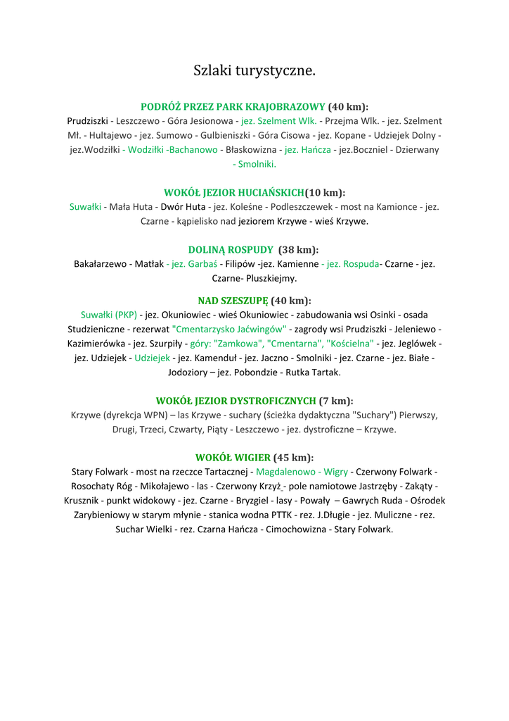Szlaki turystyczne. PODRÓŻ PRZEZ PARK KRAJOBRAZOWY (40 km): Prudziszki - Leszczewo - Góra Jesionowa - jez. Szelment Wlk. - Przejma Wlk. - jez. Szelment Mł. - Hultajewo - jez. Sumowo - Gulbieniszki - Góra Cisowa - jez. Kopane - Udziejek Dolny jez.Wodziłki - Wodziłki -Bachanowo - Błaskowizna - jez. Hańcza - jez.Boczniel - Dzierwany - Smolniki. WOKÓŁ JEZIOR HUCIAŃSKICH(10 km): Suwałki - Mała Huta - Dwór Huta - jez. Koleśne - Podleszczewek - most na Kamionce - jez. Czarne - kąpielisko nad jeziorem Krzywe - wieś Krzywe. DOLINĄ ROSPUDY (38 km): Bakałarzewo - Matłak - jez. Garbaś - Filipów -jez. Kamienne - jez. Rospuda- Czarne - jez. Czarne- Pluszkiejmy. NAD SZESZUPĘ (40 km): Suwałki (PKP) - jez. Okuniowiec - wieś Okuniowiec - zabudowania wsi Osinki - osada Studzieniczne - rezerwat "Cmentarzysko Jaćwingów" - zagrody wsi Prudziszki - Jeleniewo Kazimierówka - jez. Szurpiły - góry: "Zamkowa", "Cmentarna", "Kościelna" - jez. Jeglówek jez. Udziejek - Udziejek - jez. Kamenduł - jez. Jaczno - Smolniki - jez. Czarne - jez. Białe Jodoziory – jez. Pobondzie - Rutka Tartak. WOKÓŁ JEZIOR DYSTROFICZNYCH (7 km): Krzywe (dyrekcja WPN) – las Krzywe - suchary (ścieżka dydaktyczna "Suchary") Pierwszy, Drugi, Trzeci, Czwarty, Piąty - Leszczewo - jez. dystroficzne – Krzywe. WOKÓŁ WIGIER (45 km): Stary Folwark - most na rzeczce Tartacznej - Magdalenowo - Wigry - Czerwony Folwark Rosochaty Róg - Mikołajewo - las - Czerwony Krzyż - pole namiotowe Jastrzęby - Zakąty Krusznik - punkt widokowy - jez. Czarne - Bryzgiel - lasy - Powały – Gawrych Ruda - Ośrodek Zarybieniowy w starym młynie - stanica wodna PTTK - rez. J.Długie - jez. Muliczne - rez. Suchar Wielki - rez. Czarna Hańcza - Cimochowizna - Stary Folwark. NAD ROSPUDĘ (32 km): Suwałki (oś. Północ) - cmentarz wojenny jeńców rosyjskich - Biała Woda - Potasznia - most na Czarnej Hańczy - Osowa - Stara Turówka - jez. Ożewo - Taciewo - jez. Taciewo - Smolenka - Gacisko - jez. Jemieliste - Szkilówka - Jemieliste - Miodoborze - Olszanka – Filipów - most na Rospudzie. Z ŹRÓDEŁ SZESZUPY KU GÓRZE ZAMKOWEJ (10 km): Malesowizna - Turtul - Szeszupka - Targowisko - Góra Zamkowa, Kościelna, Cmentarna – Czajewszczyzna. KU ŹRÓDŁOM CZARNEJ HAŃCZY (25 km): Prudziszki - grzbiet Bramy Jeleniewskiej - Góra Krzemieniucha - Stara Wieś - Okrągłe Podwysokie Jeleniewskie - Rutka - Turtul - Szeszupka - Wodziłki - Łopuchowo - Cisówek Dzierwany – Dziadówek.