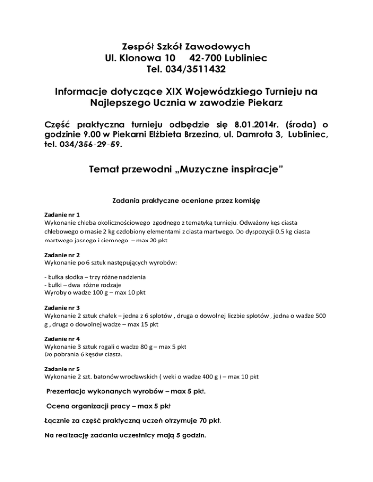 Zespół Szkół Zawodowych Ul. Klonowa 10 42-700 Lubliniec Tel. 034/3511432 Informacje dotyczące XIX Wojewódzkiego Turnieju na Najlepszego Ucznia w zawodzie Piekarz Część praktyczna turnieju odbędzie się 8.01.2014r. (środa) o godzinie 9.00 w Piekarni Elżbieta Brzezina, ul. Damrota 3, Lubliniec, tel. 034/356-29-59. Temat przewodni „Muzyczne inspiracje” Zadania praktyczne oceniane przez komisję Zadanie nr 1 Wykonanie chleba okolicznościowego zgodnego z tematyką turnieju. Odważony kęs ciasta chlebowego o masie 2 kg ozdobiony elementami z ciasta martwego. Do dyspozycji 0.5 kg ciasta martwego jasnego i ciemnego – max 20 pkt Zadanie nr 2 Wykonanie po 6 sztuk następujących wyrobów: - bułka słodka – trzy różne nadzienia - bułki – dwa różne rodzaje Wyroby o wadze 100 g – max 10 pkt Zadanie nr 3 Wykonanie 2 sztuk chałek – jedna z 6 splotów , druga o dowolnej liczbie splotów , jedna o wadze 500 g , druga o dowolnej wadze – max 15 pkt Zadanie nr 4 Wykonanie 3 sztuk rogali o wadze 80 g – max 5 pkt Do pobrania 6 kęsów ciasta. Zadanie nr 5 Wykonanie 2 szt. batonów wrocławskich ( weki o wadze 400 g ) – max 10 pkt Prezentacja wykonanych wyrobów – max 5 pkt. Ocena organizacji pracy – max 5 pkt Łącznie za część praktyczną uczeń otrzymuje 70 pkt. Na realizację zadania uczestnicy mają 5 godzin. Na część praktyczną uczeń musi przynieść: - ubiór bez znaków firmowych ( logo), - drobny sprzęt piekarski, - elementy dekoracyjne wykorzystywane przy ekspozycji wyrobów, - pracowniczą książeczkę zdrowia Uwaga! Ciasta zostaną przygotowane przez zakład Organizator zapewnia: - ciasto pszenno-żytnie na chleb - ciasto martwe - ciasto pszenne, ciasto ziarniste, ciasto mieszane z ziarnami - ciasto drożdżowe - masę serową , marmoladę i masę makową Część teoretyczna turnieju odbędzie się 9.01.2014r. (czwartek) o godzinie 9.00 w Zespole Szkół Zawodowych w Lublińcu przy ul. Klonowej 10 tel.034/ 351 1432 Na część teoretyczną uczeń powinien przynieść przybory do pisania legitymację szkolną W przypadku jakichkolwiek pytań proszę kontaktować się z panią mgr inż. Renatą Pruska kom 0509 097 473 Uroczyste zakończenie i rozdanie nagród z udziałem zaproszonych gości, sponsorów i mediów odbędzie się w Zespole Szkół Zawodowych w Lublińcu , ul. Klonowa 10 Opiekunowie uczniów biorących udział w turnieju powinni być zawodowcami ponieważ będą brać udział w losowaniu jury. Opiekun wytypowany przez szkołę powinien być obecny w pierwszym i drugim dniu turnieju. Szkoły zgłaszają uczniów do 13 grudnia 2013.