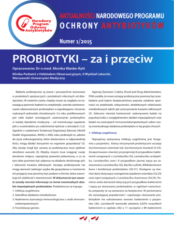 AktualnoŚci Narodowego Programu O c h r o n y A n ty b i oty k ó w Numer 1/2015 PROBIOTYKI – za i przeciw Opracowanie: Dr n.med. Monika Wanke-Rytt Klinika Pediatrii z Oddziałem Obserwacyjnym, II Wydział Lekarski, Warszawski Uniwersytet Medyczny Bakterie probiotyczne są znane i powszechnie stosowane Agencja Żywności i Leków, (Food and Drug Administration, w produktach spożywczych i produktach mlecznych od dzie- FDA) ustaliła, że nowe szczepy probiotyczne powinny być prze- sięcioleci. W ostatnim czasie, między innym za względu na na- badane pod kątem bezpieczeństwa poprzez ustalenie opor- rastającą oporność bakterii na antybiotyki, wzrosło zaintereso- ności na antybiotyki, toksyczności, dodatkowych właściwości wanie właściwościami probiotyków w zapobieganiu i leczeniu metabolicznych takich jak unieczynnianie kwasów żółciowych wybranych jednostek chorobowych. Co roku publikowanych (3). Zalecono również konieczność wykonywania badań na jest setki badań oceniających zastosowanie probiotyków populacji ludzi z uwzględnieniem działań niepożądanych oraz w każdej dziedzinie medycyny – od martwiczego zapalenia badań na zwierzętach immunoniekompetentnych celem oce- jelit u wcześniaków po nadciśnienie tętnicze u dorosłych (1,2). ny ewentualnego działania probiotyków w tej grupie chorych. Zgodnie z ustaleniami Światowej Organizacji Zdrowia (World Health Organization, WHO) z 2002 roku probiotyki to „zdolne 1. Infekcja uogólniona do życia mikroorganizmy, które dostarczone w odpowiedniej Najczęściej opisywaną infekcją uogólnioną jest funge- ilości, mogą działać korzystnie na organizm gospodarza” (3). mia u pacjentów, którzy otrzymywali probiotyczne szczepy Aby szczep mógł być uznany za probiotyczny musi spełniać Saccharomyces cerevisiae lub Saccharomyces boulardi (4-25). określone warunki (3). Między innymi musi osiągnąć swoje Zaraportowano również przynajmniej 8 przypadków bakte- docelowe miejsce, najczęściej przewód pokarmowy, a co za riemii związanych z Lactobacillus GG, Lactobacillus acidophi- tym idzie powinien być odporny na działanie obniżonego pH, lus, Lactobacillus casei i 9 przypadków jawnej sepsy po za- i obecność kwasów żółciowych. Szczepy probiotycznie nie stosowaniu Lactobacillus GG, Bacillus subtilis, Bifidobacterium mogą stanowić żadnego ryzyka dla gospodarza w momencie breve i kombinacji probiotyków (26-31). Dostępne są rów- ich przyjęcia oraz powinny być podane w formie, która warun- nież dane dotyczące wystąpienia zapalenia wsierdzia (32,33) kuje ich stabilność i niezmienność. W dokumencie tym zawar- oraz ropni związanych z Lactobacillus rhamnosus (34,35). Po- te zostały również informacje na temat ewentualnych dzia- mimo wielu doniesień dotyczących przypadków bakteriemii łań niepożądanych probiotyków. Podzielono je na 4 grupy: i sepsy po stosowaniu probiotyków, w ogólnym rozrachun- 1. Infekcja uogólniona. ku preparaty te są uznawane za bezpieczne. W porównaniu 2. Szkodliwe działanie metaboliczne. do wzrastającej popularności i częstszego stosowania pro- 3. Nadmierna stymulacja immunologiczna u osób immuno- biotyków nie odnotowano wzrostu bakteriemii u pacjen- niekompetentnych. tów (36). Lactobacilli stanowiły zaledwie 0,02% wszystkich 4. Translokacja genów. bakteriemii w szpitalu (36) a 11 szczepów z 89 bakteriemii 1 Aktualnosci Narodowego Programu Ochrony Antybiotyków Lactobacilli było identyczne ze szczepami z zastosowanych probiotyków (37). Tabela 1. Grupy chorych ze zwiększonym ryzykiem działań niepożądanych probiotyków 2. Szkodliwe działanie metaboliczne Jednostka chorobowa Przykłady Niedobory odporności Pacjenci na leczeniu podtrzymującym przeszczep, na leczeniu immunosupresyjnym, pacjenci otrzymujący sterydy (½ mg/kg mc prednizonu lub jego odpowiednika), pacjenci w trakcie chemio- i radioterapii Choroby serca Wady zastawek, stany po zabiegach na zastawkach, wywiad w kierunku zapalenia wsierdzia Najbardziej znanym badaniem opisującym działanie niepożądane probiotyków jest opublikowane przed kilkoma laty w Lancet badanie, które wykazało wzrost śmiertelności w grupie chorych z zapaleniem trzustki otrzymujących probiotyk (38). Autorzy spekulowali, że przyczyną zgonu u tych pacjentów mógł być wzrost zapotrzebowania na tlen w śluzówce jelita, które już z powodu podstawowej choroby było niedotlenione. Pozostałe wątpliwości związane z działania- Kobiety ciężarne mi niepożądanymi probiotyków związane są z produkcją Pacjenci hospitalizowani D-mleczanów oraz możliwym działaniem rozbijającym kwa- Pacjenci z zaburzeniami szczelności ścian przewodu pokarmowego sy żółciowe. Opublikowano 5 badań opisujących kwasicę D-mleczanową u pacjentów z zespołem krótkiego jelita, którzy przyjmowali probiotyki. (39-41) „ostry brzuch”, nieswoiste zapalenia jelit, neutropenia po chemioterapii, radioterapia 3. Nadmierna stymulacja immunologiczna u osób immunoniekompetentnych Udowodnione jest działanie probiotyków na układ immunologiczny poprzez wpływ na cytokiny oraz komórki dendrytyczne (42-45). Autorzy badań zastanawiają się czy u pewnej grupy chorych nadmierna stymulacja nie może wywołać stanu zapalnego, jednak nie ma żadnych danych przemawiających w tym kierunku. 4. Translokacja genów Na rynku jest bardzo duży wybór szczepów probiotyków należących do różnych gatunków bakterii probiotycznych. Wyniki wielu badań potwierdzają, że właściwości probiotyków są silnie szczepozależne i często różnią się nawet w obrębie tego samego gatunku i rodzaju. (48). Błędem jest ekstrapolowanie wyników badań konkretnego szczepu na inne nawet w obrębie tego samego gatunku. Świadomość ta ma szczególne znaczenie w przypadku informowania pacjenta o dobroczynnym wpływie probiotyku bez uściślenia jego szczepu. Bakterie kwasu mlekowego zawierają plazmidy, które 