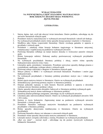 WYKAZ TEMATÓW NA WEWNĘTRZNĄ CZĘŚĆ EGZAMINU MATURALNEGO ROK SZKOLNY 2014/2015 SESJA WIOSENNA JĘZYK POLSKI LITERATURA 1. 2. 3. 4. 5. 6. 7. 8. 9. 10. 11. 12. 13. 14. 15. 16. 17. 18. 19. 20. 21. 22. 23. 24. 25. 26. Satyra, kpina, żart, czyli jak uleczyć świat śmiechem. Omów problem, odwołując się do utworów literackich różnych epok. Przedstaw motywy marynistyczne w wybranych utworach literackich i określ ich funkcje. Na wybranych przykładach omów różne sposoby kreacji postaci więźniów w literaturze. Modlitwa jako forma wypowiedzi literackiej. Omów ewolucję gatunku w oparciu o przykłady z różnych epok. Przedstaw i zanalizuj różne kreacje bohatera tragicznego w literaturze antycznej, romantycznej i współczesnej na podstawie wybranych utworów. Porównaj literackie refleksje na temat śmierci dziecka w twórczości autorów różnych epok. Różne koncepcje miłości. Dokonaj analizy porównawczej wybranych przykładów literackich. Na wybranych przykładach literatury polskiej i obcej, omów różne sposoby funkcjonowania motywu winy i kary. Literackie apele, przesłania i testamenty. Przedstaw powyższe sposoby dialogu pisarza z czytelnikiem, analizując wybrane teksty z różnych epok. Porównaj relacje człowieka z Bogiem w literaturze różnych epok. Motyw pokory w Biblii i w wybranych utworach literackich. Przedstaw i omów jego funkcjonowanie. Na wybranych przykładach z literatury polskiej przedstaw motyw snu i wskaż jego funkcje. Różne ujęcia motywu śmierci w literaturze. Omów na wybranych przykładach. Scharakteryzuj i porównaj portrety mężów w literaturze polskiej. Dramat jednostki wpisany w koło historii. Rozwiń problem w oparciu o dowolnie wybrane utwory literatury polskiej i obcej. Omów sposoby ukazywania obrzędów ludowych w literaturze polskiej wybranych epok. Scharakteryzuj motyw domu rodzinnego w literaturze polskiej. Zanalizuj dramat polskiego emigranta, odwołując się do wybranych utworów. Literatura jako odzwierciedlenie historii. Omów na wybranych przykładach utworów XIX i XX wieku. Kariera w życiu bohaterów. Zaprezentuj temat na podstawie wybranych utworów literackich z różnych epok. Przedstaw literackie realizacje motywów biesiadnych na podstawie wybranych przykładów z literatury polskiej. Różne sposoby ukazywania totalitaryzmu w literaturze. Omów na wybranych przykładach. Porównaj literackie obrazy wsi ukazane w utworach różnych epok. Przedstaw różne sposoby ukazywania motywu samotności w literaturze. Literacki motyw związku człowieka z ziemią. Przedstaw na wybranych przykładach. „Być czy mieć” – rozważ myśl , odwołując się do postaw życiowych wybranych bohaterów literackich. 27. 28. 29. 30. 31. 32. 33. 34. 35. 36. 37. 38. 39. 40. 41. 42. 43. 44. 45. 46. 47. 48. 49. 50. 51. 52. 53. 54. 55. 56. 57. 58. 59. 60. 61. 62. Zjawy, duchy i potwory inspiracją dla twórców dzieł literackich. Omów na wybranych przykładach. Przyroda – nieodłączny towarzysz człowieka. Odwołaj się do wybranych utworów literackich. Przedstaw różne programy naprawy Polski w literaturze wybranych epok. Zanalizuj wpływ doświadczeń życiowych na kształtowanie się postaw moralnych wybranych bohaterów literackich. Folklor inspiracją twórców różnych epok. Omów temat na wybranych przykładach. Zanalizuj i omów konflikty pokoleń zapisane na kartach literatury polskiej w oparciu o wybrane przykłady. Starość jako motyw literacki. Porównaj sposoby portretowania wybranych postaci. Omów wpływ przysięgi i przyrzeczenia na życie wybranych bohaterów literackich. Bohaterowie literaccy powracający do domu. Rozważ problem na wybranych przykładach. Ukaż odmienne sposoby pojmowania patriotyzmu przez bohaterów różnych epok literackich. Przemiana bohatera literackiego i jej sens. Zanalizuj problem, odwołując się do przykładów z różnych epok. Zanalizuj motyw przemijania na podstawie wybranych utworów literackich. Zanalizuj i porównaj systemy wartości bohaterów literackich różnych epok. Na wybranych przykładach literackich scharakteryzuj bohaterów-buntowników. Ukaż dylematy moralne wybranych bohaterów utworów literackich XIX i XX wieku. Porównaj motyw buntu przeciw Bogu w wybranych utworach literackich różnych epok. Zanalizuj motyw dojrzewania bohatera w literaturze na podstawie wybranych utworów. Bohaterowie w habitach. Przedstaw sposób ich kreowania na przykładzie wybranych utworów literackich. Przedstaw różne sposoby ukazywania młodości w literaturze wybranych epok. Sądy o narodzie polskim w dramacie. Omów na wybranych przykładach. Idealiści i realiści – różne postawy bohaterów literackich wobec życia. Omów problem, odwołując się do wybranych powieści. Porównaj różne obrazy miast w literaturze XIX i XX wieku. Miłość i uroda życia w poezji. Omów na wybranych przykładach. Motywy biblijne i ich funkcje w literaturze XIX i XX w. Omów na wybranych przykładach. Zanalizuj przyczyny i skutki wyalienowania bohatera literackiego. Omów na wybranych przykładach. Porównaj literackie ujęcia scen batalistycznych w wybranych utworach. Zbiorowość jako bohater literacki. Omów na wybranych przykładach. Porównaj różne postawy bohaterów literackich wobec zagrożenia na podstawie wybranych utworów. Przedstaw różne ujęcia motywu pielgrzyma w poezji. Odwołaj się do wybranych przykładów. Zaprezentuj kreacje postaci Żydów na przykładzie wybranych utworów różnych epok. Antyk jako źródło kultury polskiej. Omów na wybranych przykładach literackich. Określ funkcję tytułu i motta w tekście literackim, odwołując się do wybranych przykładów. Obraz szaleńca w literaturze. Przedstaw i porównaj wybrane postacie. Wskaż i omów motywy horacjańskie w literaturze polskiej oraz określ ich funkcje. Porównaj niepokoje egzystencjalne człowieka w twórczości autorów różnych epok. Zaprezentuj i oceń postawy człowieka wobec zł