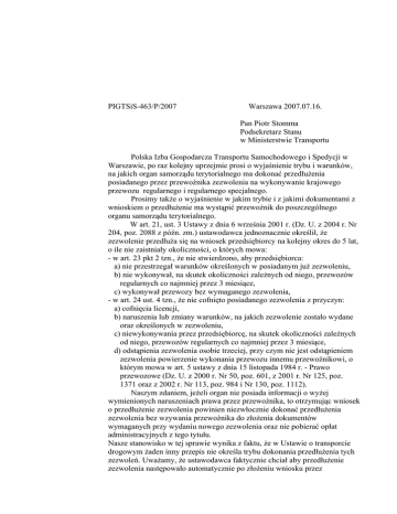 PIGTSiS-463/P/2007 Warszawa 2007.07.16. Pan Piotr Stomma Podsekretarz Stanu w Ministerstwie Transportu Polska Izba Gospodarcza Transportu Samochodowego i Spedycji w Warszawie, po raz kolejny uprzejmie prosi o wyjaśnienie trybu i warunków, na jakich organ samorządu terytorialnego ma dokonać przedłużenia posiadanego przez przewoźnika zezwolenia na wykonywanie krajowego przewozu regularnego i regularnego specjalnego. Prosimy także o wyjaśnienie w jakim trybie i z jakimi dokumentami z wnioskiem o przedłużenie ma wystąpić przewoźnik do poszczególnego organu samorządu terytorialnego. W art. 21, ust. 3 Ustawy z dnia 6 września 2001 r. (Dz. U. z 2004 r. Nr 204, poz. 2088 z późn. zm.) ustawodawca jednoznacznie określił, że zezwolenie przedłuża się na wniosek przedsiębiorcy na kolejny okres do 5 lat, o ile nie zaistniały okoliczności, o których mowa: - w art. 23 pkt 2 tzn., że nie stwierdzono, aby przedsiębiorca: a) nie przestrzegał warunków określonych w posiadanym już zezwoleniu, b) nie wykonywał, na skutek okoliczności zależnych od niego, przewozów regularnych co najmniej przez 3 miesiące, c) wykonywał przewozy bez wymaganego zezwolenia, - w art. 24 ust. 4 tzn., że nie cofnięto posiadanego zezwolenia z przyczyn: a) cofnięcia licencji, b) naruszenia lub zmiany warunków, na jakich zezwolenie zostało wydane oraz określonych w zezwoleniu, c) niewykonywania przez przedsiębiorcę, na skutek okoliczności zależnych od niego, przewozów regularnych co najmniej przez 3 miesiące, d) odstąpienia zezwolenia osobie trzeciej, przy czym nie jest odstąpieniem zezwolenia powierzenie wykonania przewozu innemu przewoźnikowi, o którym mowa w art. 5 ustawy z dnia 15 listopada 1984 r. - Prawo przewozowe (Dz. U. z 2000 r. Nr 50, poz. 601, z 2001 r. Nr 125, poz. 1371 oraz z 2002 r. Nr 113, poz. 984 i Nr 130, poz. 1112). Naszym zdaniem, jeżeli organ nie posiada informacji o wyżej wymienionych naruszeniach prawa przez przewoźnika, to otrzymując wniosek o przedłużenie zezwolenia powinien niezwłocznie dokonać przedłużenia zezwolenia bez wzywania przewoźnika do złożenia dokumentów wymaganych przy wydaniu nowego zezwolenia oraz nie pobierać opłat administracyjnych z tego tytułu. Nasze stanowisko w tej sprawie wynika z faktu, że w Ustawie o transporcie drogowym żaden inny przepis nie określa trybu dokonania przedłużenia tych zezwoleń. Uważamy, że ustawodawca faktycznie chciał aby przedłużenie zezwolenia następowało automatycznie po złożeniu wniosku przez przewoźnika, albowiem w przeciwnym wypadku określiłby w Ustawie tryb przedłużenia. Izba otrzymuje od przewoźników informacje, że pomimo braku w Ustawie wymogów składania dokumentów do wniosku o przedłużenie zezwolenia stosowana jest przez samorządy praktyka domagania się od przewoźnika ponownego złożenie wszystkich dokumentów tak jak przy wniosku o nowe zezwolenie, czyli: a) proponowany rozkład jazdy uwzględniający przystanki, godziny odjazdów środków transportowych, długość linii komunikacyjnej, podaną w kilometrach, i odległości między przystankami, kursy oraz liczbę pojazdów niezbędnych do wykonywania codziennych przewozów, zgodnie z rozkładem jazdy, b) schemat połączeń komunikacyjnych z zaznaczoną linią komunikacyjną i przystankami, c) potwierdzenie uzgodnienia zasad korzystania z obiektów dworcowych i przystanków, dokonanego z ich właścicielami lub zarządzającymi, d) zobowiązanie do zamieszczania informacji o godzinach odjazdów na tabliczkach przystankowych na przystankach, e) cennik, f) wykaz pojazdów, z określeniem ich liczby oraz liczby miejsc, którymi wnioskodawca zamierza wykonywać przewozy. Żądania przedłożenia całej nowej dokumentacji jak przy nowym zezwoleniu to zbędna biurokracja, dodatkowe ogromne koszty oraz przedłużenie procedury do kilku miesięcy. Wątpliwości budzi także zapis art. 22a w ust. 3, który wprowadza obowiązek przeprowadzenia analizy sytuacji rynkowej w zakresie regularnego przewozu osób przed wydaniem nowego zezwolenia lub jego zmiany. Nie ma natomiast wymogu, by taka analiza miała by być wykonywana przy przedłużaniu zezwoleń. Stosowana przez samorządy praktyka pokazuje, że przepisy ustawy są niejednoznaczne, ponieważ część samorządów nie widzi potrzeby dokonywania analizy i nie pobiera żadnych opłat z tego tytułu, a niektóre samorządy uważają, że należy wykonać taką analizę i pobrać w związku z tym przewidziane prawem opłaty. Naszym zdaniem sytuacja ta wymaga nowelizacji ustawy i rozporządzenia albowiem obowiązujące przepisy są niespójne. W art. 41 w ust. 1 pkt 2 ustawą z dnia 29 lipca 2005 r. o zmianie ustawy o transporcie drogowym oraz niektórych innych ustaw (Dz. U. z 2005 r. Nr 180, poz. 1497) wprowadzono przepis pozwalający na pobieranie opłat za przedłużenie ważności zezwolenia. Jednakże nadal obowiązujące Rozporządzenie Ministra Infrastruktury z dnia 5 lipca 2004 r. w sprawie wysokości opłat za czynności administracyjne związane z wykonywaniem transportu drogowego oraz za egzaminowanie i wydanie certyfikatu kompetencji zawodowych (Dz. U. z 2004 r. Nr 159, poz. 1664) takich opłat nie przewiduje. Ministerstwo Transportu podejmowało próbę uregulowania tego problemu. Przy piśmie nr l. dz. TD-3ż-0771/783/06 z 10 listopada 2006 r. Izba otrzymała do zaopiniowania projekt rozporządzenia Ministra Transportu w sprawie wysokości opłat za czynności administracyjne związane z wykonywaniem transportu drogowego oraz za egzaminowanie i wydawanie certyfikatu kompetencji zawodowych. Do tego projektu nasza organizacja w piśmie nr L. dz. PIGTSiS- 652/P/2007 z 5 grudnia 2006 roku adresowanym do Dyrektora Departamentu Dróg i Transportu Drogowego wniosła szereg uwag (kserokopię pisma ponownie składamy w załączeniu). Rozporządzenie do dnia dzisiejszego nie zostało zmienione. W związku z powyższym Polska Izba Gospodarcza Transportu Samoc