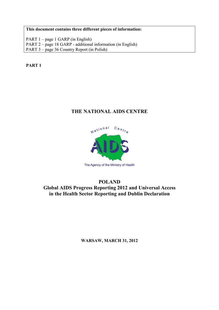 This document contains three different pieces of information: PART 1 – page 1 GARP (in English) PART 2 – page 18 GARP - additional information (in English) PART 3 – page 36 Country Report (in Polish) PART 1 THE NATIONAL AIDS CENTRE POLAND Global AIDS Progress Reporting 2012 and Universal Access in the Health Sector Reporting and Dublin Declaration WARSAW, MARCH 31, 2012 2 TABLE OF CONTENTS I. INTRUCTION II. LEADERSHIP AT THE NATIONAL LEVEL III. PREVENTION IV. CARE, SUPPORT AND TREATMENT V. HUMAN RIGHTS VI. REDUCING VULNERABILITY VII. ALLEVIATING SOCIAL AND ECONOMIC IMPACT VIII. RESEARCH AND DEVELOPMENT (R&D) IX. MOBILIZATION OF RESOURCES X. FOLLOW-UP XI. CONCLUSIONS 3 Global AIDS Progress Reporting 2012 POLAND 2010-2011 Introduction Presenting the following report on fight against HIV/AIDS in Poland it is necessary to underline that the undertaken activities are in line with priorities set in Declaration of Commitment on HIV/AIDS and the Dublin Declaration. These priorities include ensuring: • strong leadership at the national level, • prevention, • care – support and treatment, • human rights, • reducing vulnerability, • alleviating social and economic impact, • research and development and • mobilization of the resources. Leadership at the national level The development and implementation of Polish national strategy and policy on HIV/AIDS encompasses multisectoral strategies and financing plans as well as the integration of HIV/AIDS combat into the mainstream of development planning. The institutional system established in our country guarantees a continuity of financing of both preventive actions, and the ARV therapy. In accordance with the Three Ones’ rule, which promotion Poland very much welcomes, since 1996 a multisectoral program of combating HIV/AIDS have been ran and it is coordinated by the National AIDS Centre, a governmental structure under the Minister of Health. Strong leadership as a condition of effective response to the epidemic. The fight against HIV/AIDS in Poland is considered as one of the governmental priorities. Appropriate activities follow national strategy and policy and are carried out in accordance 4 with the National Plan - called the National Programme for Combating AIDS and Preventing HIV Infections. Current National Plan covers the years 2007 – 2011 and is a continuation of the previous three programmes and was adopted by the Council of Ministers on the basis of a regulation as of September 13, 2005. The first National Programme for HIV Prevention and Care for People Living with HIV/AIDS (PLWHA) for 1996 – 1998 was prepared as a response to a parliamentary resolution. Adopted by the Government the second edition of the Programme covered the years 1999 – 2003, and the third the years 2004 – 2006. The Programmes were documents of the national grade, defining Poland’s strategy and policy on HIV/AIDS. Strong state leadership was guaranteed by Ministry of Health having the leading role both in strategy and policy creation and coordination and supervision. The documents also defined sectoral partners in the Programme realization. The main effects of the implementation of the previous three national programmes are: Prevention: Improvement of the availability of anonymous and free of charge HIV testing, high quality service; increase in the number of people having tests; Increase in the number of certified educators in the area of HIV/AIDS, specialising in work with selected environments (schools, prisons); Higher effectiveness of HIV/AIDS prevention media campaigns; Continuation of harm reduction programmes aimed at particularly difficult populations. Care for PLWHA: Decrease in the mortality rates due to AIDS. Improvement of the quality of life of people living with HIV. Epidemiology Stable HIV epidemiological situation, despite the dynamic increase of HIV infections in Eastern neighbouring countries. Decrease in the number of HIV vertical transmissions among children born to HIV infected mothers. Introduction of after exposure procedures (ARV treatment) contributed to a decline of these infections. 5 Schedule for Implementation of the National Programme for Combating AIDS and Preventing HIV Infections for the years 2007-2011 The Programme contains a plan of multisectoral action identifying bodies subordinated to and cooperating with the Ministry of Health, including the ministries implementing tasks of the previous three editions of the National Programme. The Programme envisages direct participation and involvement of PLWHA and NGOs acting in the field of HIV/AIDS and provides for permanent activation of self-governmental structures and initiation of integrated actions in order to achieve the required goals. Institution that implements the Programme: Ministry of Health Institution that coordinates the Programme: National AIDS Centre Institutions implementing the Programme: Ministry of Education Ministry of Education and Science Ministry of Sport and Tourism Ministry of Internal Affairs and Administration Ministry of Defence Ministry of Justice Ministry of Transport Ministry Labour and Social Policy Ministry of Economy Ministry of Maritime Economy Entities obliged to implement e.g.: Local authorities and subordinated entities Polish Sanitary Inspection National Institute of Hygiene Voivodes National Health Fund 6 Ministry of Foreign Affairs National Infectious Diseases Consultant National Consultant for Epidemiology National Consultant for Laboratory Diagnostics National Bureau for Drug Prevention Non-governmental institutions Polish Scientific Society Financing plans Ensuring financial means for the entities involved in the Programme is a prerequisite for its implementation. Ministry of Health Analysis of the epidemiological and clinical situation proves that the number of AIDS cases and cost of treatment still increases. The increase in the number of patients as well as availability of more effective, but at the same more 