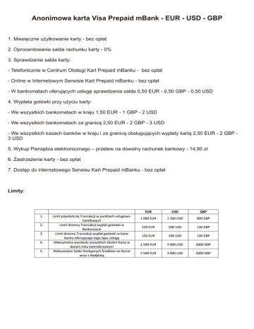 Anonimowa karta Visa Prepaid mBank - EUR - USD - GBP 1. Miesięczne użytkowanie karty - bez opłat 2. Oprocentowanie salda rachunku karty - 0% 3. Sprawdzenie salda karty: - Telefonicznie w Centrum Obsługi Kart Prepaid mBanku - bez opłat - Online w Internetowym Serwisie Kart Prepaid mBanku - bez opłat - W bankomatach oferujących usługę sprawdzenia salda 0,50 EUR - 0,50 GBP - 0,50 USD 4. Wypłata gotówki przy użyciu karty: - We wszystkich bankomatach w kraju 1,50 EUR - 1 GBP - 2 USD - We wszystkich bankomatach za granicą 2,50 EUR - 2 GBP - 3 USD - We wszystkich kasach banków w kraju i za granicą obsługujących wypłaty kartą 2,50 EUR - 2 GBP 3 USD 5. Wykup Pieniądza elektronicznego – przelew na dowolny rachunek bankowy - 14,90 zł 6. Zastrzeżenie karty - bez opłat 7. Dostęp do internetowego Serwisu Kart Prepaid mBanku - bez opłat Limity: