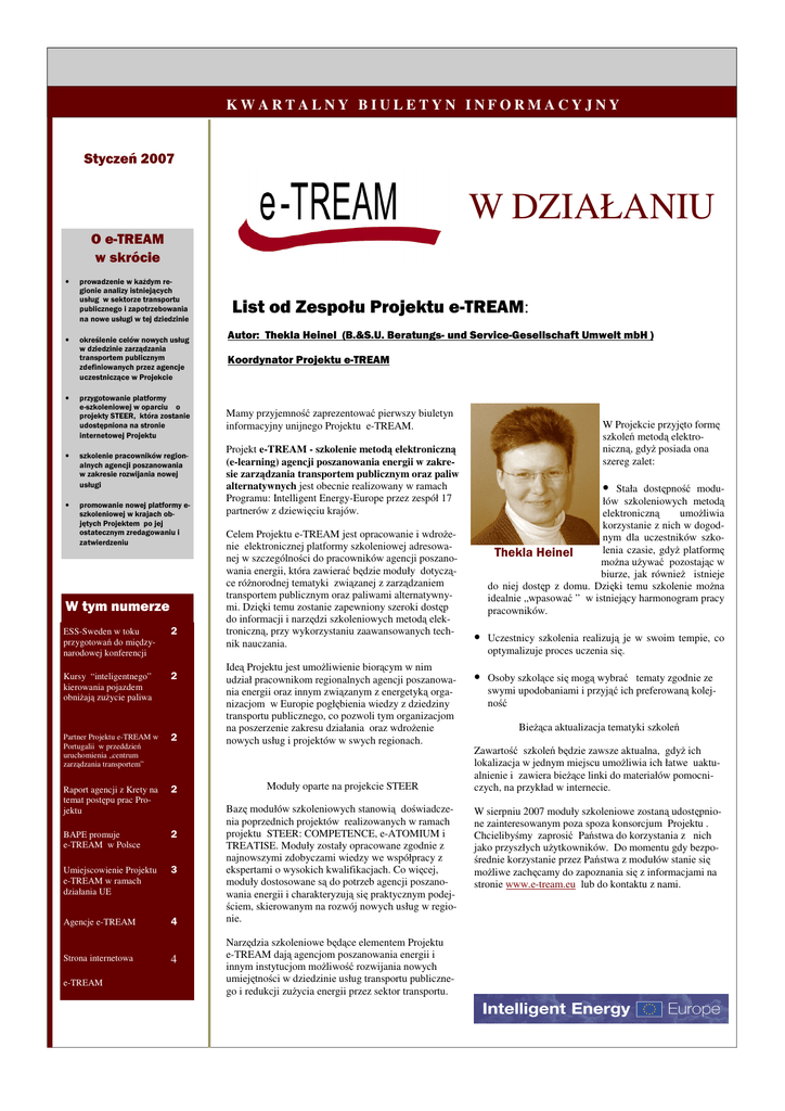 KWARTALNY BIULETYN INFORMACYJNY Styczeń 2007 W DZIAŁANIU O e-TREAM w skrócie • • • prowadzenie w każdym regionie analizy istniejących usług w sektorze transportu publicznego i zapotrzebowania na nowe usługi w tej dziedzinie List od Zespołu Projektu e-TREAM: Autor: Thekla Heinel (B.&S.U. Beratungs- und Service-Gesellschaft Umwelt mbH ) określenie celów nowych usług w dziedzinie zarządzania transportem publicznym zdefiniowanych przez agencje uczestniczące w Projekcie Koordynator Projektu e-TREAM przygotowanie platformy e-szkoleniowej w oparciu o projekty STEER, która zostanie udostępniona na stronie internetowej Projektu Mamy przyjemność zaprezentować pierwszy biuletyn informacyjny unijnego Projektu e-TREAM. • szkolenie pracowników regionalnych agencji poszanowania w zakresie rozwijania nowej usługi • promowanie nowej platformy eszkoleniowej w krajach objętych Projektem po jej ostatecznym zredagowaniu i zatwierdzeniu W tym numerze ESS-Sweden w toku przygotowań do międzynarodowej konferencji 2 Kursy “inteligentnego” kierowania pojazdem obniżają zużycie paliwa 2 Partner Projektu e-TREAM w Portugalii w przeddzień uruchomienia „centrum zarządzania transportem” 2 Raport agencji z Krety na temat postępu prac Projektu 2 BAPE promuje e-TREAM w Polsce 2 Umiejscowienie Projektu e-TREAM w ramach działania UE 3 Agencje e-TREAM 4 Strona internetowa 4 e-TREAM Projekt e-TREAM - szkolenie metodą elektroniczną (e-learning) agencji poszanowania energii w zakresie zarządzania transportem publicznym oraz paliw alternatywnych jest obecnie realizowany w ramach Programu: Intelligent Energy-Europe przez zespół 17 partnerów z dziewięciu krajów. Celem Projektu e-TREAM jest opracowanie i wdrożenie elektronicznej platformy szkoleniowej adresowanej w szczególności do pracowników agencji poszanowania energii, która zawierać będzie moduły dotyczące różnorodnej tematyki związanej z zarządzaniem transportem publicznym oraz paliwami alternatywnymi. Dzięki temu zostanie zapewniony szeroki dostęp do informacji i narzędzi szkoleniowych metodą elektroniczną, przy wykorzystaniu zaawansowanych technik nauczania. Ideą Projektu jest umożliwienie biorącym w nim udział pracownikom regionalnych agencji poszanowania energii oraz innym związanym z energetyką organizacjom w Europie pogłębienia wiedzy z dziedziny transportu publicznego, co pozwoli tym organizacjom na poszerzenie zakresu działania oraz wdrożenie nowych usług i projektów w swych regionach. Moduły oparte na projekcie STEER Bazę modułów szkoleniowych stanowią doświadczenia poprzednich projektów realizowanych w ramach projektu STEER: COMPETENCE, e-ATOMIUM i TREATISE. Moduły zostały opracowane zgodnie z najnowszymi zdobyczami wiedzy we współpracy z ekspertami o wysokich kwalifikacjach. Co więcej, moduły dostosowane są do potrzeb agencji poszanowania energii i charakteryzują się praktycznym podejściem, skierowanym na rozwój nowych usług w regionie. Narzędzia szkoleniowe będące elementem Projektu e-TREAM dają agencjom poszanowania energii i innym instytucjom możliwość rozwijania nowych umiejętności w dziedzinie usług transportu publicznego i redukcji zużycia energii przez sektor transportu. W Projekcie przyjęto formę szkoleń metodą elektroniczną, gdyż posiada ona szereg zalet: • Stała dostępność modułów szkoleniowych metodą elektroniczną umożliwia korzystanie z nich w dogodnym dla uczestników szkolenia czasie, gdyż platformę Thekla Heinel można używać pozostając w biurze, jak również istnieje do niej dostęp z domu. Dzięki temu szkolenie można idealnie „wpasować ” w istniejący harmonogram pracy pracowników. • Uczestnicy szkolenia realizują je w swoim tempie, co optymalizuje proces uczenia się. • Osoby szkolące się mogą wybrać tematy zgodnie ze swymi upodobaniami i przyjąć ich preferowaną kolejność Bieżąca aktualizacja tematyki szkoleń Zawartość szkoleń będzie zawsze aktualna, gdyż ich lokalizacja w jednym miejscu umożliwia ich łatwe uaktualnienie i zawiera bieżące linki do materiałów pomocniczych, na przykład w internecie. W sierpniu 2007 moduły szkoleniowe zostaną udostępnione zainteresowanym poza spoza konsorcjum Projektu . Chcielibyśmy zaprosić Państwa do korzystania z nich jako przyszłych użytkowników. Do momentu gdy bezpośrednie korzystanie przez Państwa z modułów stanie się możliwe zachęcamy do zapoznania się z informacjami na stronie www.e-tream.eu lub do kontaktu z nami. Strona 2 Przygotowania agencji ESS-Sweden do międzynarodowej konferencji Partnerska agencja z Krety informuje o postępach w realizacji Projektu Partnerska agencja Regional Energy Agency of Crete (Regionalna Agencja Energii) informuje, iż zakończyła prace nad modułem szkoleniowym Projektu eTREAM „Zarządzanie Transportem dla Przedsiębiorstw i Samorządów Lokalnych”. Przedstawiciel agencji, Kostas Kalitsounakis relacjonuje: „ Jesteśmy w stałym kontakcie z kluczowymi aktorami, organizujemy spotkania i przygotowujemy broszurę informacyjną w języku greckim, która będzie rozpowszechniana regionalnie i w całym kraju.” BAPE promuje e-TREAM w Polsce Jak donosi Katarzyna Grecka z Bałtyckiej Agencji Poszanowania Energii (BAPE), będącej partnerem Projektu, w lipcu 2006 r. miało miejsce w Gd a ń s k u s em i n a ri u m promujące Projekt eTREAM. Impreza, odbywająca się pod patronatem Marszałka województwa pomorskiego, zgromadziła 30 przedstawicieli instytucji odgrywających ważną rolę na rynku biopaliw i sektora transportu publicznego. Uczestnikom spotkania rozdano ulotki informacyjne na temat Projektu e- TREAM. Mimo trwania skandynawskiej zimy, Jonas Lööf z Energy Agency for Southeast Sweden (ESS) donosi o wysokim stopniu aktywności w sferze przygotowań do ważnej międzynarodowej konferencji, która odbędzie się w maju tego roku. Miejscem imprezy jest miasto Vaxjö, będące sie