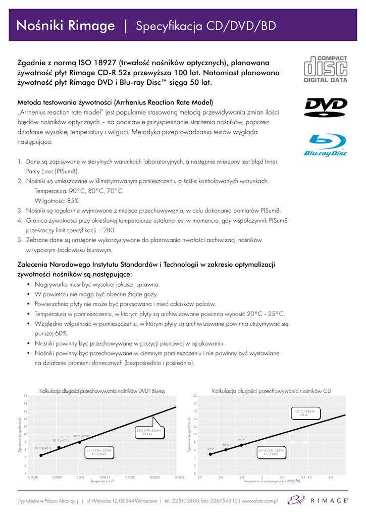Nośniki Rimage | Specyfikacja CD/DVD/BD Zgodnie z normą ISO 18927 (trwałość nośników optycznych), planowana żywotność płyt Rimage CD-R 52x przewyższa 100 lat. Natomiast planowana żywotność płyt Rimage DVD i Blu-ray Disc™ sięga 50 lat. Metoda testowania żywotności (Arrhenius Reaction Rate Model) „Arrhenius reaction rate model” jest popularnie stosowaną metodą przewidywania zmian ilości błędów nośników optycznych – na podstawie przyspieszanie starzenia nośników, poprzez działanie wysokiej temperatury i wilgoci. Metodyka przeprowadzania testów wygląda następująco: 1. Dane są zapisywane w sterylnych warunkach laboratoryjnych, a następnie mierzony jest błąd Inner Parity Error (PISum8). 2. Nośniki są umieszczane w klimatyzowanym pomieszczeniu o ściśle kontrolowanych warunkach: Temperatura: 90°C, 80°C, 70°C Wilgotność: 85% 3. Nośniki są regularnie wyjmowane z miejsca przechowywania, w celu dokonania pomiarów PISum8. 4. Granica żywotności przy określonej temperaturze ustalana jest w momencie, gdy współczynnik PISum8 przekroczy limit specyfikacji – 280. 5. Zebrane dane są następnie wykorzystywane do planowania trwałości archiwizacji nośników w typowym środowisku biurowym. Zalecenia Narodowego Instytutu Standardów i Technologii w zakresie optymalizacji żywotności nośników są następujące: • Nagrywarka musi być wysokiej jakości, sprawna. • W powietrzu nie mogą być obecne żrące gazy. • Powierzchnia płyty nie może być porysowana i mieć odcisków palców. • Temperatura w pomieszczeniu, w którym płyty są archiwizowane powinna wynosić 20°C – 25°C. • Względna wilgotność w pomieszczeniu, w którym płyty są archiwizowane powinna utrzymywać się poniżej 60%. • Nośniki powinny być przechowywane w pozycji pionowej w opakowaniu. • Nośniki powinny być przechowywane w ciemnym pomieszczeniu i nie powinny być wystawiane na działanie promieni słonecznych (bezpośrednio i pośrednio). Kalkulacja długości przechowywania nośników DVD i Blu-ray 14 18 13 16 12 14 11 10 8 25˚ C (77˚F), 85% RH 52.4 lat 80˚ C (176˚ F) 70˚ C (167˚ F) 9 50˚ C (140˚ F) Kalkulacja długości przechowywania nośników CD 20 Żywotność (w godzinach) Żywotność (w godzinach) 15 y = 10.529x - 22.299 R 2 = 0.9595 12 10 70˚ C 8 80˚ C 90˚ C 6 7 4 6 2 5 25˚ C / 85% RH 105 lat y = 14.224x - 33.973 R 2 = 0.9997 0 0.0028 0.0029 0.003 0.00.31 Temperatura 1/T 0.0032 0.0033 0.0034 2.7 2.8 2.9 3 3.1 Temperatura przechowywania (1000/0K) Dystrybutor w Polsce: Alstor sp. j. | ul. Wenecka 12, 03-244 Warszawa | tel.: 22 510 24 00, faks: 22 675 43 10 | www.alstor.com.pl 3.2 3.3 3.4 3.5 Nośniki Rimage | Specyfikacja CD/DVD/BD Specyfikacja nośników optycznych Specyfikacja nośników CD 700 MB, DVD 4.7 GB i 8.5 GB oraz płyt Blu-ray 25 GB i 50 GB oferowanych przez Rimage Corporation. Numer produktu Specyfikacja CD Specyfikacja DVD Specyfikacja Blu-ray 2001631 i 2001972 2001633 i 2001693 2001635 i 2001636 Pojemność 700 MB 4,7 GB 25 GB i 50 GB Średnica zewnętrzna płyty 120 mm 120 mm 120 mm Średnica wewnętrzna powierzchni nadruku 24 mm 24 mm 25 mm Średnica otworu 15 mm 15 mm 15 mm Grubość płyty 1,2 mm 1,2 mm 1,2 mm Powierzchnia nadruku 24:118 24:118 25:118 Powierzchnia do nadruku UV Ink UV Ink UV Ink Warstwa nadruku UV Ink UV Ink UV Ink Podłoże Poliwęglan Poliwęglan Poliwęglan Klej Żywica UV Żywica UV Żywica UV Warstwa odblaskowa Warstwa barwiona Temperatura przechowywania Temperatura pracy (odtwarzanie) Temperatura pracy (zapis) Temperatura transportu (2 tygodnie) metalowa metalowa Metalowa Barwnik organiczny Barwnik organiczny Barwnik organiczny -20 ~ 50°C / 5 ~ 90% (.05 ~ 30 g/m3 maks., bez kondensacji) -25 ~ 70°C / 3 ~ 95% (.05 ~ 60g/m3 maks., bez kondensacji) -5 ~ 55°C / 3 ~ 95% (.05 ~ 30g/m3 maks., bez kondensacji) -40 ~ 60°C / 5 ~ 95% (.05 ~ 30g/m3 maks., bez kondensacji) Charakterystyka płyt powinna być zgodna z wytycznymi Blu-ray Association. Charakterystyka płyt powinna być zgodna z wytycznymi Philips Orange Book dla zapisywalnych płyt optycznych. Test archiwizacji w wysokiej temperaturze Odporność wybarwień nadruku na działanie światła słonecznego 68‑2‑8 Ba, temperatura 55°C, względna wilgotność maks. 50% (przy 35°C) 96th ISO-105-B02 Czarny Wzorzec, temp. ≤ 40°C, względna wilgotność maks. 70 – 80% Niebieska Skala Wełniana #5 Dystrybutor w Polsce: Alstor sp. j. | ul. Wenecka 12, 03-244 Warszawa | tel.: 22 510 24 00, faks: 22 675 43 10 | www.alstor.com.pl
