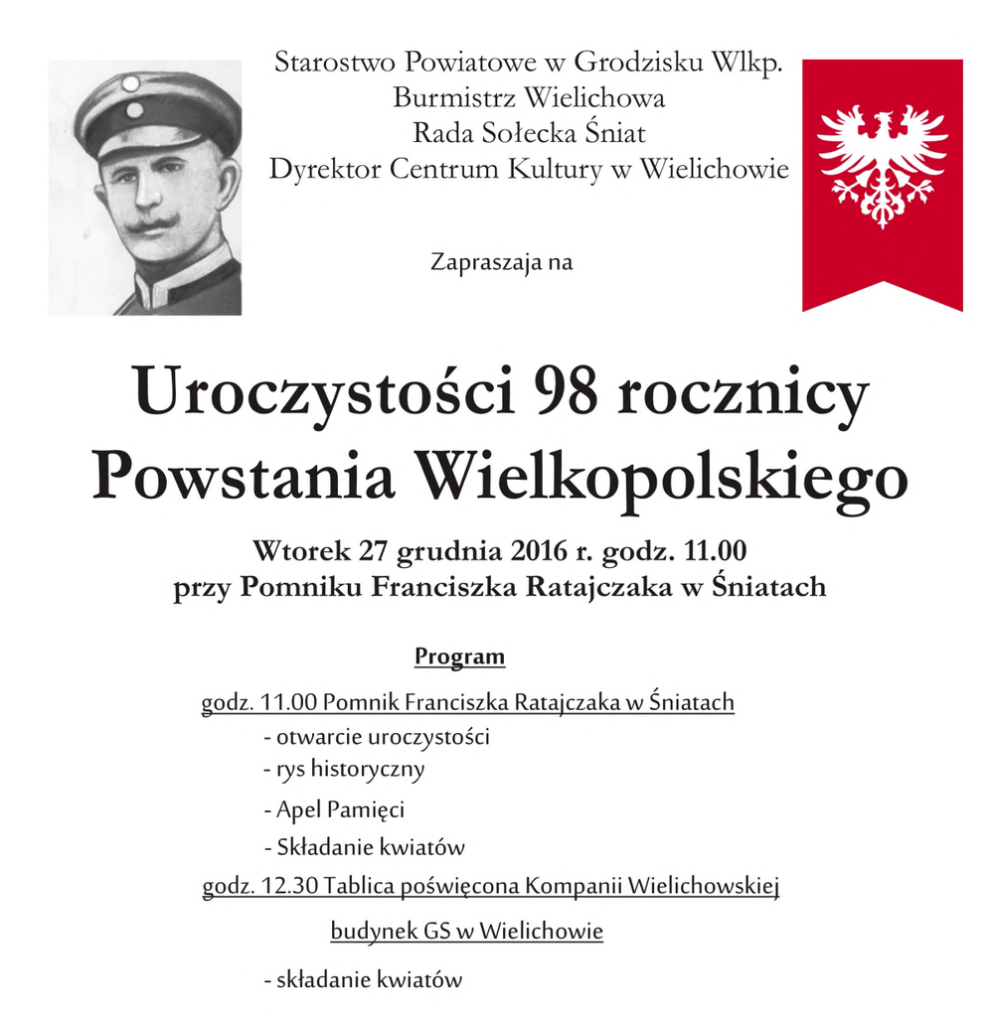 Starostwo Powiatowe w Grodzisku Wlkp. Burmistrz Wielichowa Rada Sołecka Sniat Dyrektor Centrum Kultury w Wielichowie Zapraszaj a na Uroczystości 98 rocznicy Powstania Wielkopolskieg Wtorek 27 grudnia 2016 r. godz. 11.00 przy Pom niku Franciszka Ratajczaka w Sniatach r Program godz. 11.00 Pom nik Franciszka Ratajczaka w Śniatach - otwarcie uroczystości - rys historyczny - Apel Pamięci - Składanie kw ia tó w godz. 12.30 Tablica poświecona Kom panii W ielichowskiej budynek GS w W ielichow ie - składanie kw ia tó w