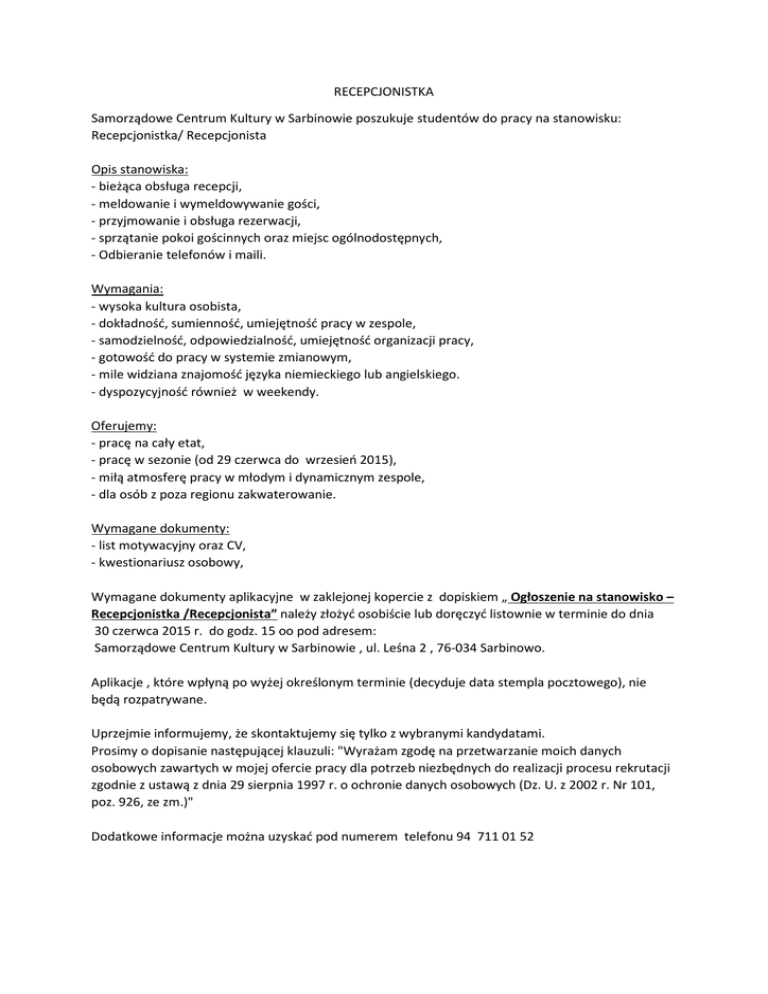 RECEPCJONISTKA Samorządowe Centrum Kultury w Sarbinowie poszukuje studentów do pracy na stanowisku: Recepcjonistka/ Recepcjonista Opis stanowiska: - bieżąca obsługa recepcji, - meldowanie i wymeldowywanie gości, - przyjmowanie i obsługa rezerwacji, - sprzątanie pokoi gościnnych oraz miejsc ogólnodostępnych, - Odbieranie telefonów i maili. Wymagania: - wysoka kultura osobista, - dokładność, sumienność, umiejętność pracy w zespole, - samodzielność, odpowiedzialność, umiejętność organizacji pracy, - gotowość do pracy w systemie zmianowym, - mile widziana znajomość języka niemieckiego lub angielskiego. - dyspozycyjność również w weekendy. Oferujemy: - pracę na cały etat, - pracę w sezonie (od 29 czerwca do wrzesień 2015), - miłą atmosferę pracy w młodym i dynamicznym zespole, - dla osób z poza regionu zakwaterowanie. Wymagane dokumenty: - list motywacyjny oraz CV, - kwestionariusz osobowy, Wymagane dokumenty aplikacyjne w zaklejonej kopercie z dopiskiem „ Ogłoszenie na stanowisko – Recepcjonistka /Recepcjonista” należy złożyć osobiście lub doręczyć listownie w terminie do dnia 30 czerwca 2015 r. do godz. 15 oo pod adresem: Samorządowe Centrum Kultury w Sarbinowie , ul. Leśna 2 , 76-034 Sarbinowo. Aplikacje , które wpłyną po wyżej określonym terminie (decyduje data stempla pocztowego), nie będą rozpatrywane. Uprzejmie informujemy, że skontaktujemy się tylko z wybranymi kandydatami. Prosimy o dopisanie następującej klauzuli: "Wyrażam zgodę na przetwarzanie moich danych osobowych zawartych w mojej ofercie pracy dla potrzeb niezbędnych do realizacji procesu rekrutacji zgodnie z ustawą z dnia 29 sierpnia 1997 r. o ochronie danych osobowych (Dz. U. z 2002 r. Nr 101, poz. 926, ze zm.)" Dodatkowe informacje można uzyskać pod numerem telefonu 94 711 01 52