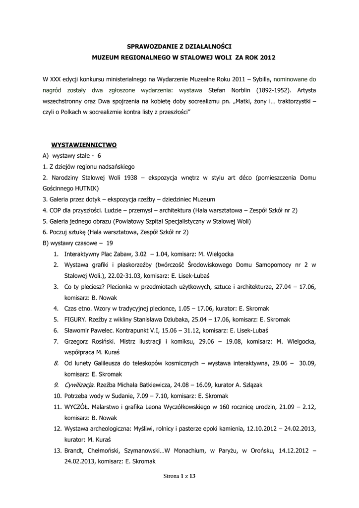 SPRAWOZDANIE Z DZIAŁALNOŚCI MUZEUM REGIONALNEGO W STALOWEJ WOLI ZA ROK 2012 W XXX edycji konkursu ministerialnego na Wydarzenie Muzealne Roku 2011 – Sybilla, nominowane do nagród zostały dwa zgłoszone wydarzenia: wystawa Stefan Norblin (1892-1952). Artysta wszechstronny oraz Dwa spojrzenia na kobietę doby socrealizmu pn. „Matki, żony i… traktorzystki – czyli o Polkach w socrealizmie kontra listy z przeszłości” WYSTAWIENNICTWO A) wystawy stałe - 6 1. Z dziejów regionu nadsańskiego 2. Narodziny Stalowej Woli 1938 – ekspozycja wnętrz w stylu art déco (pomieszczenia Domu Gościnnego HUTNIK) 3. Galeria przez dotyk – ekspozycja rzeźby – dziedziniec Muzeum 4. COP dla przyszłości. Ludzie – przemysł – architektura (Hala warsztatowa – Zespół Szkół nr 2) 5. Galeria jednego obrazu (Powiatowy Szpital Specjalistyczny w Stalowej Woli) 6. Poczuj sztukę (Hala warsztatowa, Zespół Szkół nr 2) B) wystawy czasowe – 19 1. Interaktywny Plac Zabaw, 3.02 – 1.04, komisarz: M. Wielgocka 2. Wystawa grafiki i płaskorzeźby (twórczość Środowiskowego Domu Samopomocy nr 2 w Stalowej Woli.), 22.02-31.03, komisarz: E. Lisek-Lubaś 3. Co ty pleciesz? Plecionka w przedmiotach użytkowych, sztuce i architekturze, 27.04 – 17.06, komisarz: B. Nowak 4. Czas etno. Wzory w tradycyjnej plecionce, 1.05 – 17.06, kurator: E. Skromak 5. FIGURY. Rzeźby z wikliny Stanisława Dziubaka, 25.04 – 17.06, komisarz: E. Skromak 6. Sławomir Pawelec. Kontrapunkt V.I, 15.06 – 31.12, komisarz: E. Lisek-Lubaś 7. Grzegorz Rosiński. Mistrz ilustracji i komiksu, 29.06 – 19.08, komisarz: M. Wielgocka, współpraca M. Kuraś 8. Od lunety Galileusza do teleskopów kosmicznych – wystawa interaktywna, 29.06 – 30.09, komisarz: E. Skromak 9. Cywilizacja. Rzeźba Michała Batkiewicza, 24.08 – 16.09, kurator A. Szlązak 10. Potrzeba wody w Sudanie, 7.09 – 7.10, komisarz: E. Skromak 11. WYCZÓŁ. Malarstwo i grafika Leona Wyczółkowskiego w 160 rocznicę urodzin, 21.09 – 2.12, komisarz: B. Nowak 12. Wystawa archeologiczna: Myśliwi, rolnicy i pasterze epoki kamienia, 12.10.2012 – 24.02.2013, kurator: M. Kuraś 13. Brandt, Chełmoński, Szymanowski…W Monachium, w Paryżu, w Orońsku, 14.12.2012 – 24.02.2013, komisarz: E. Skromak Strona 1 z 13 14. Thorgal - Grzegorz Rosiński, wystawa plenerowa przed kinem Ballada, 15.06 – 16.09, komisarz: M. Wielgocka, współpraca M. Kuraś 15. Od niepodległości do nowoczesności. 75 - lecie Centralnego Okręgu Przemysłowego, 29.09.2012-31.03.2013, kurator M. Wiatrowicz 16. Ptaki morskie i z krain lodowych, Galeria Warsztat, 10.04 – 20.06, komisarz: B. Surdaj 17. Łukasz Huculak. Hipotezy i hipostazy, Galeria Warsztat, 13.07 – 5.08, komisarz: A. Garanty 18. ART- FUTBOL – Piotr Pawiński, Galeria Warsztat, 17.08 – 9.09, komisarz: J. Wójcik 19. Jakub Woynarowski - W powietrzu, na lądzie i morzu. Wystawa grafiki, Galeria Warsztat , 29.09 – 28.10, komisarz: J. Wójcik C) wystawy czasowe zorganizowane przez Muzeum, prezentowane w Polsce – 3 1. Sztuka poza czasem. Stefan Norblin (1892-1952), kurator: A. Szlązak Muzeum Plakatu w Wilanowie – 12.10. 2012 – 31.01. 2013 2. Grzegorz Rosiński. Mistrz ilustracji i komiksu, komisarz: M. Wielgocka, współpraca M. Kuraś Centrum Techniki i Kultury Japońskiej Manggha w Krakowie, 25.09 – 10.11 3. Dziecinada – polski dizajn dla dzieci, komisarz: A. Szlązak Concordia, Poznań, 2-10.06 D) wystawy czasowe zorganizowane przez Muzeum, prezentowane za granicą – 7 1. Unpolished – young design from Poland, komisarz: A. Szlązak, współpraca M. Kościółek Helsinki – Capital of Design 2012, Museum Designu , 10.02 – 4.03 Tuluza – CMAV – Centre Meridional de l’Architecture et de la Ville, 23.04 – 06.05 Seul – Korea Foundation Cultural Center Gallery,15.08 – 23.09 Bukareszt – Muzeum Designu, wrzesień/październik 2. Zwykła rzecz / Just a Thing, komisarz: B. Nowak, współpraca: J. Wójcik Sankt Petersburg Design Week, 23.05 – 1.06 Tallinn Design Night Festival, 20-23.09 Muzeum Historyczne w Lwowie, 26.10 – 30.10 FREKWENCJA - 14 550 osób – w Muzeum - ok. 9500 osób – wystawa plenerowa - ok. 21 100 osób na wystawach Muzeum prezentowanych za granicą - ok. 7600 osób na wystawach prezentowanych w Polsce Razem: 52 750 osób POZYSKIWANIE ZBIORÓW: INWENTARYZOWANIE, KATALOGOWANIE I OPRACOWANIE ZBIORÓW Prowadzono bieżącą inwentaryzację zbiorów, dokonano wpisów do ksiąg inwentarzowych: Strona 2 z 13 NAUKOWE wg numerów inwentarzowych Prehistoria regionu – 2 Przekazy: 2 Historia regionu – 235 Zakupy: 214 Dary: 21 Archiwum historyczne – 60 Zakupy: 24 Dary: 36 Archiwum fotograficzne – 99 Zakupy: 87 Dary: 12 Etnografia – 83 Zakupy: 63 Dary: 20 Sztuka – 29 Zakupy: 26 Dary: 3 Biblioteka – 118 woluminów Wykonane zostały karty ewidencyjne do pozyskanych zabytków: Prehistoria regionu – 2 Historia regionu – 235 Archiwum historyczne – 61 Archiwum fotograficzne - 99 Etnografia - 83 Sztuka – 29 Ogółem: 509 Wprowadzono dane do komputerowej bazy danych w programie Musnet – ogółem nr inw: 331 Strona 3 z 13 Opracowano karty naukowe w obrębie poszczególnych działów: Prehistoria regionu – 10 Historia regionu – 10 Etnografia – 7 Sztuka – 2 Ogółem: 29 Wyceny pozyskiwanych zabytków: Komisja ds. Zakupu Muzealiów, Wyceny Darów i Depozytów oraz Konserwacji Muzealiów Muzeum Regionalnego w Stalowej Woli przeprowadziła wyceny do 799 zabytków, zakwalifikowanych jako dary i zakupy, depozyty oraz wytypowała obiekty do konserwacji zewnętrznej (jest to wykaz liczby pozycji a nie faktyczna ilość muzealiów, zespoły fotografii lub dokumentów znajdujące się np. pod jedną pozycją liczyły nawet kilkadziesiąt lub kilkaset sztuk – dotyczy działu fotografii i archiwum) PRZECHOWYWANIE ZGROMADZONYCH ZBIORÓW, ZABEZPIECZANIE I KONSERWACJA Stały nadzór nad magazynami zbiorów, przygotowanie przyjmowanie zabytków bieżące porząd