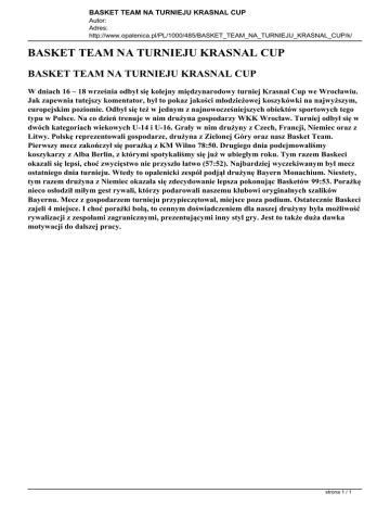 BASKET TEAM NA TURNIEJU KRASNAL CUP Autor: Adres: http://www.opalenica.pl/PL/1000/485/BASKET_TEAM_NA_TURNIEJU_KRASNAL_CUP/k/ BASKET TEAM NA TURNIEJU KRASNAL CUP BASKET TEAM NA TURNIEJU KRASNAL CUP W dniach 16 – 18 września odbył się kolejny międzynarodowy turniej Krasnal Cup we Wrocławiu. Jak zapewnia tutejszy komentator, był to pokaz jakości młodzieżowej koszykówki na najwyższym, europejskim poziomie. Odbył się też w jednym z najnowocześniejszych obiektów sportowych tego typu w Polsce. Na co dzień trenuje w nim drużyna gospodarzy WKK Wrocław. Turniej odbył się w dwóch kategoriach wiekowych U-14 i U-16. Grały w nim drużyny z Czech, Francji, Niemiec oraz z Litwy. Polskę reprezentowali gospodarze, drużyna z Zielonej Góry oraz nasz Basket Team. Pierwszy mecz zakończył się porażką z KM Wilno 78:50. Drugiego dnia podejmowaliśmy koszykarzy z Alba Berlin, z którymi spotykaliśmy się już w ubiegłym roku. Tym razem Baskeci okazali się lepsi, choć zwycięstwo nie przyszło łatwo (57:52). Najbardziej wyczekiwanym był mecz ostatniego dnia turnieju. Wtedy to opalenicki zespół podjął drużynę Bayern Monachium. Niestety, tym razem drużyna z Niemiec okazała się zdecydowanie lepsza pokonując Basketów 99:53. Porażkę nieco osłodził miłym gest rywali, którzy podarowali naszemu klubowi oryginalnych szalików Bayernu. Mecz z gospodarzem turnieju przypieczętował, miejsce poza podium. Ostatecznie Baskeci zajeli 4 miejsce. I choć porażki bolą, to cennym doświadczeniem dla naszej drużyny była możliwość rywalizacji z zespołami zagranicznymi, prezentującymi inny styl gry. Jest to także duża dawka motywacji do dalszej pracy. strona 1 / 1 Powered by TCPDF (www.tcpdf.org)